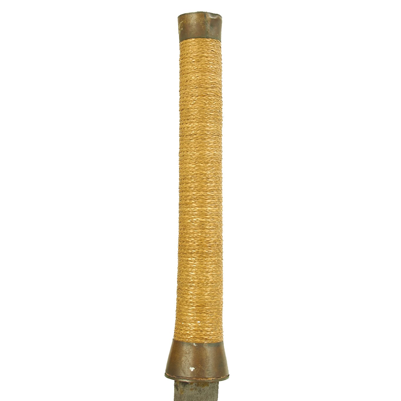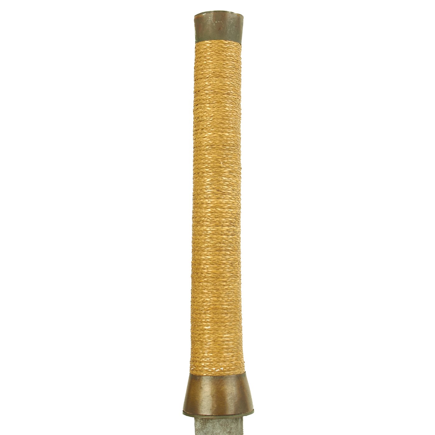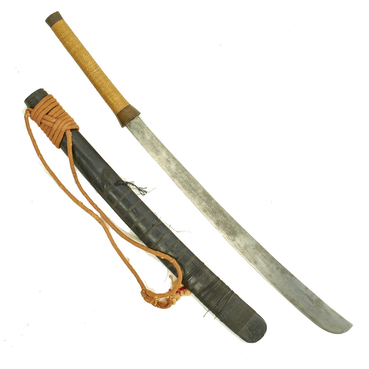 The sword is a typical Vietnamese style Saber, with a slightly curved single edged blade, and a nice wicker grip. It is still somewhat sharp, and is contained in a nice wooden scabbard, which is held together by multiple wrappings of string. There is cord wrapped around the end, intended to tie around the waist. It is in very good condition, though the scabbard wrapping is loose, and it is starting to come apart.