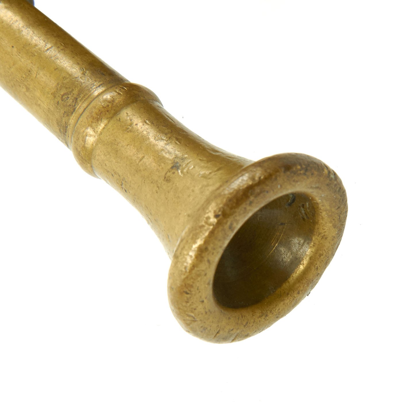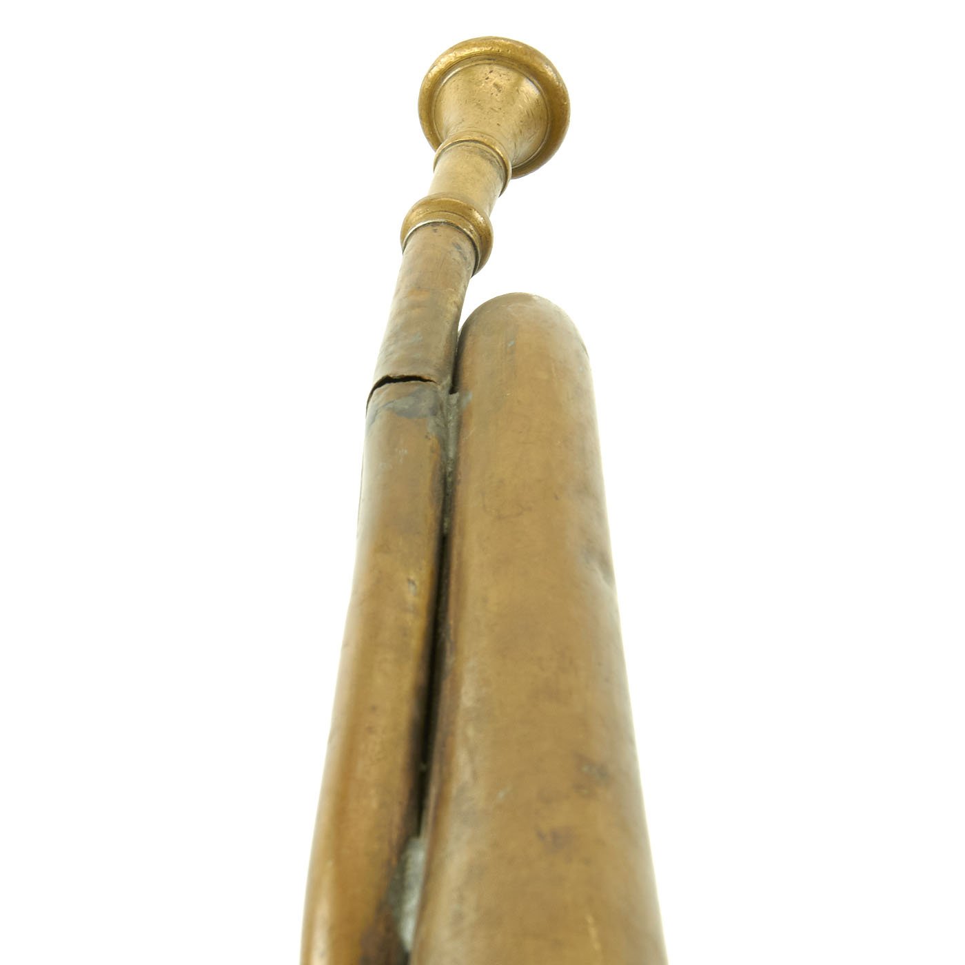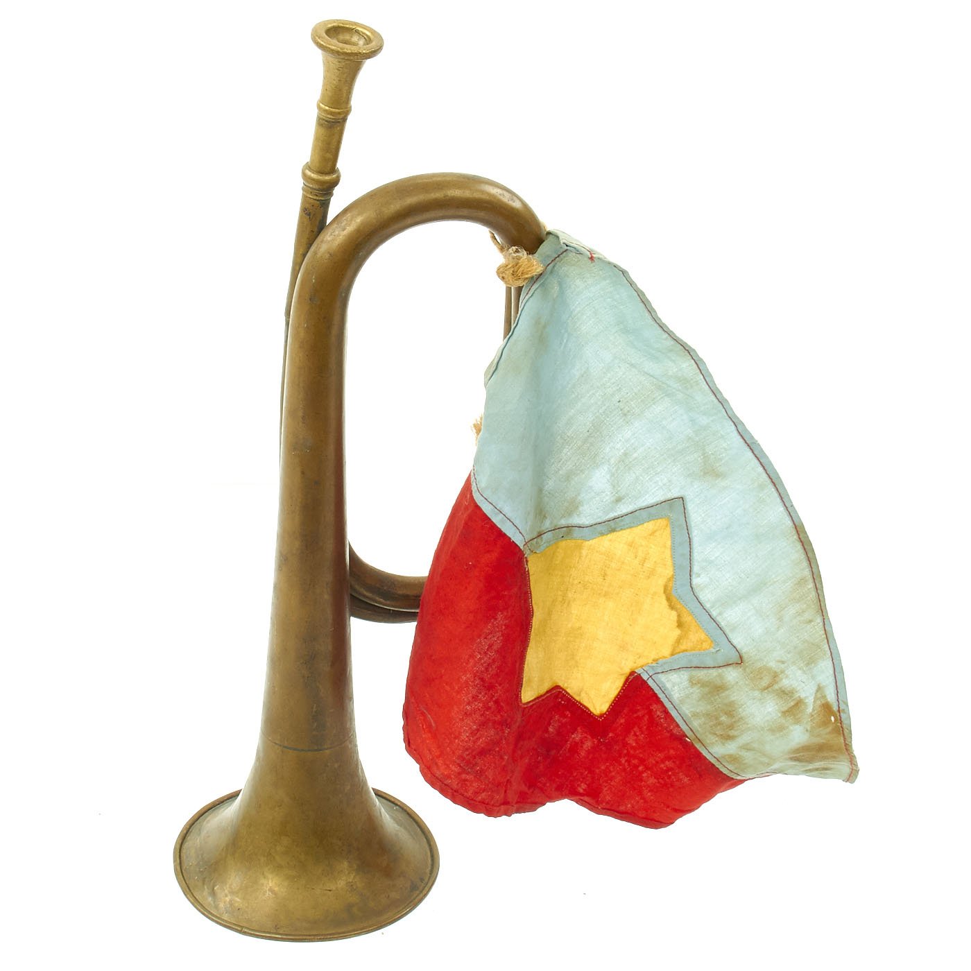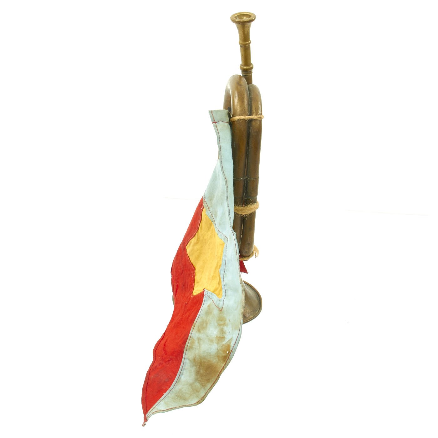 This is a very nice USGI Bring back NVA / VC brass bugle or field trumpet, with a North Vietnamese pennant flag tied to the bottom with twine. The bugle is in good condition, though it is cracked right through the entire tube about two inches from the mouthpiece receiver. It does not appear to have been of very high quality brass, which explains how easily it was broken. Braze seams can be seen on various areas, so this was made from sheet brass.