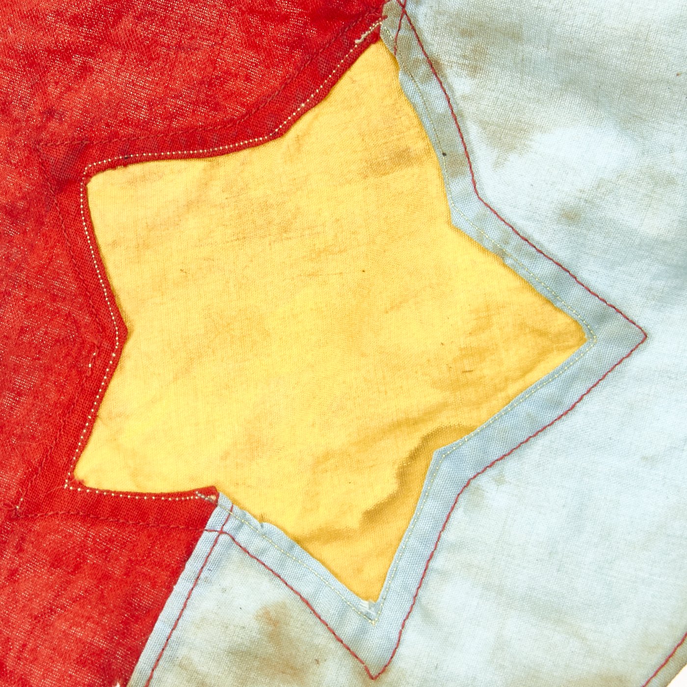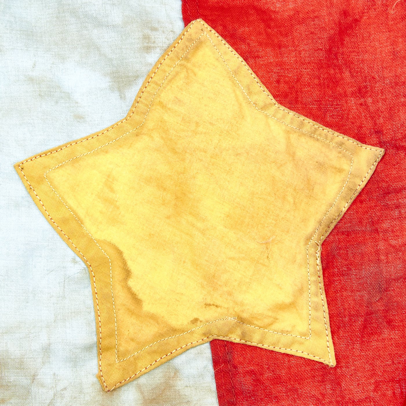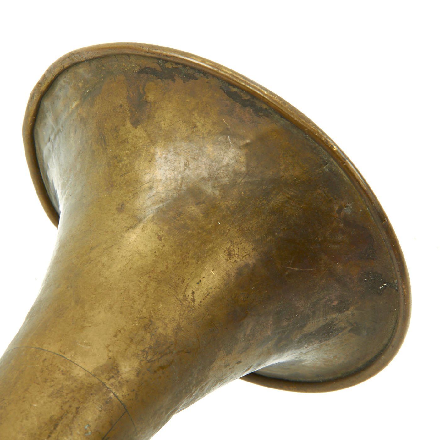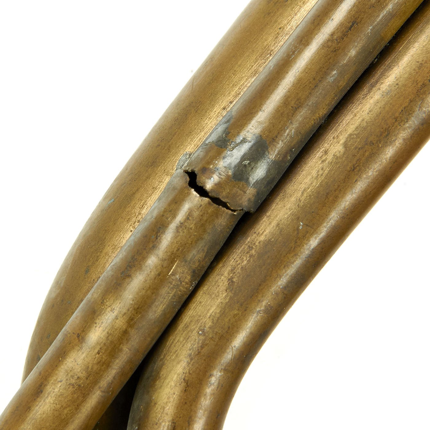 This is a very nice USGI Bring back NVA / VC brass bugle or field trumpet, with a North Vietnamese pennant flag tied to the bottom with twine. The bugle is in good condition, though it is cracked right through the entire tube about two inches from the mouthpiece receiver. It does not appear to have been of very high quality brass, which explains how easily it was broken. Braze seams can be seen on various areas, so this was made from sheet brass.
