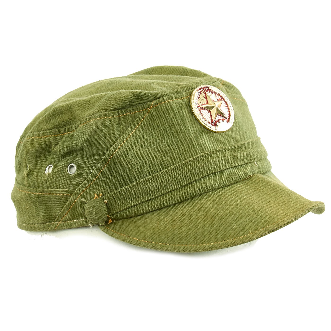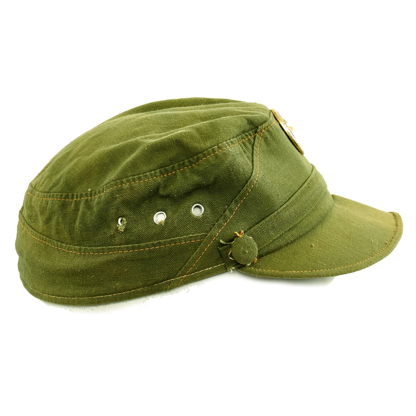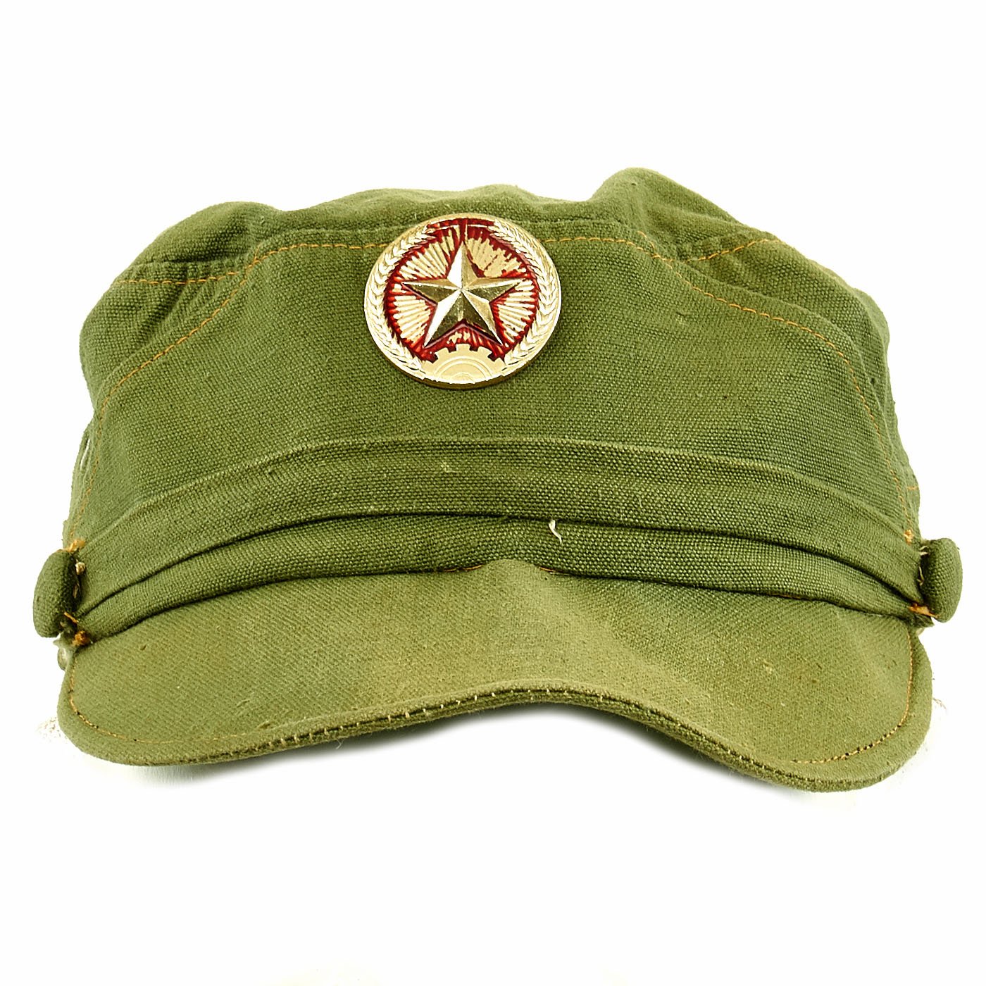 Original Items: Only One Available. This is a very nice USGI Bring back North Vietnamese Army peaked field cap, made from heavy OD Green Twill Cotton. It features a fabric decorative "chinstrap" held in place by two fabric covered buttons. The front of the cap is stiffened and it has a painted metal badge for the People's Army of Vietnam, attached by a small nut in the back. The red paint on the badge has unfortunately mostly flaked away, as shown. The sides of the cap, which are constructed in four pieces, bear the correct three aluminum ventilation eyelets on each side.