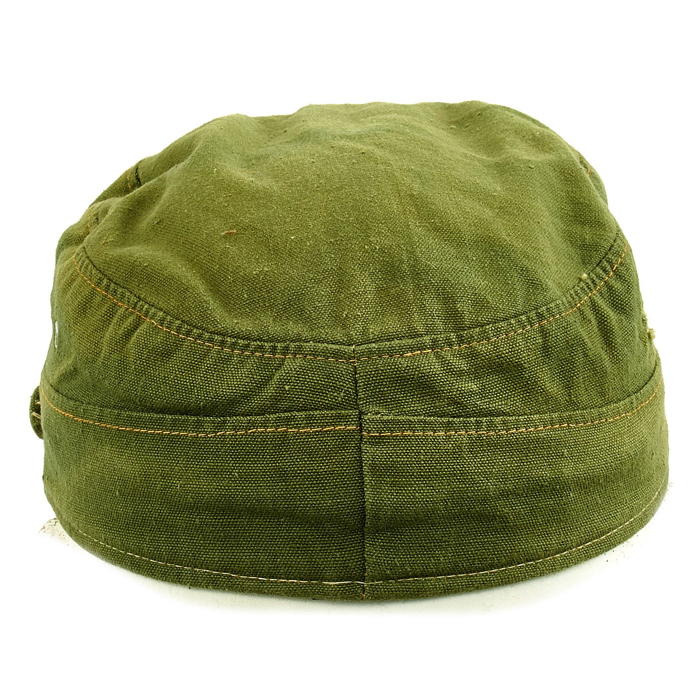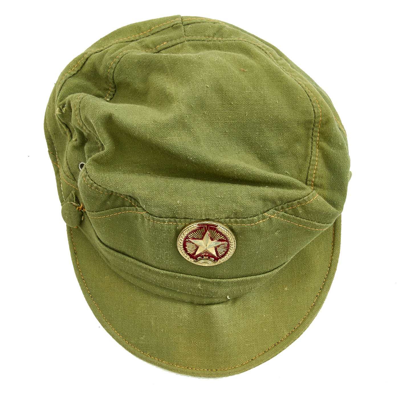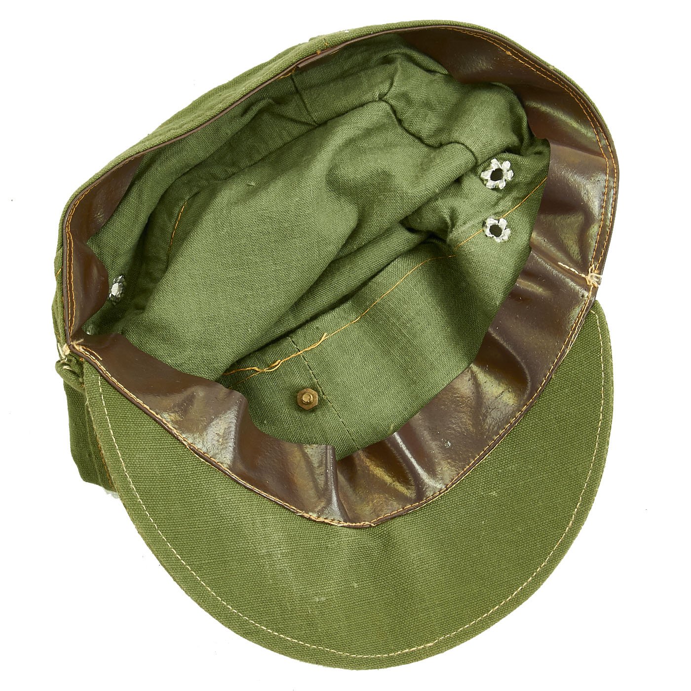 Original Items: Only One Available. This is a very nice USGI Bring back North Vietnamese Army peaked field cap, made from heavy OD Green Twill Cotton. It features a fabric decorative "chinstrap" held in place by two fabric covered buttons. The front of the cap is stiffened and it has a painted metal badge for the People's Army of Vietnam, attached by a small nut in the back. The red paint on the badge has unfortunately mostly flaked away, as shown. The sides of the cap, which are constructed in four pieces, bear the correct three aluminum ventilation eyelets on each side.