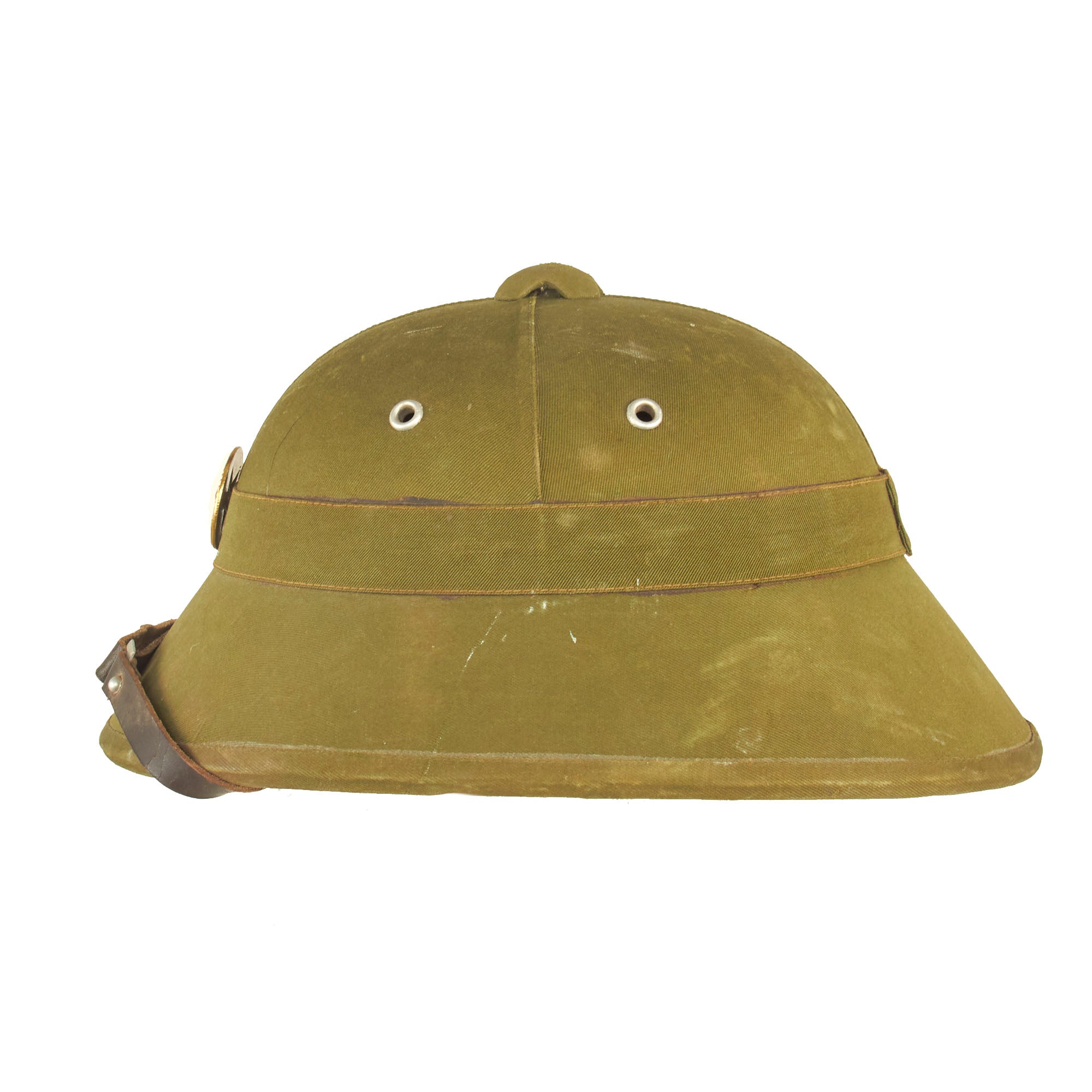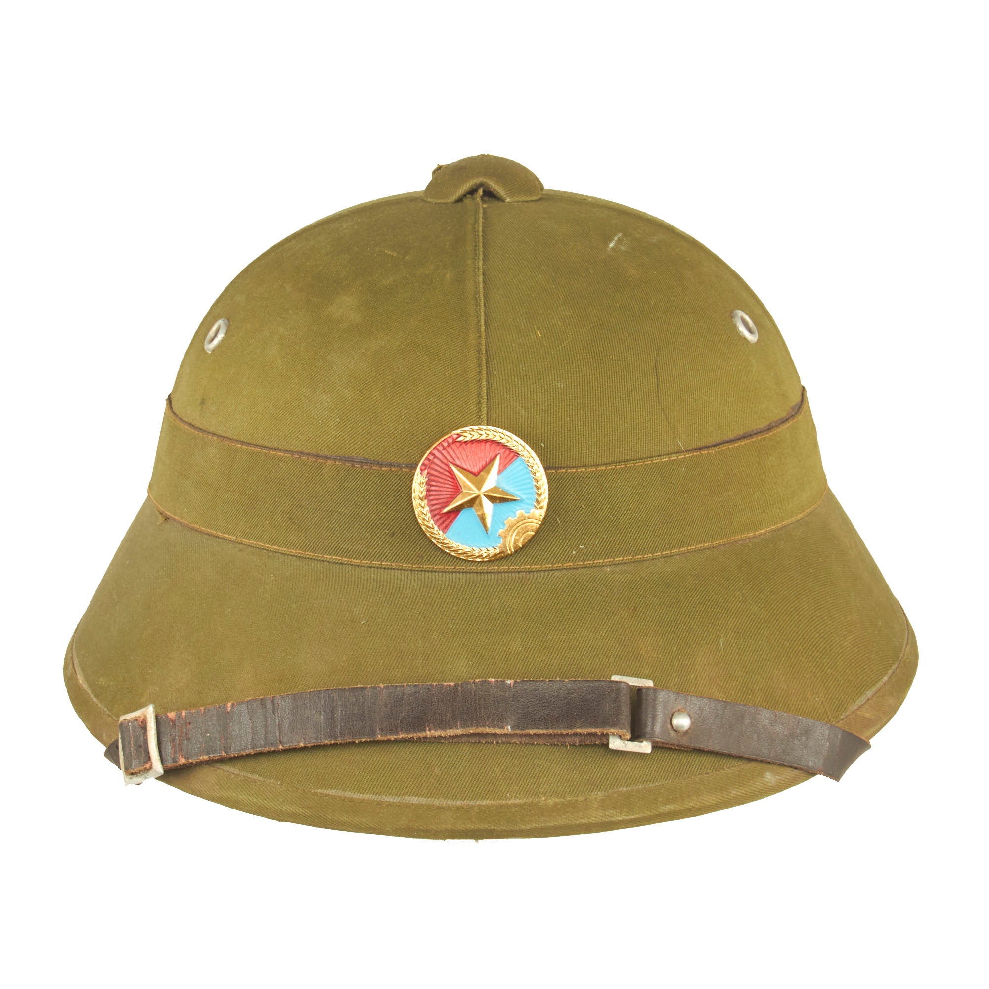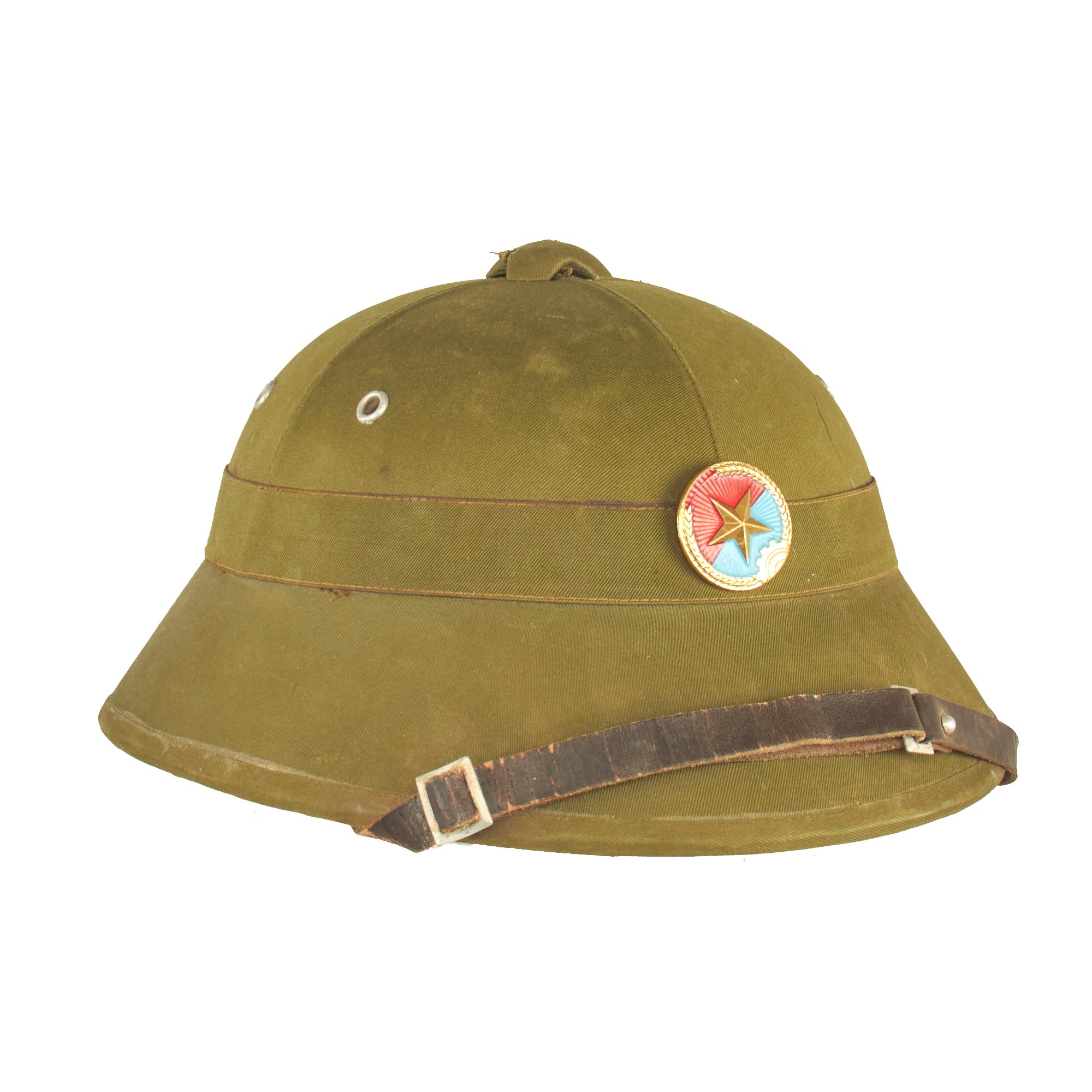 Original Item: Only One Available. This is a great example of a correct Wartime configuration Vietnam War North Vietnamese Army (NVA) Issue Sun (or Pith) Helmet. These re gotten increasingly hard to find over the last few years, as the market is mostly flooded with post-1975 versions! This helmet has all the correct features of a Mid-Late 1960’s issue helmet; “High Dome” profile, leather chinstrap, and Green Painted Pink Fiber Suspension. The badge is a Viet Cong, or National Liberation Front (NLF) Badge made of cast aluminum with a screw back, which dates to the early 1970s. Vietnam War Viet Cong National Liberation Front (NLF) pith helmet with a NLF metal helmet badge offered in very good complete condition.