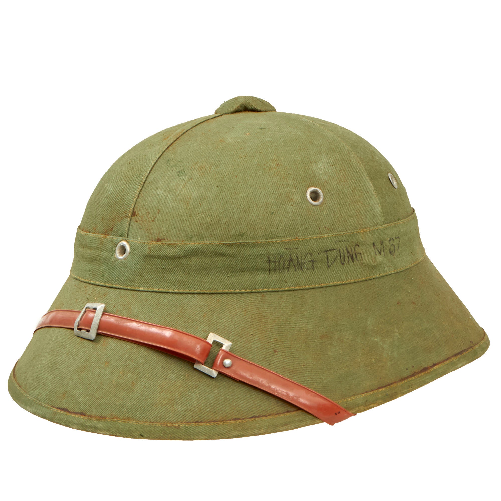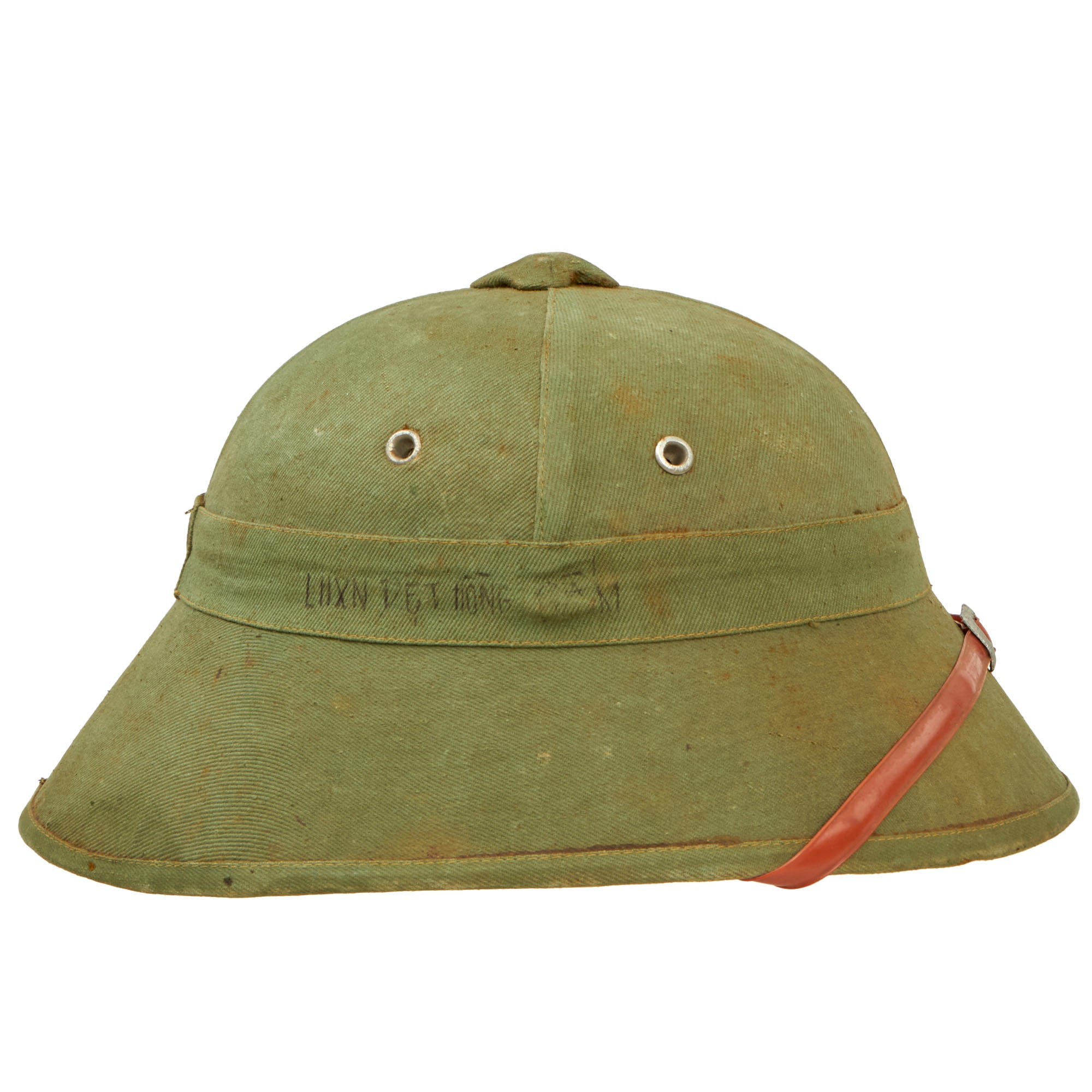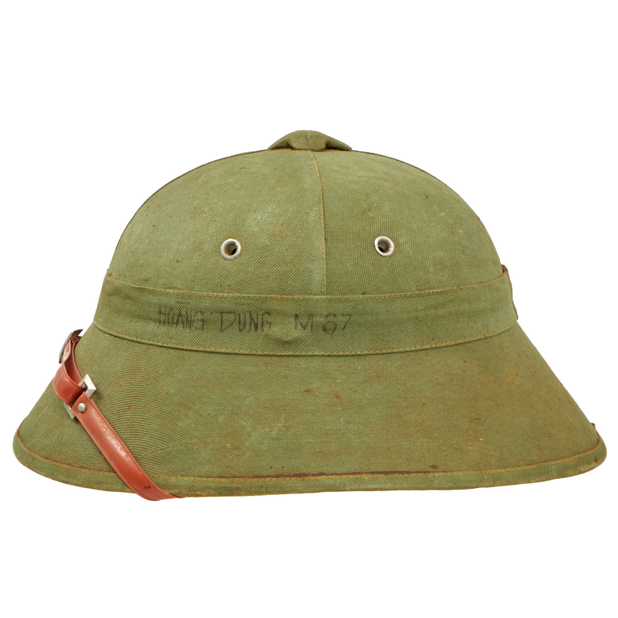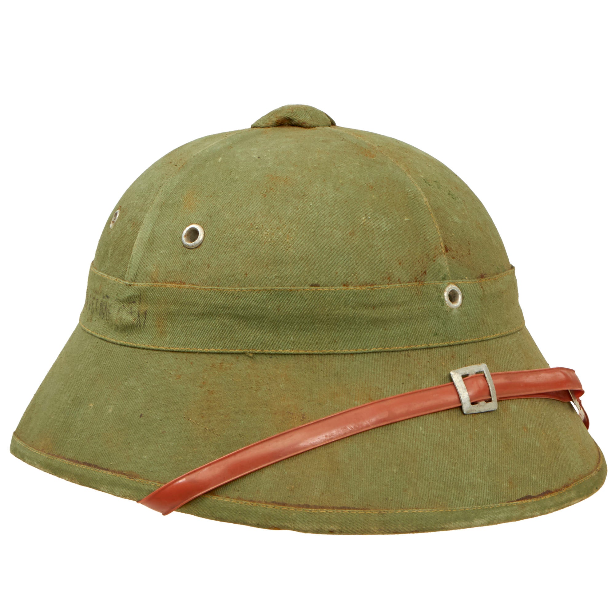 Original Item: Only One Available. This is a great example of a correct Wartime configuration Vietnam War North Vietnamese Army (NVA) Issue Sun (or Pith) Helmet. These have gotten increasingly hard to find over the last few years, as the market is mostly flooded with post-1975 versions! This helmet has all the correct features of an early 1970’s issue helmet; “Low Dome” profile, vinyl type chinstrap, and Green Painted Pink Fiber Suspension. Unfortunately there is no badge on this example, nor does it appear to have ever been one which is common for late war production.