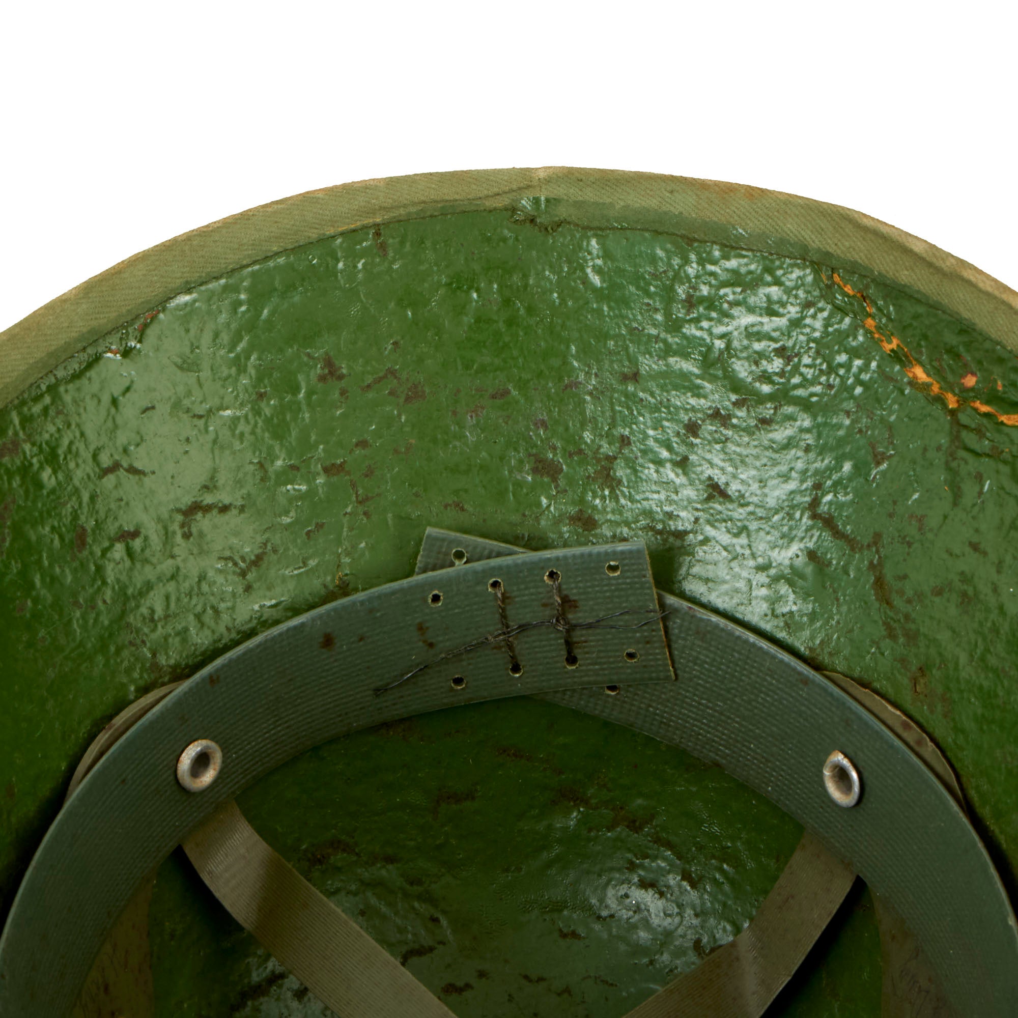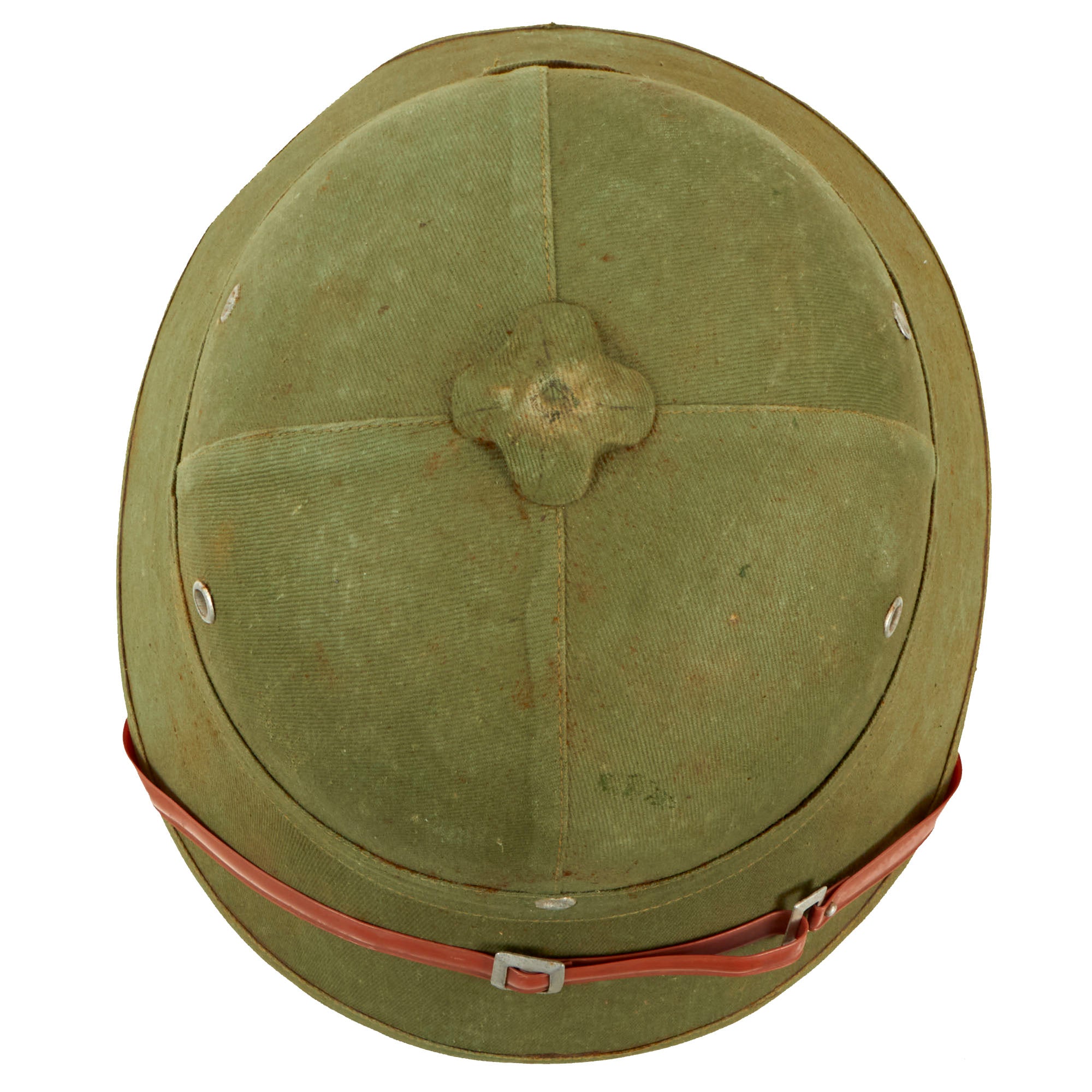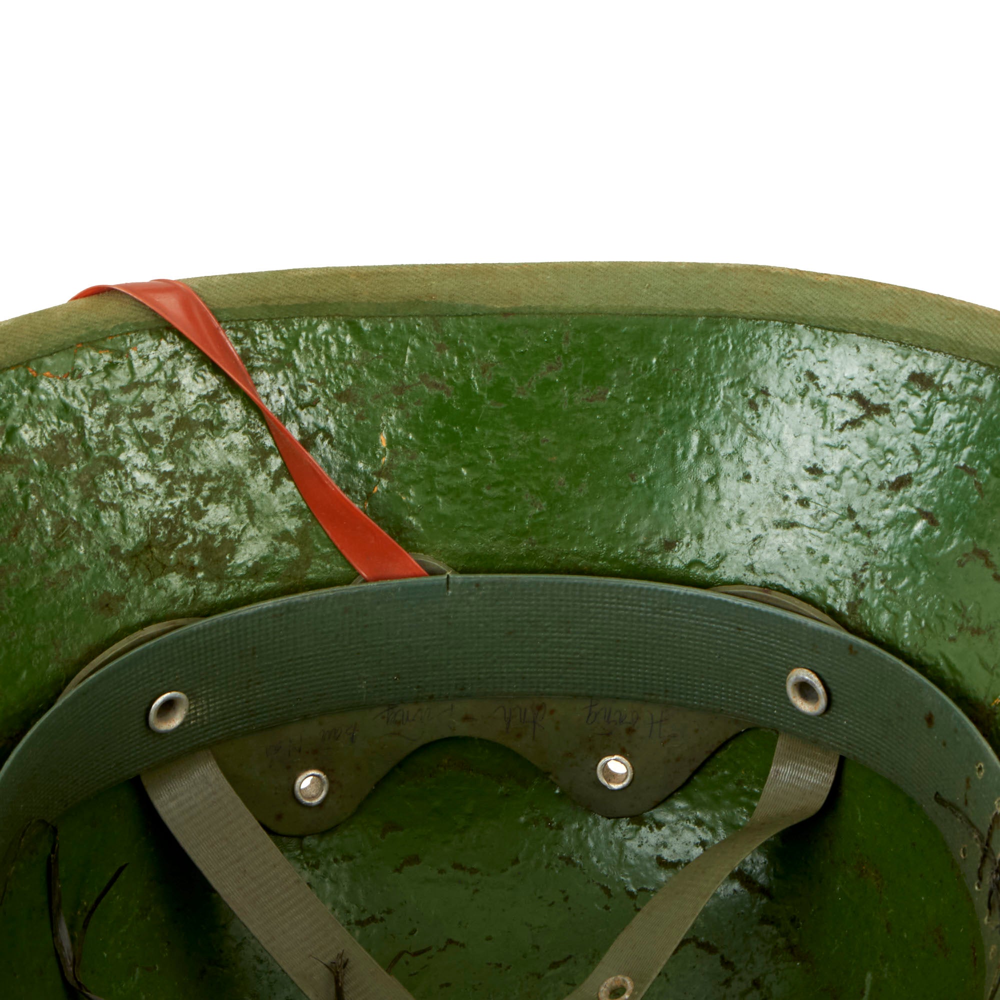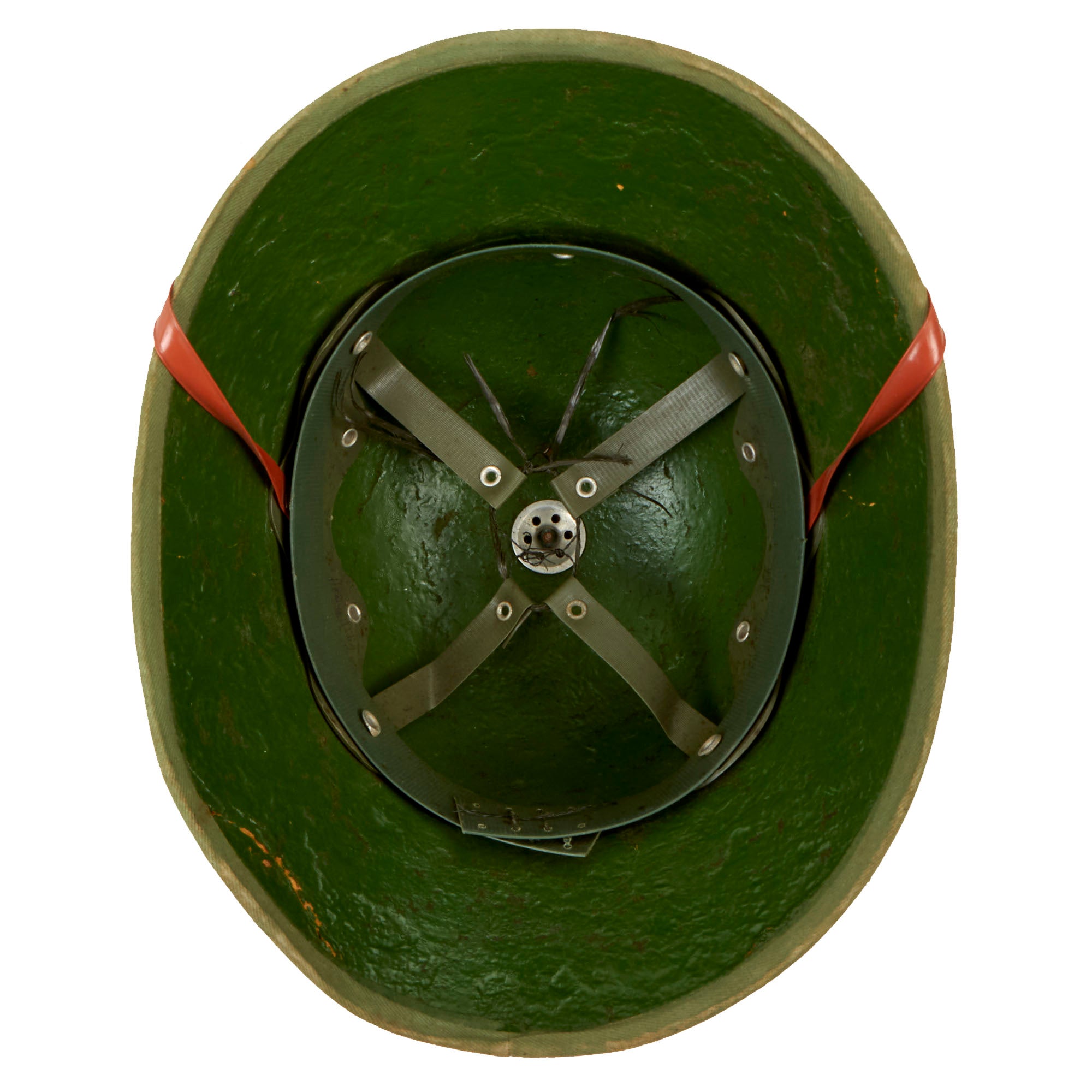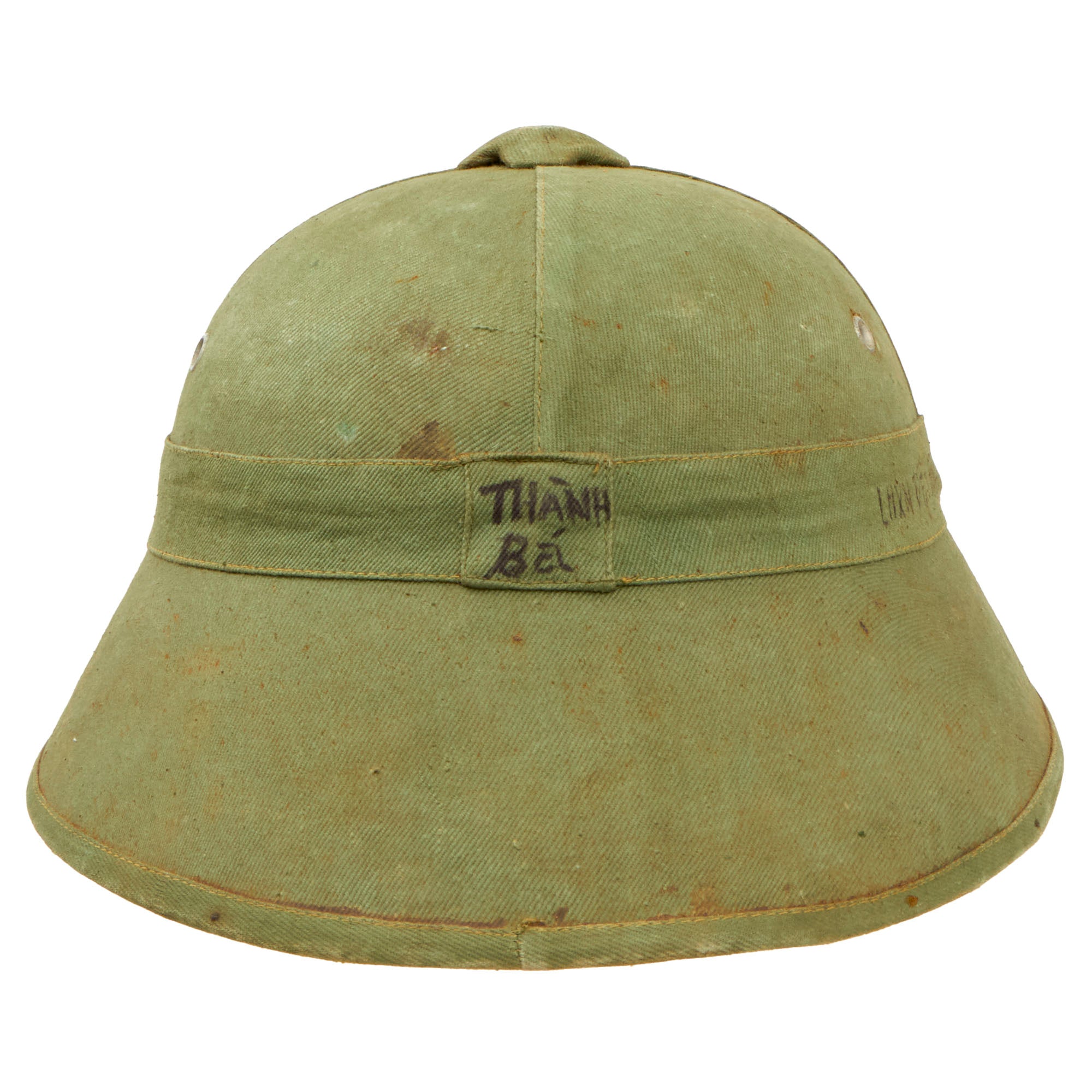 Original Item: Only One Available. This is a great example of a correct Wartime configuration Vietnam War North Vietnamese Army (NVA) Issue Sun (or Pith) Helmet. These have gotten increasingly hard to find over the last few years, as the market is mostly flooded with post-1975 versions! This helmet has all the correct features of an early 1970’s issue helmet; “Low Dome” profile, vinyl type chinstrap, and Green Painted Pink Fiber Suspension. Unfortunately there is no badge on this example, nor does it appear to have ever been one which is common for late war production.