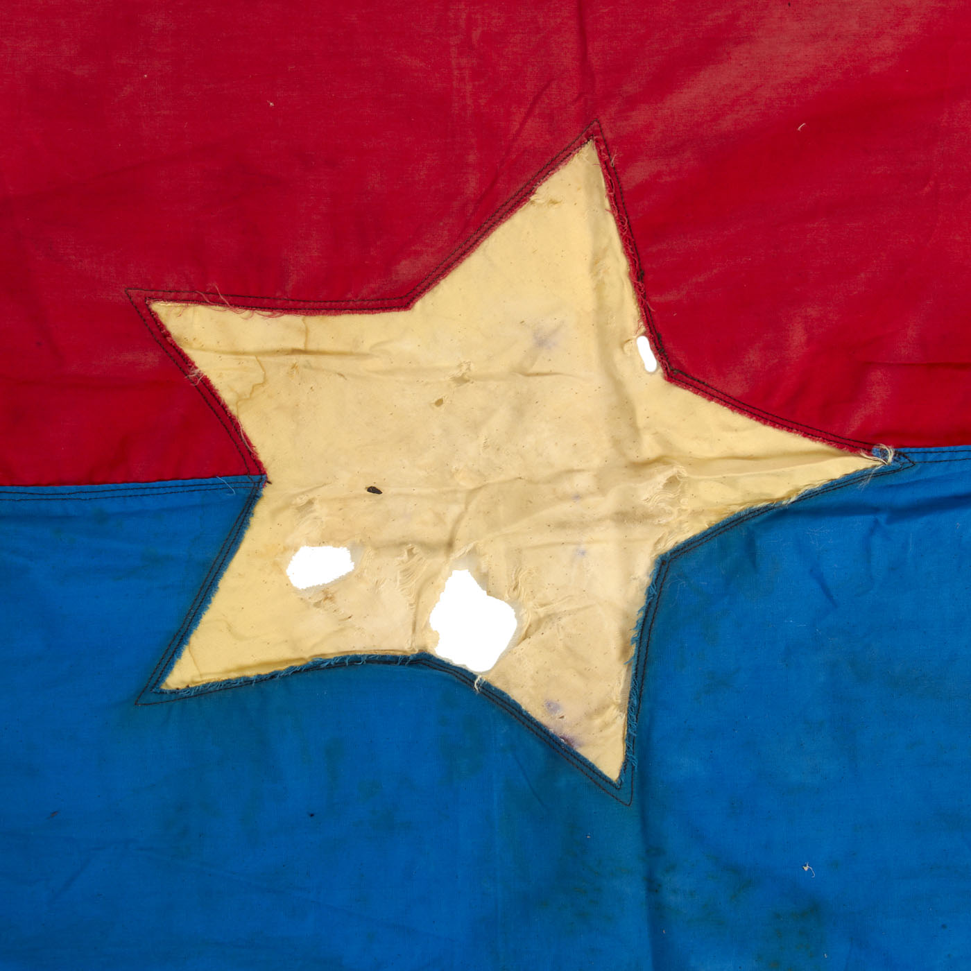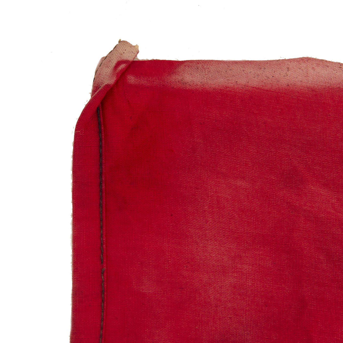 The flag is in very good condition, and looks like it was most likely captured before seeing much use. There are some small tears along the edge, and also some dark stains which look to be from grease or dirt. The stitching is still in great shape, with no pulling. The central star appears to have been made of parachute silk and felt victim to tearing. In the lower corner there is a capture date that reads as: