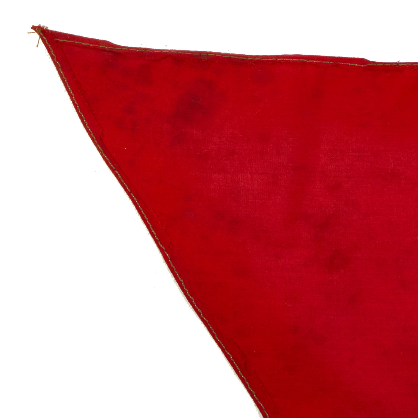 The flag is in very good condition, and looks like it was most likely captured before seeing much use. There are some small tears along the edge, and also some dark stains which look to be from grease or dirt. The stitching is still in great shape, with no pulling.