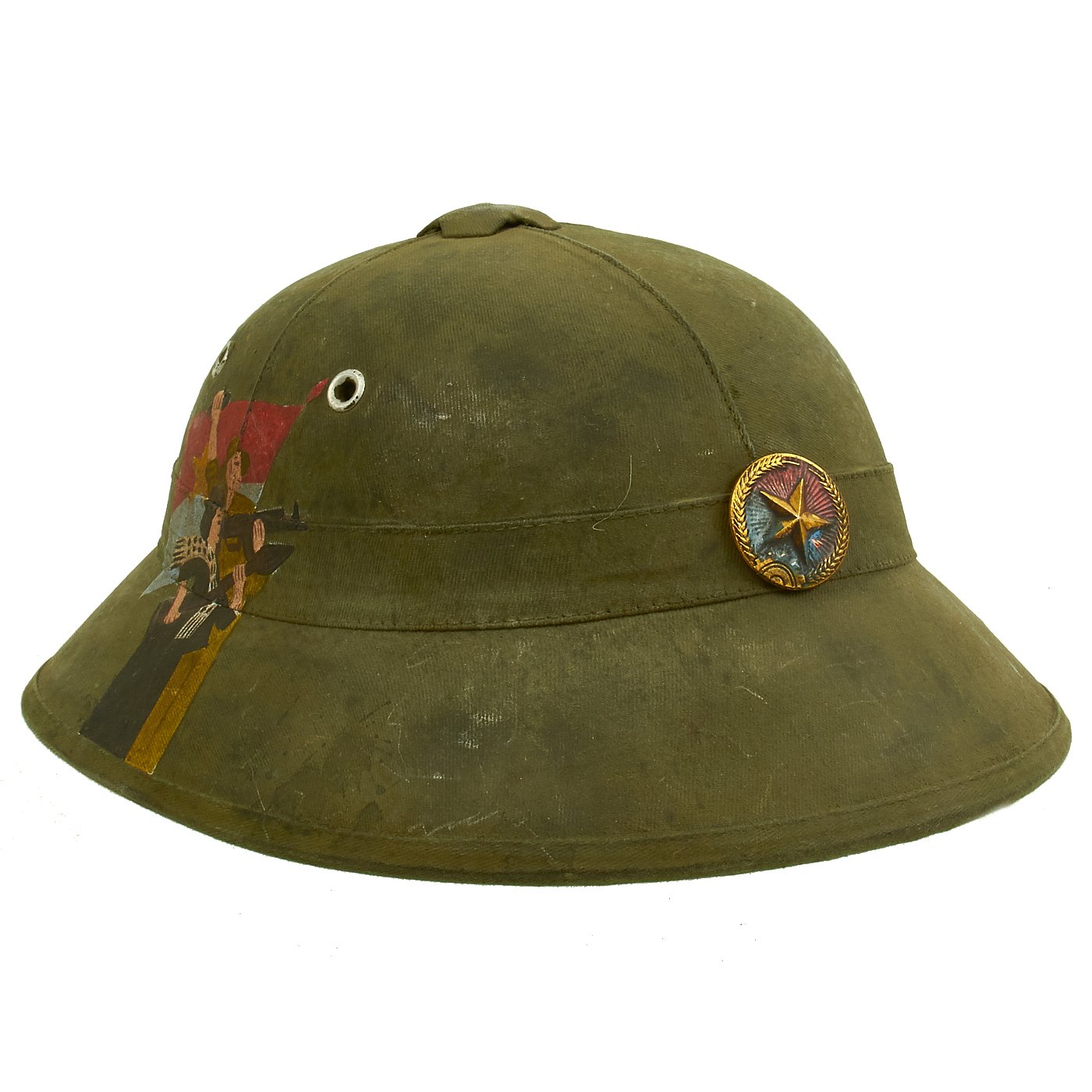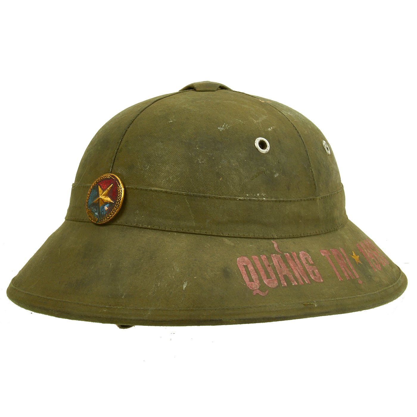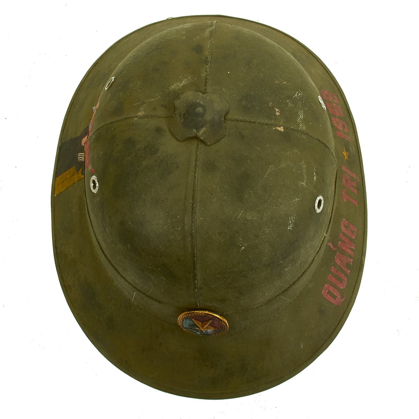 Original Item: One-of-a-kind. Vietnam War Viet Cong National Liberation Front (NLF) pith helmet with a NLF metal helmet badge. Painted on the right side of the helmet is the North Vietnamese Army Viet Cong Flag with an NVA soldier holding a machine gun and a woman holding a rocket launcher. One the opposite side it reads QUẢNG TRỊ 1969. Speculation surrounds helmets like this, as to whether it was truly done for a Vietnamese soldier or done after the war for tourists. Regardless the helmet itself is 100% original, the paint appears to us to be period and it is well worth the investment if only for a genuine example of an NVA pith helmet.