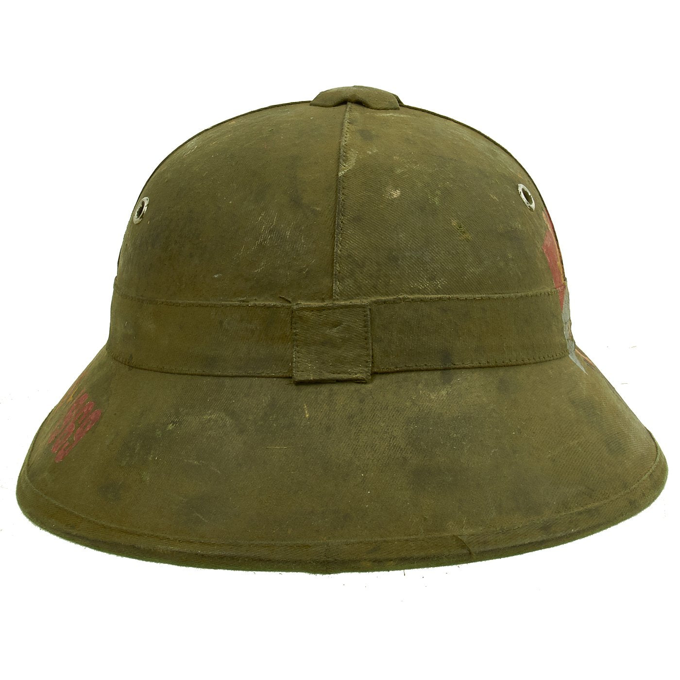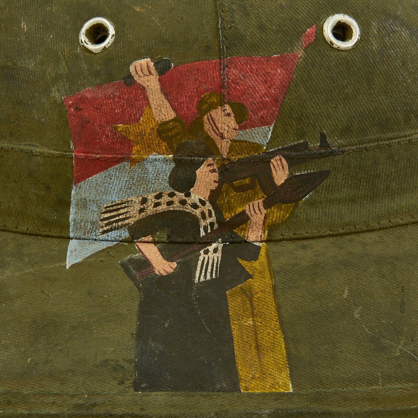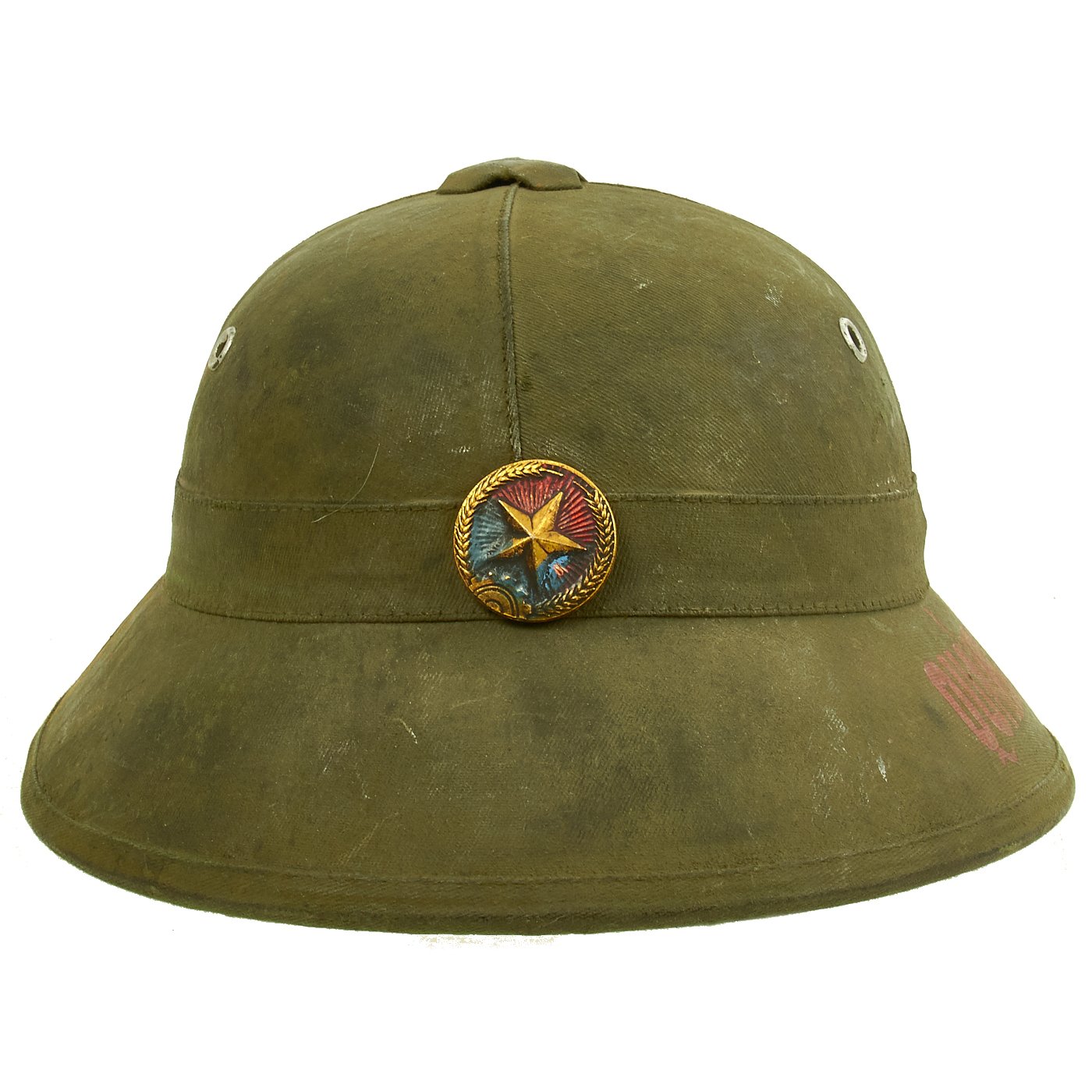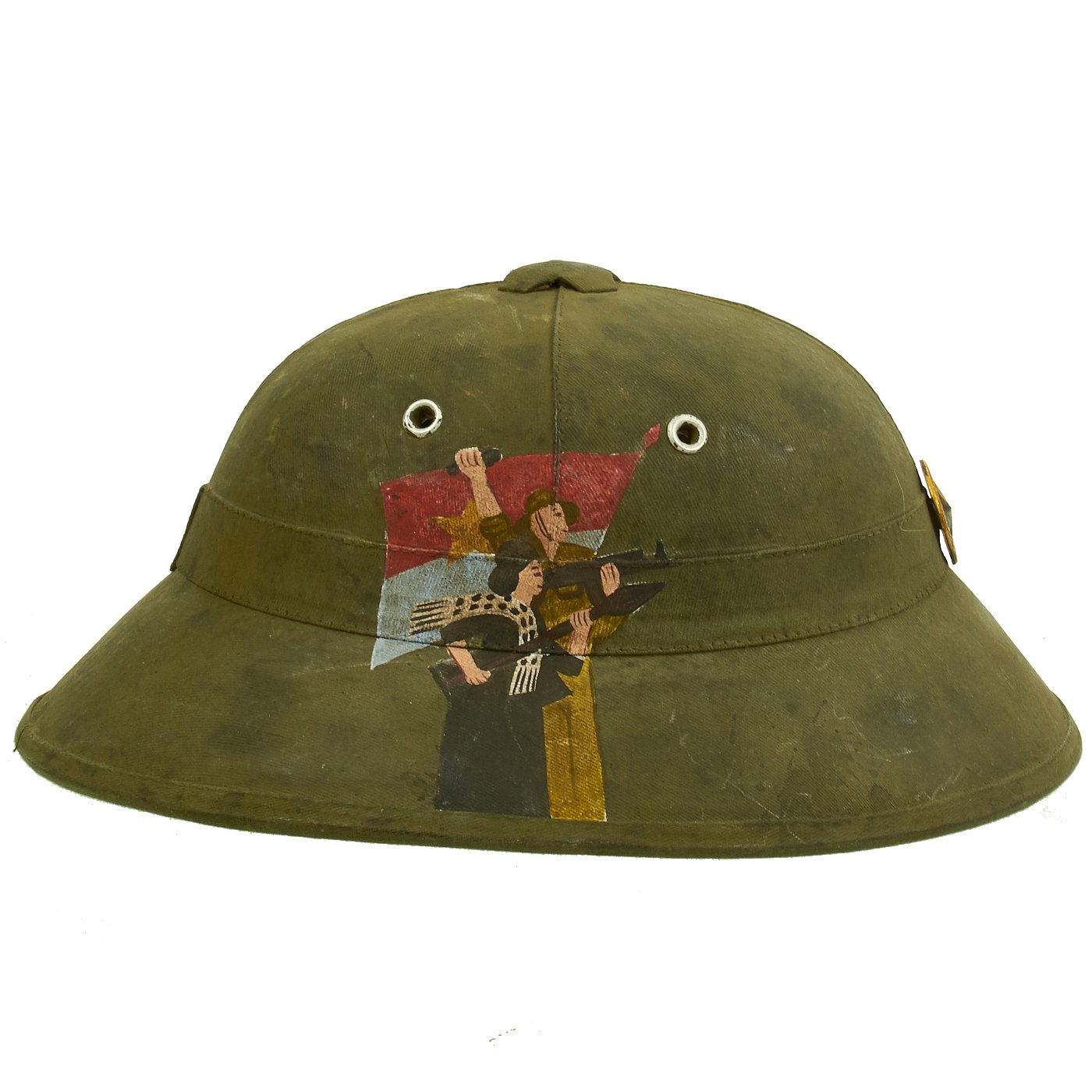 Original Item: One-of-a-kind. Vietnam War Viet Cong National Liberation Front (NLF) pith helmet with a NLF metal helmet badge. Painted on the right side of the helmet is the North Vietnamese Army Viet Cong Flag with an NVA soldier holding a machine gun and a woman holding a rocket launcher. One the opposite side it reads QUẢNG TRỊ 1969. Speculation surrounds helmets like this, as to whether it was truly done for a Vietnamese soldier or done after the war for tourists. Regardless the helmet itself is 100% original, the paint appears to us to be period and it is well worth the investment if only for a genuine example of an NVA pith helmet.