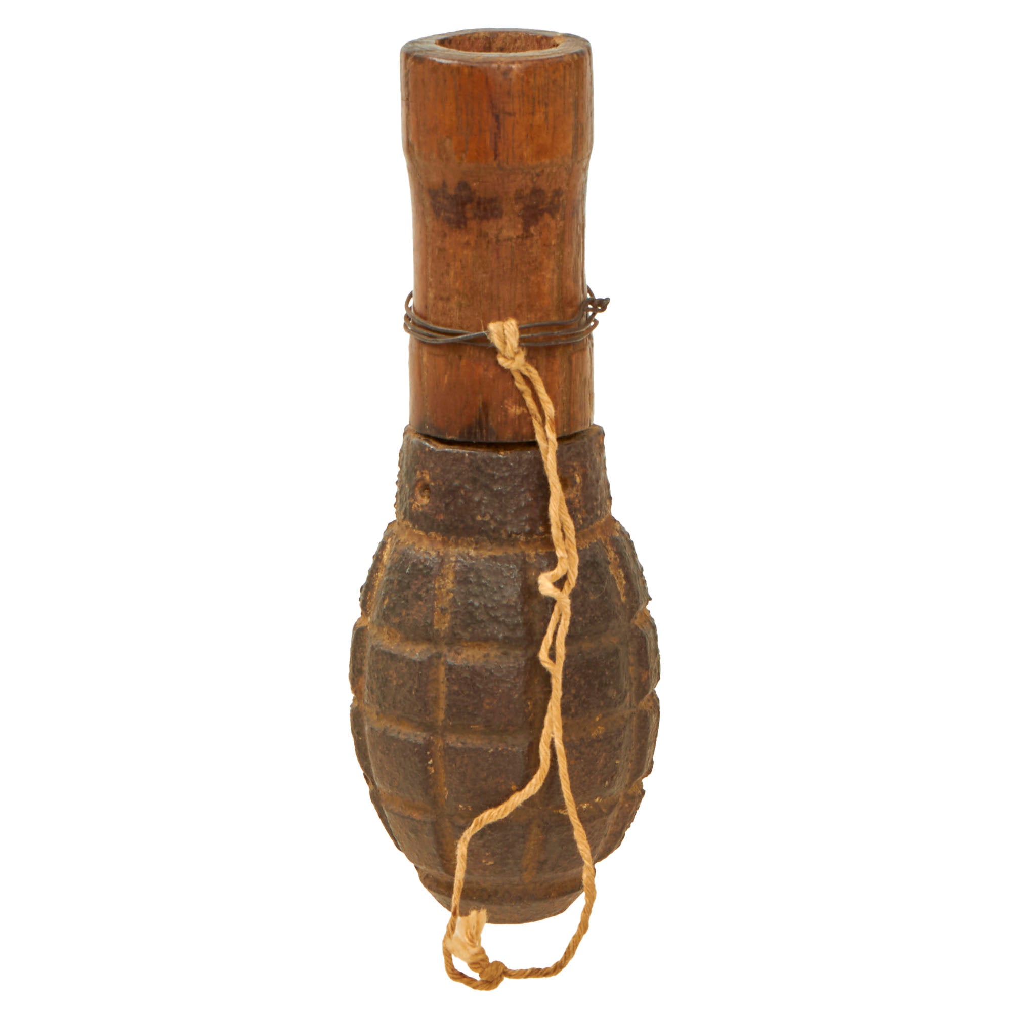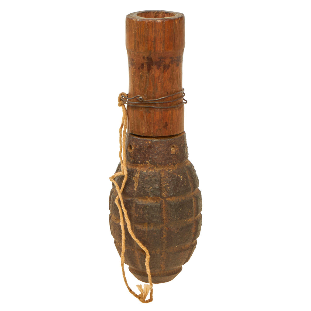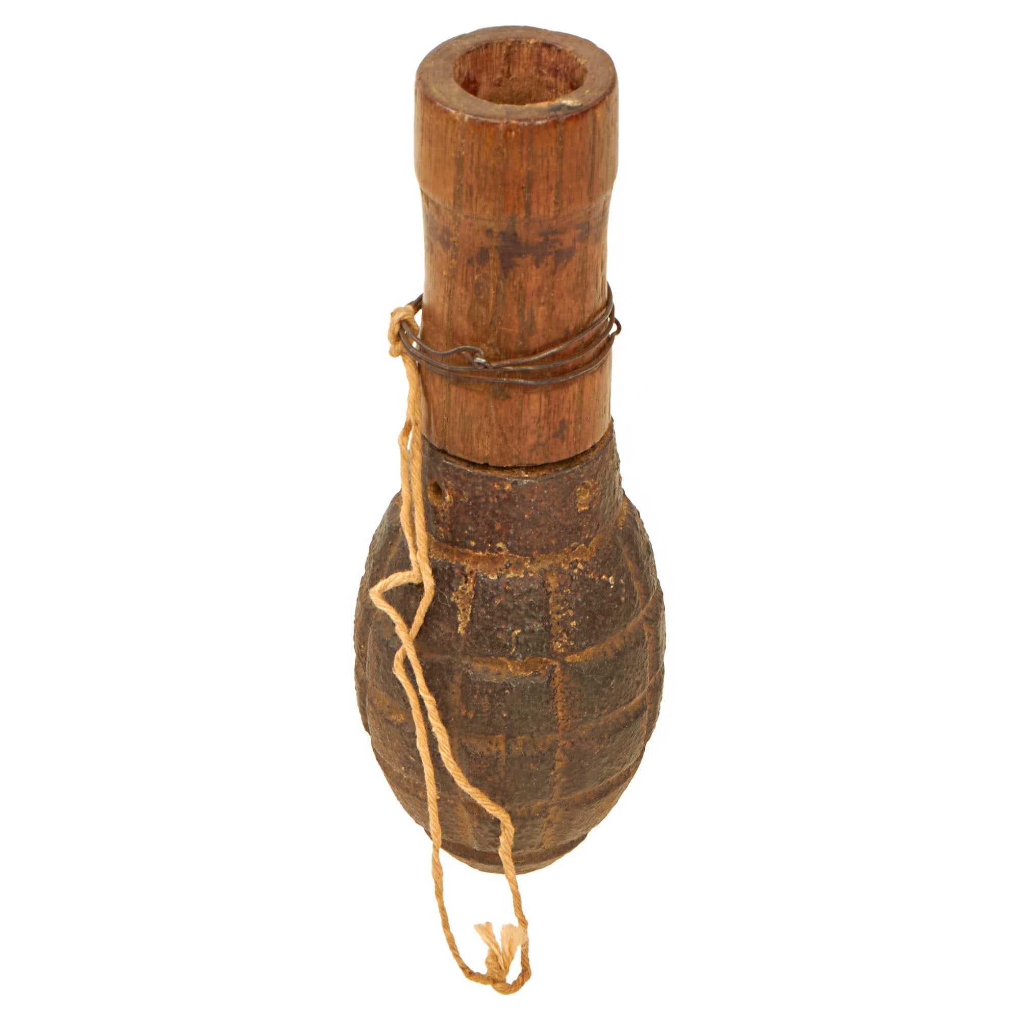 Original Item: Only One Available. This is a stellar Vietnam War NVA/VC issue grenade with the head being a pineapple style. The shaft is removable and the bottom cap of the grenade is missing, as is common with these. These are becoming increasingly more difficult to find. It also has wire still wrapped around the shaft with a small string attached. Like all deactivated ordnance, this grenade is Not Available for Export.