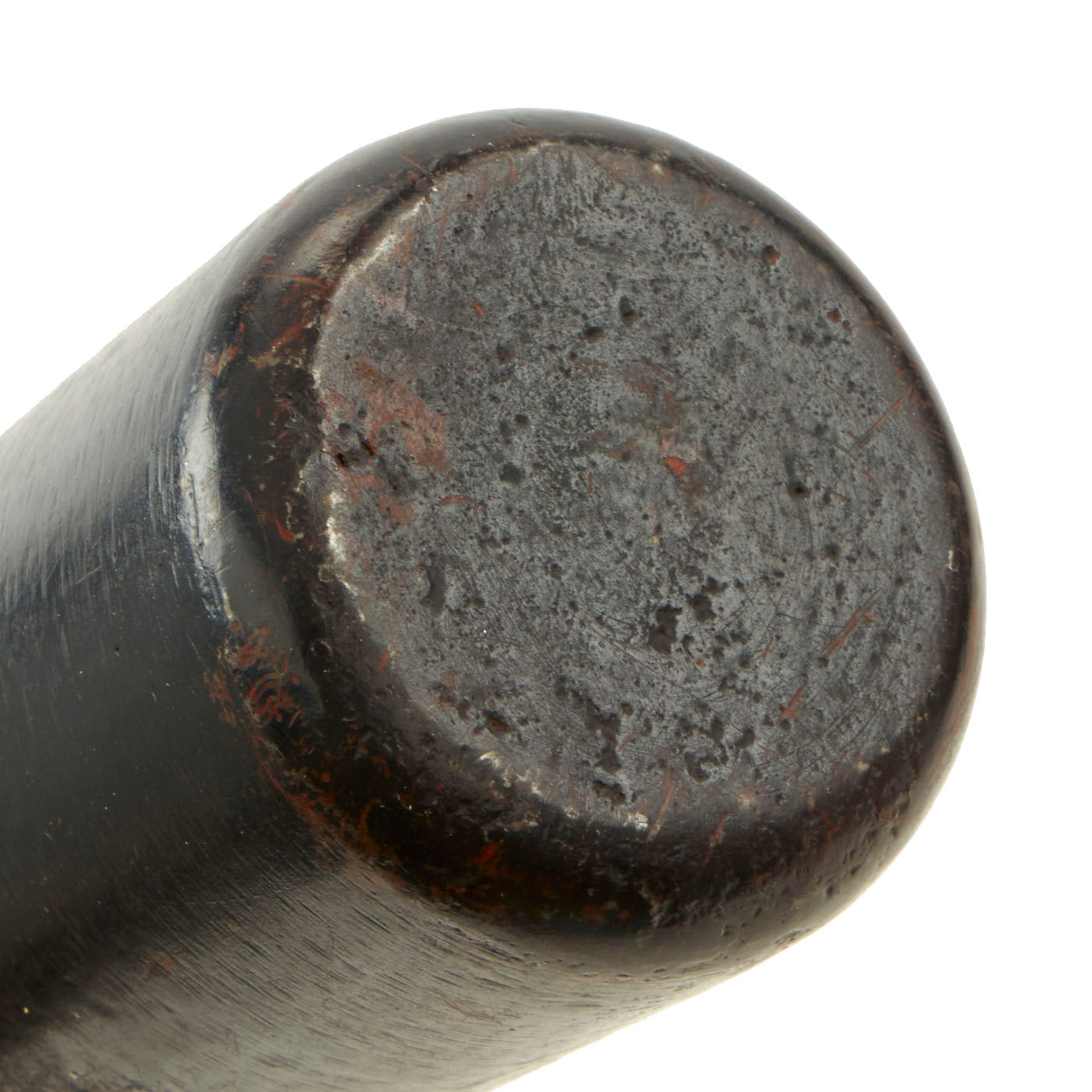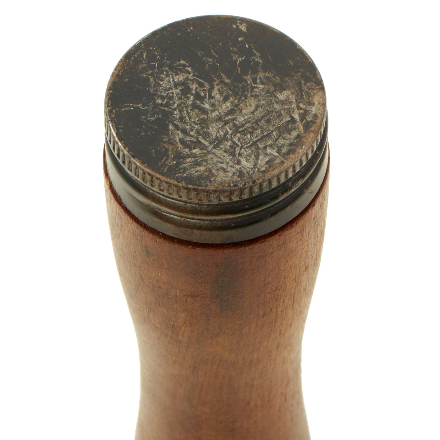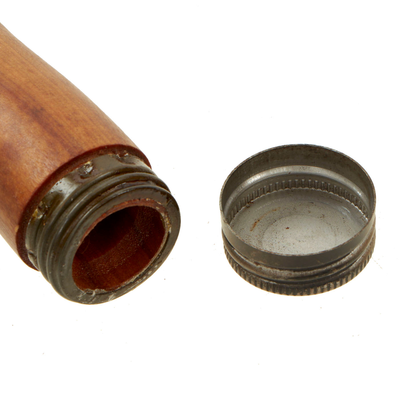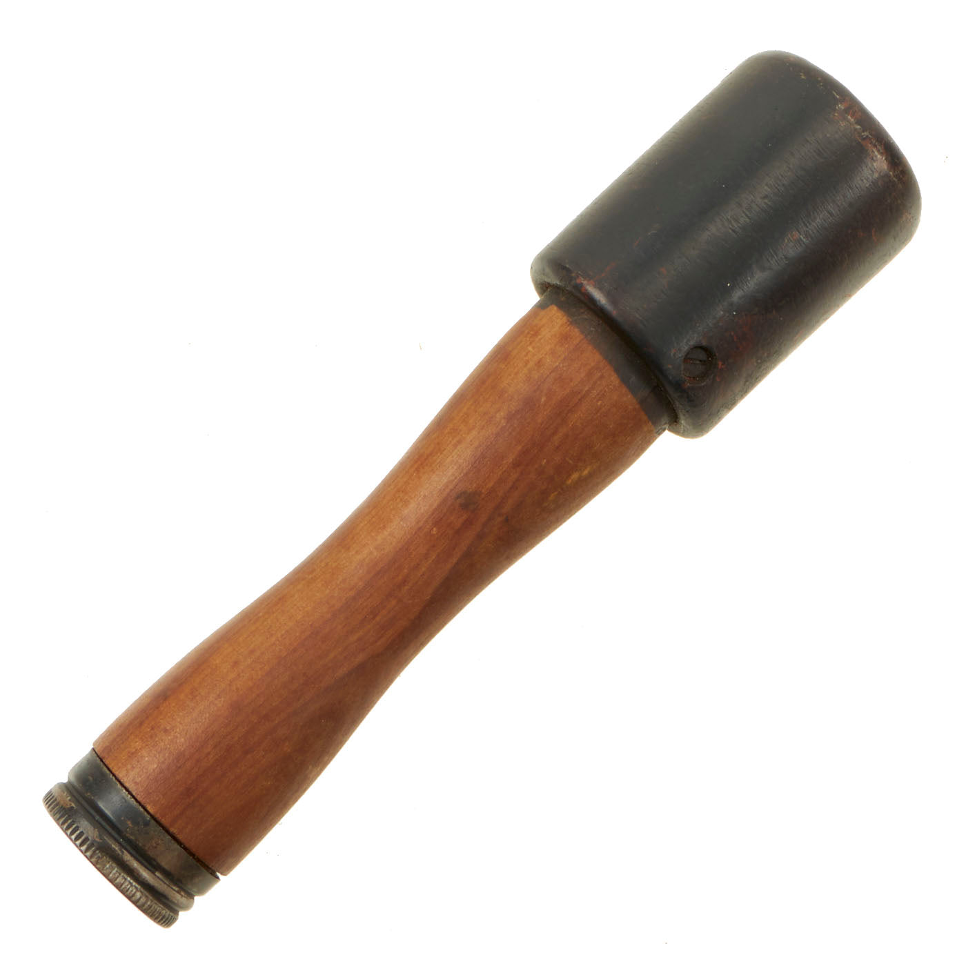 A standard of the Vietnam War, this is the typical pattern of NVA / VC long-handle smooth body stick grenade. Despite having EOD inert holes in the grenade body, the grenade is in fine to excellent condition, with both the body and stick very clean. The body is attached to the stick with nails, and the stick retains the wooden plug. Measures 8 3/4 inches in overall length.