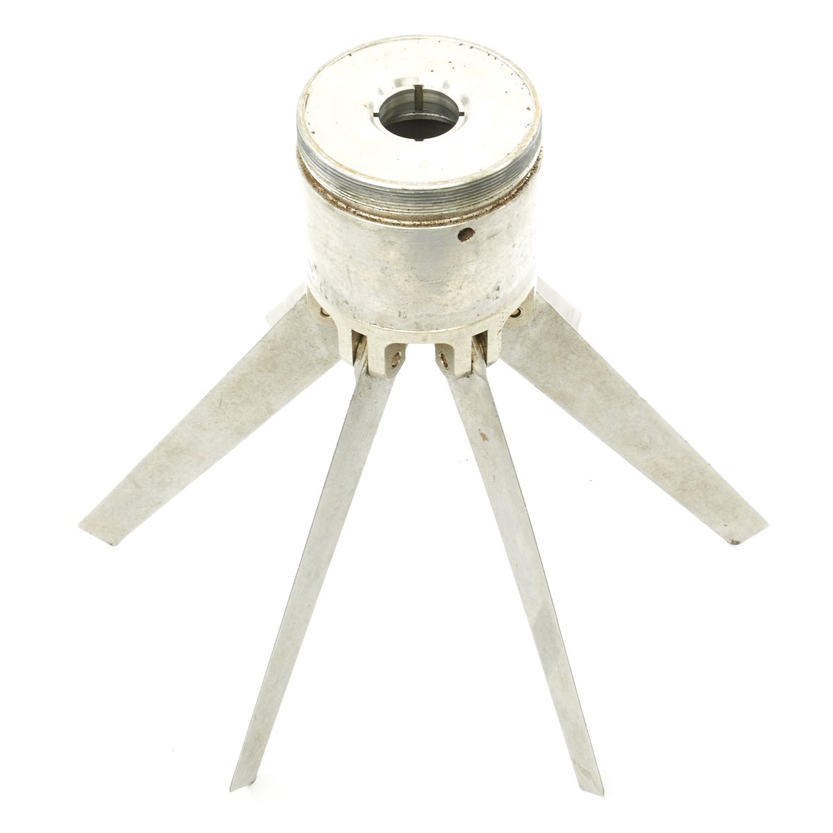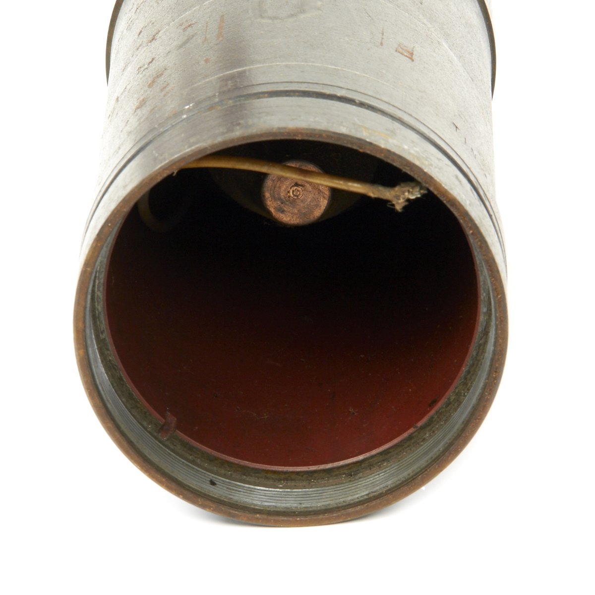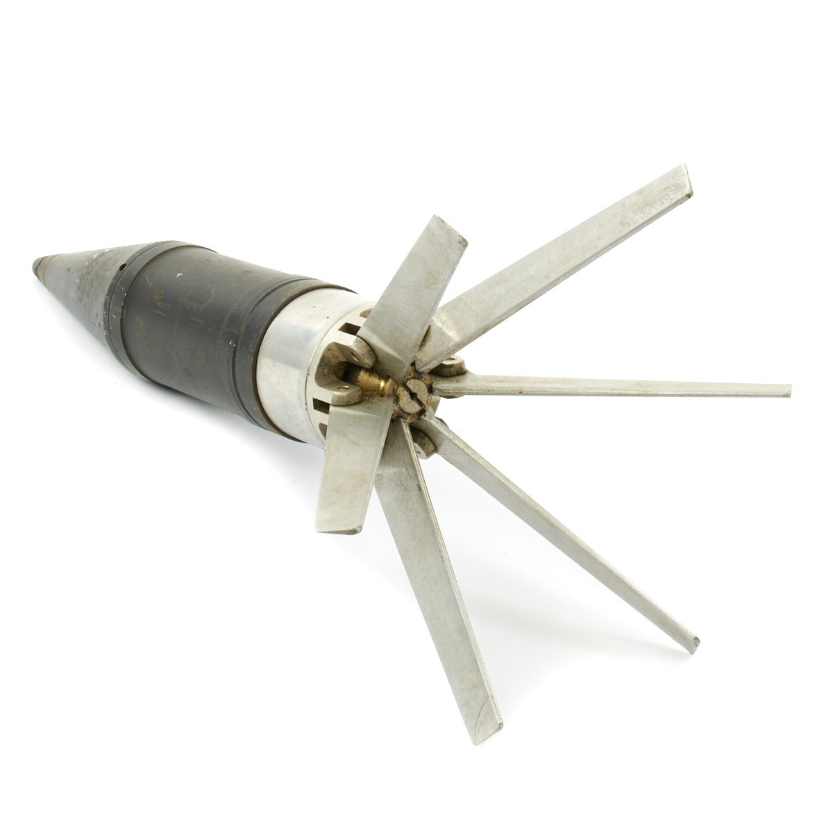 The fins still fold out, and the shell fits nicely into the perforated shell casing, made of the standard lacquered steel. The bottom of the shell unfortunately has had a bit of rust, so we cannot make out any of the markings clearly.