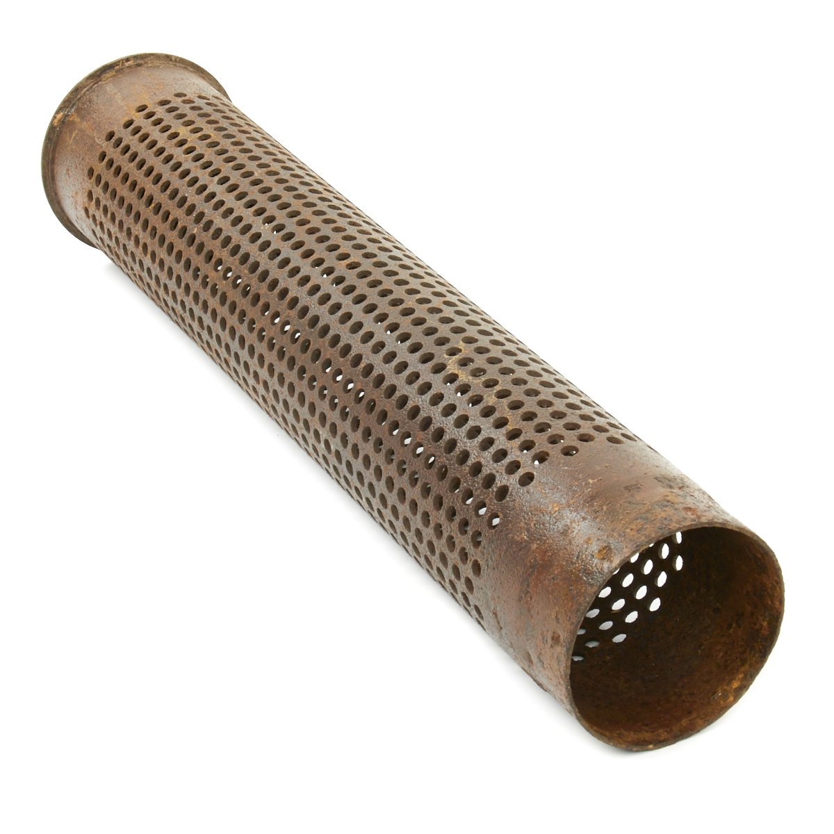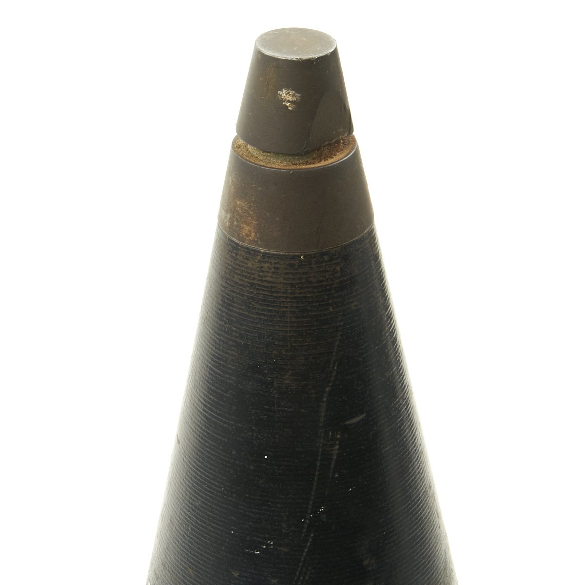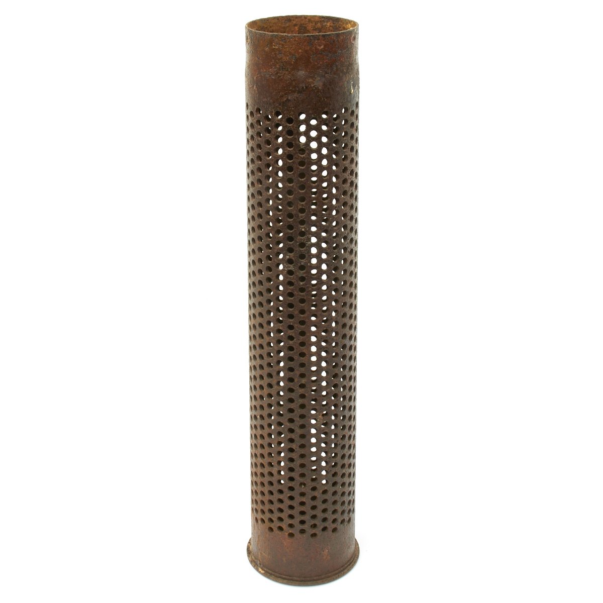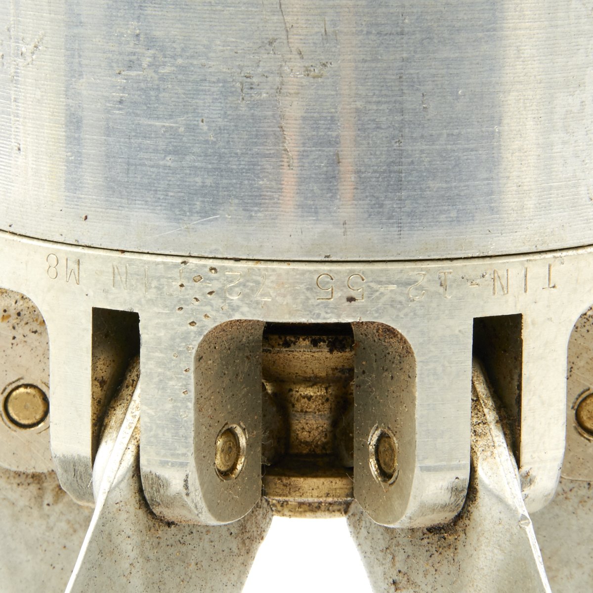 The fins still fold out, and the shell fits nicely into the perforated shell casing, made of the standard lacquered steel. The bottom of the shell unfortunately has had a bit of rust, so we cannot make out any of the markings clearly.