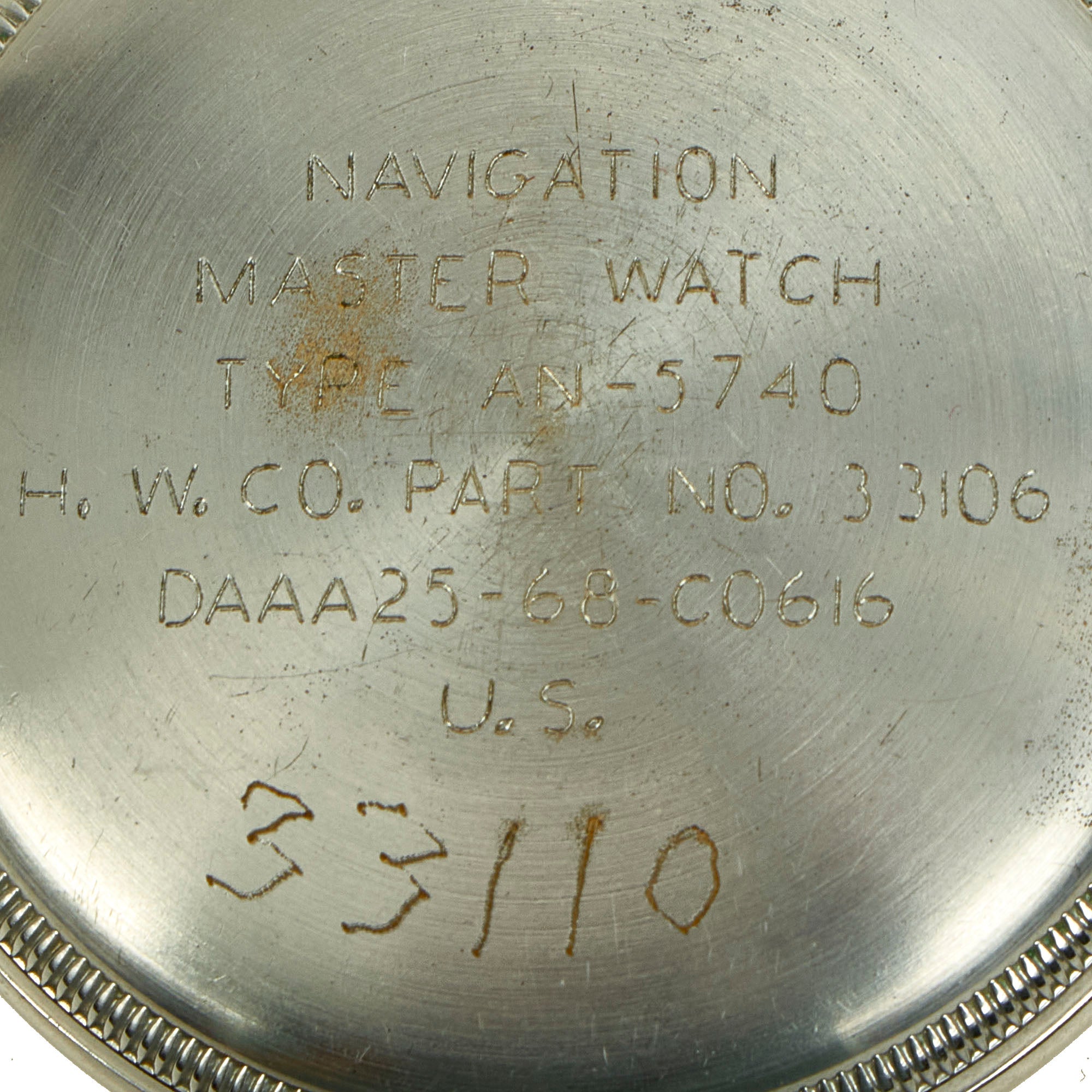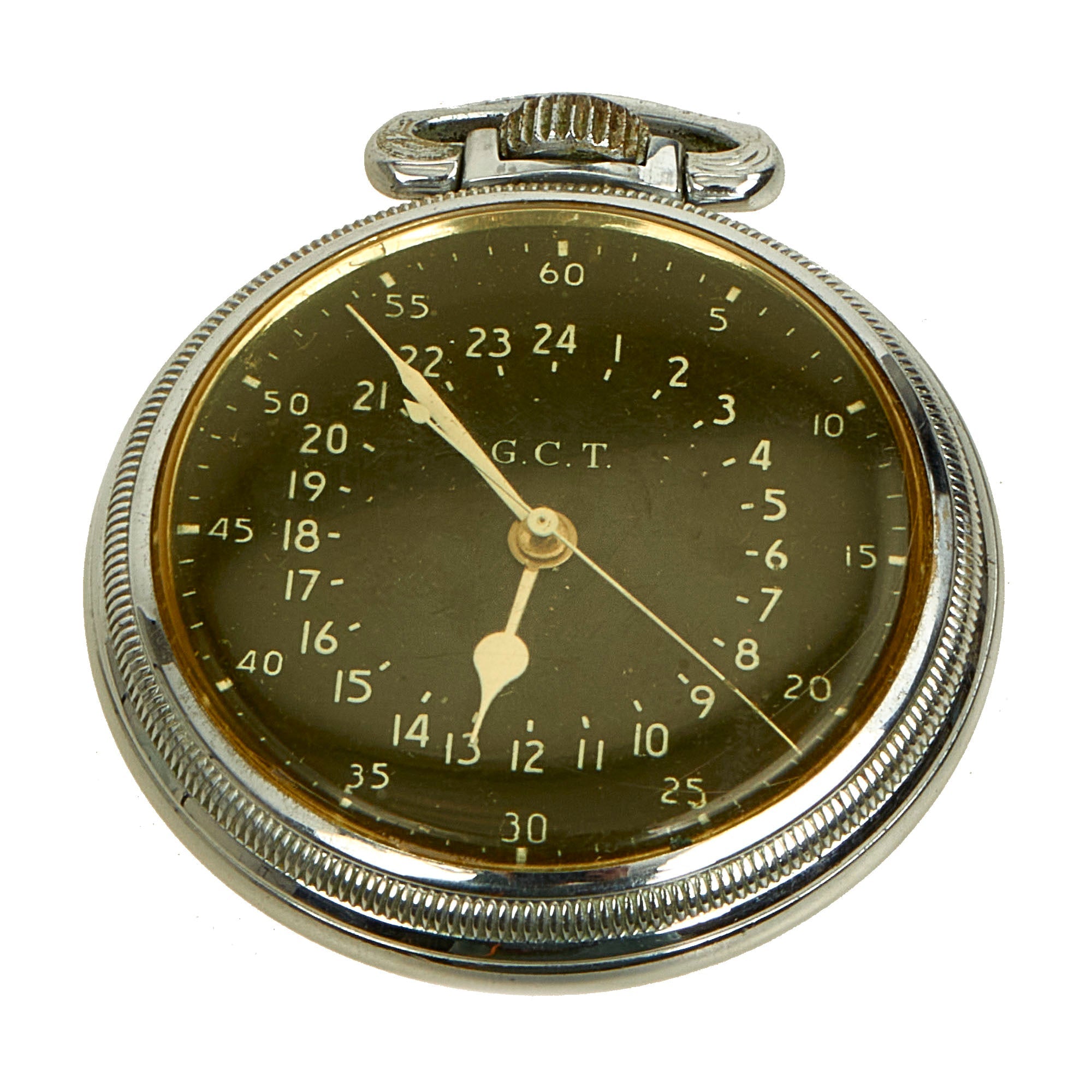 This is a very good example of the Hamilton U.S Air Force GCT Navigation watch type AN 5740, most likely made in 1968. The "GCT" or AN 5740/AN 5740-1 pocket watches were used for navigation purposes by all the branches of the US. Military prior to, during, and after WWII. The three main manufacturers of the AN-5740 and AN-5740-1 were The Hamilton Watch Co., The Elgin National Watch Co. and the Waltham Watch Co.