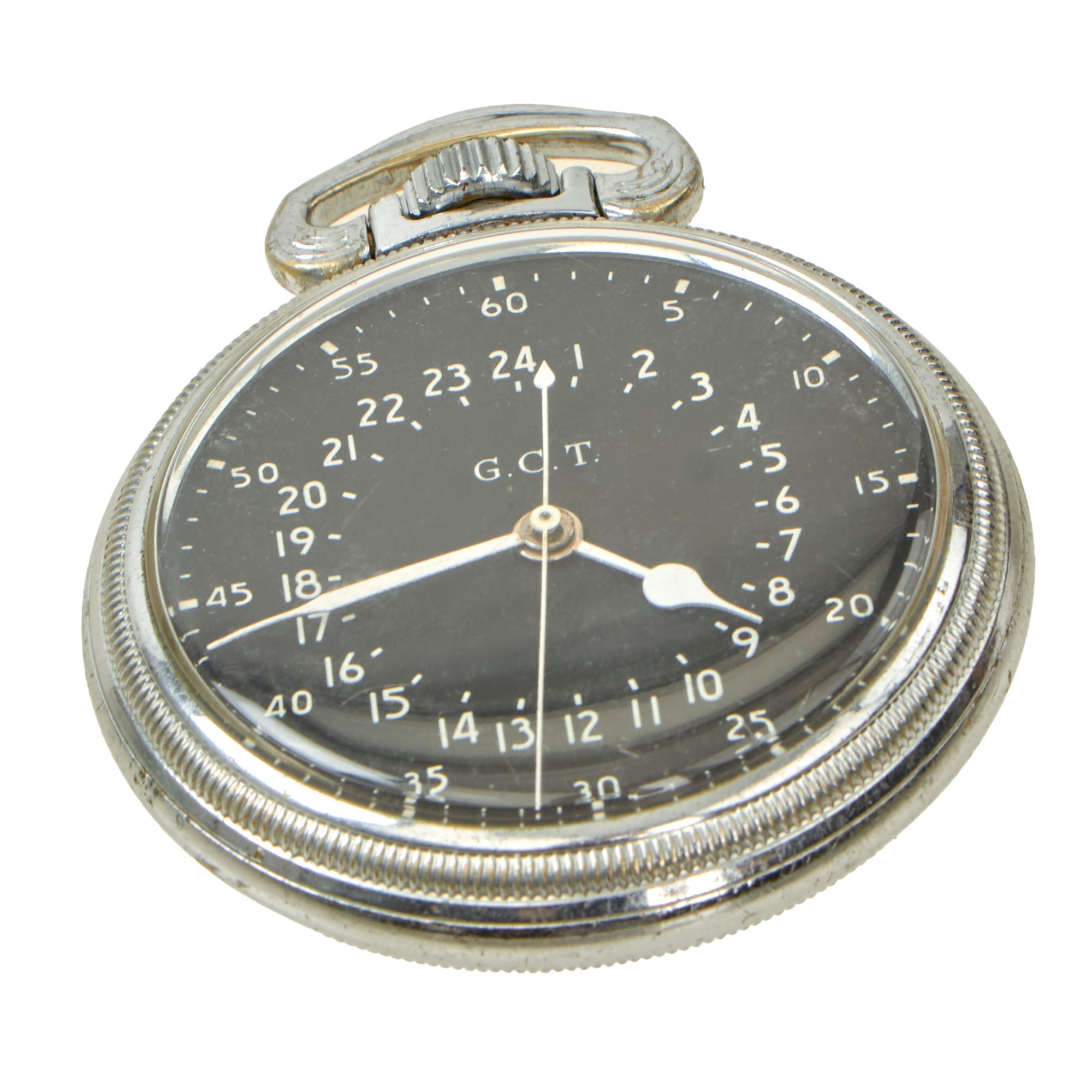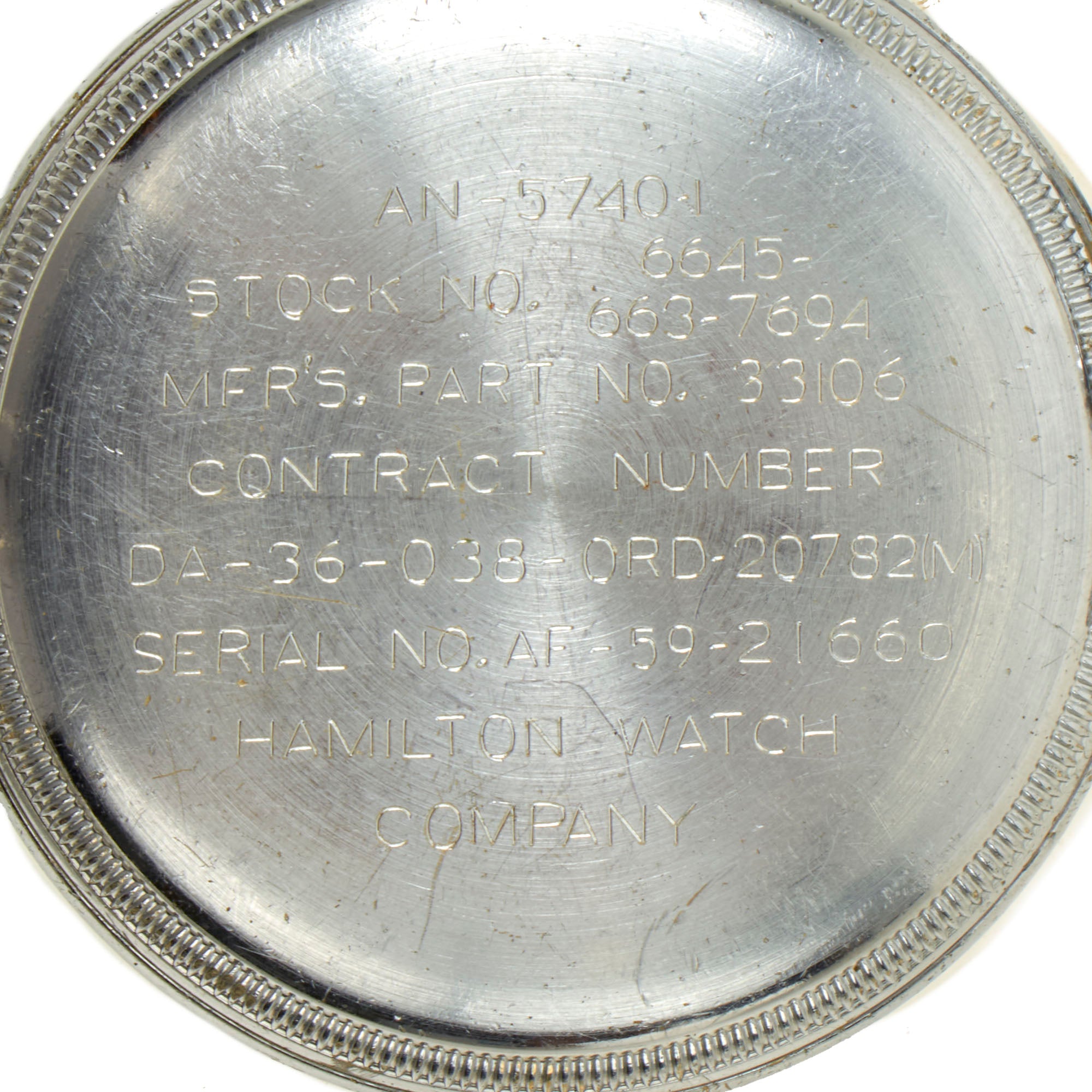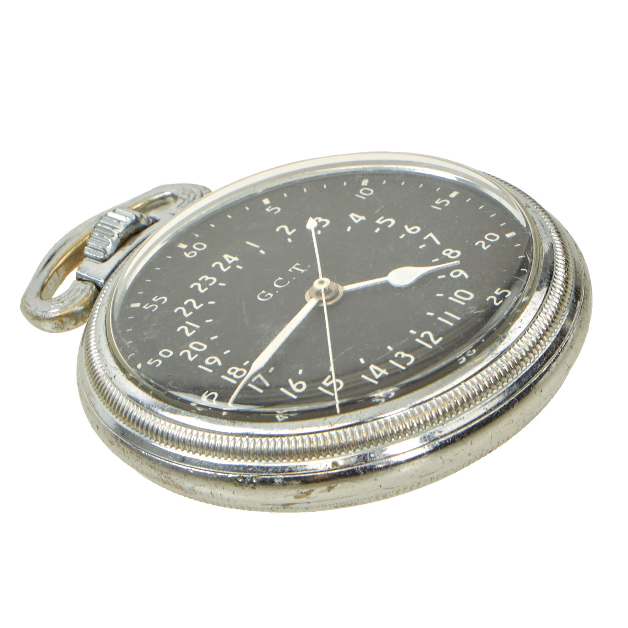 This is a very good example of the Hamilton U.S Army Air Force GCT Navigation watch type AN 5740-1, with a manufacture date of 1959. The "GCT" or AN 5740/AN 5740-1 pocket watches were used for navigation purposes by all the branches of the US. Military prior to, during, and after WWII. The three main manufacturers of the AN-5740 and AN-5740-1 were The Hamilton Watch Co., The Elgin National Watch Co. and the Waltham Watch Co.