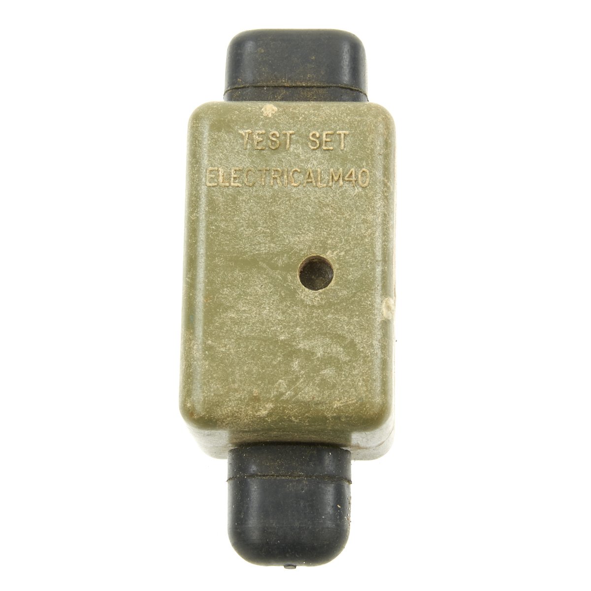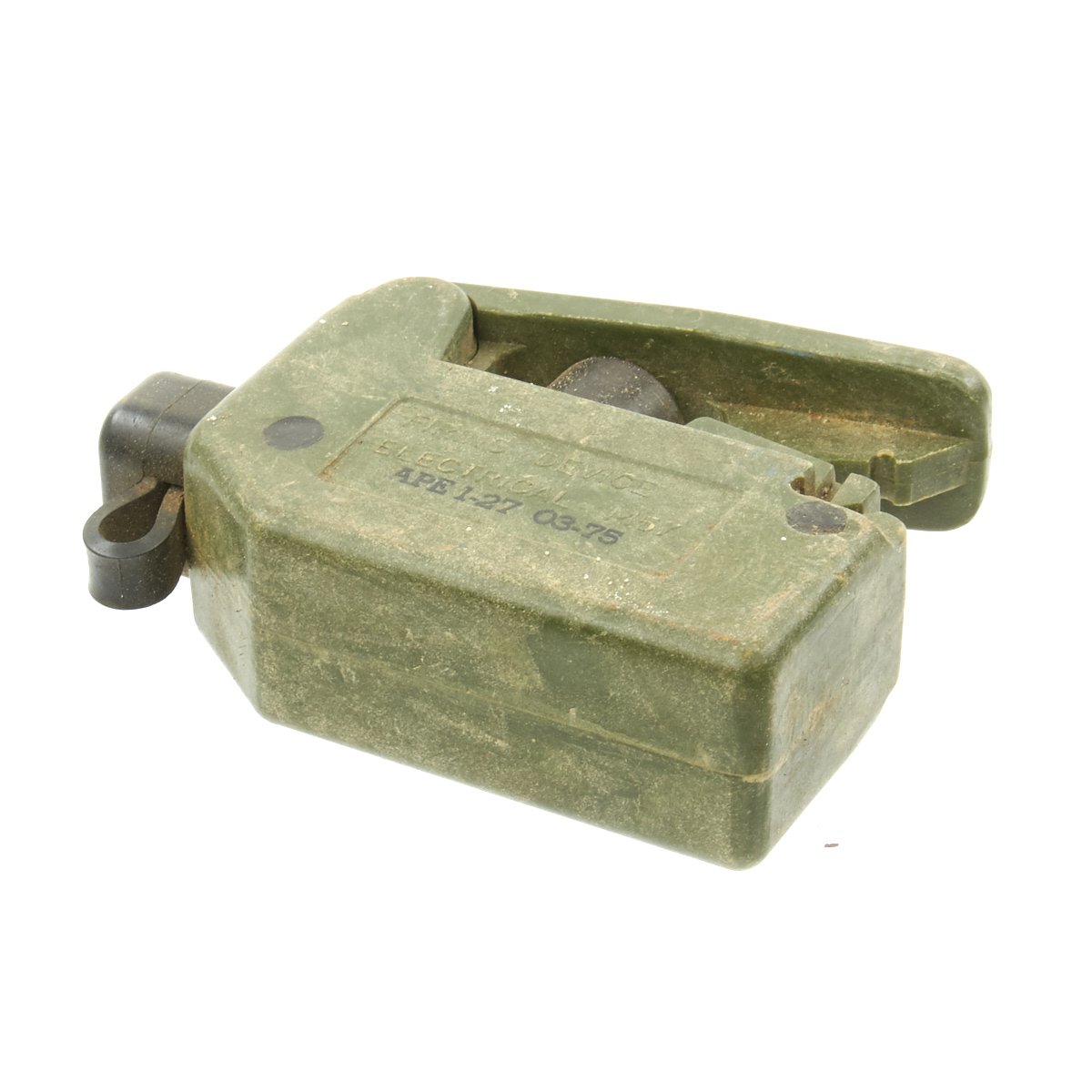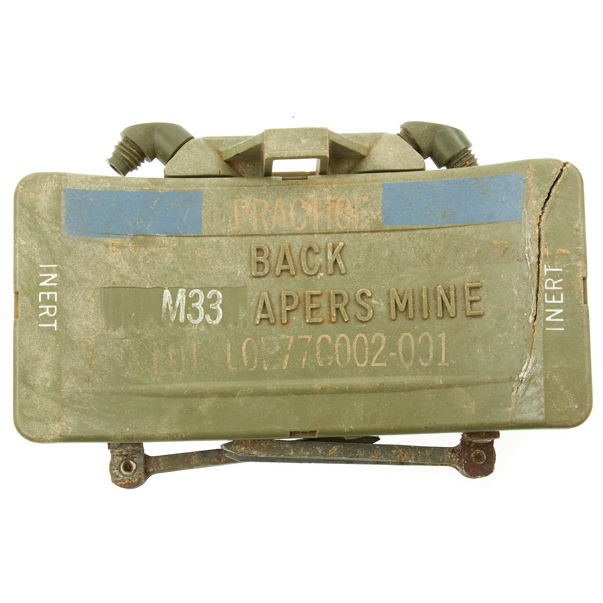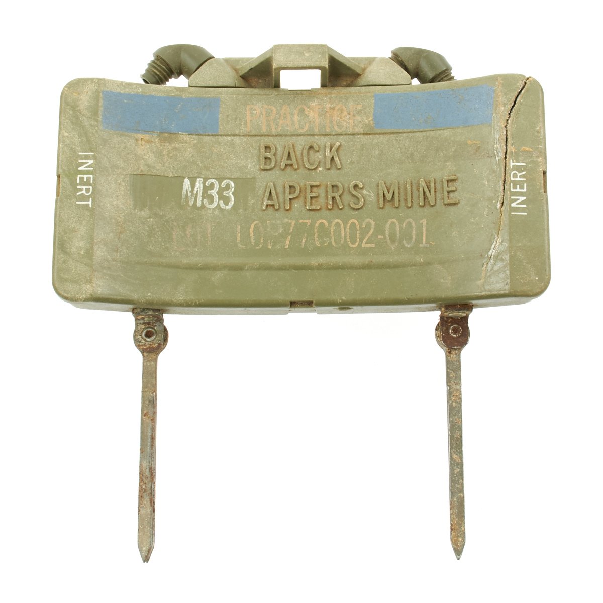 This example is quite nice, and definitely has the look of a well-used piece of training equipment. The Mine itself looks possibly to have been made from a defective M18, as it can be seen where molded markings were removed, and M33 stamped in its place. There is also blue paint and "PRACTICE" and "INERT" marked on the back. It still retains the original support "legs", as well as the wire connectors.