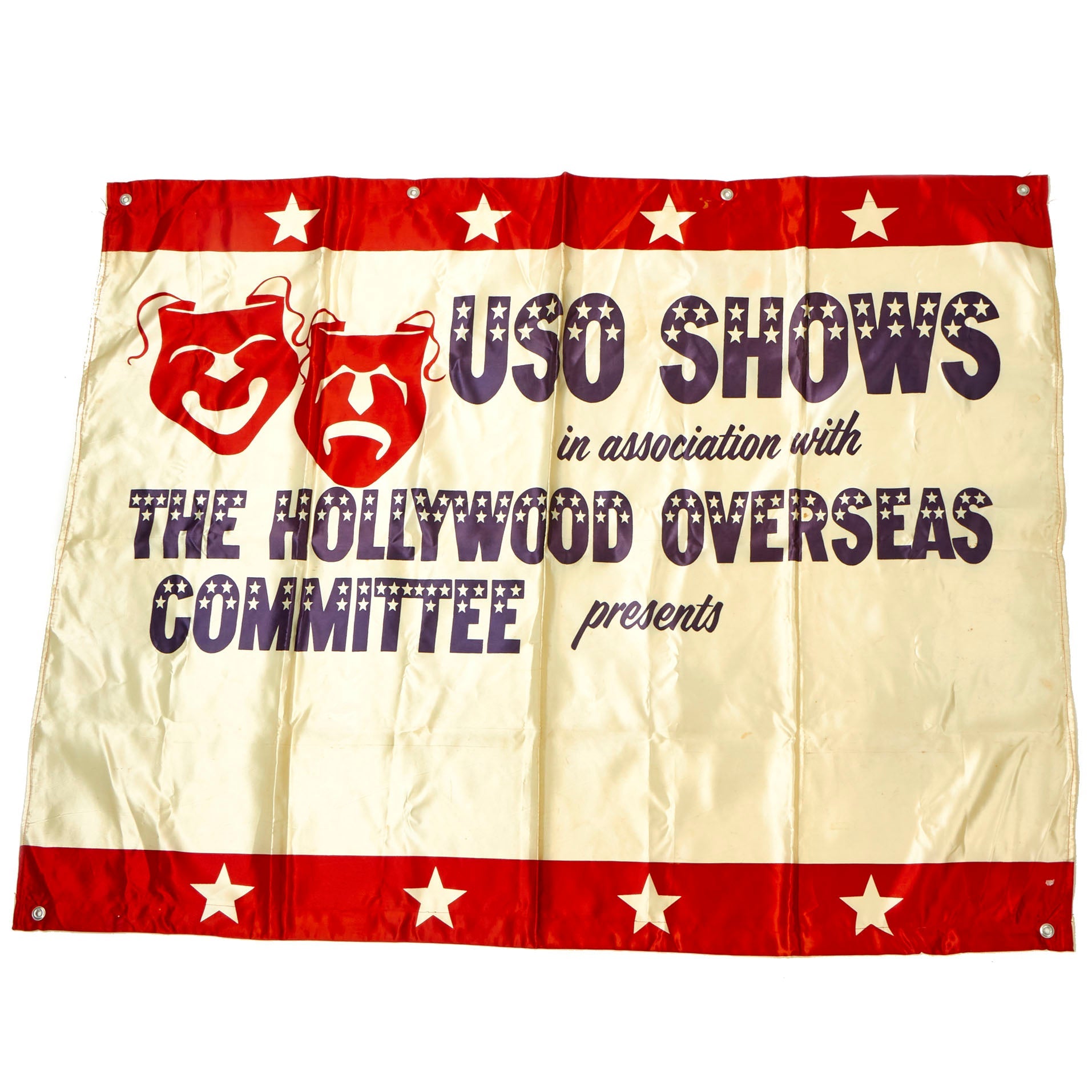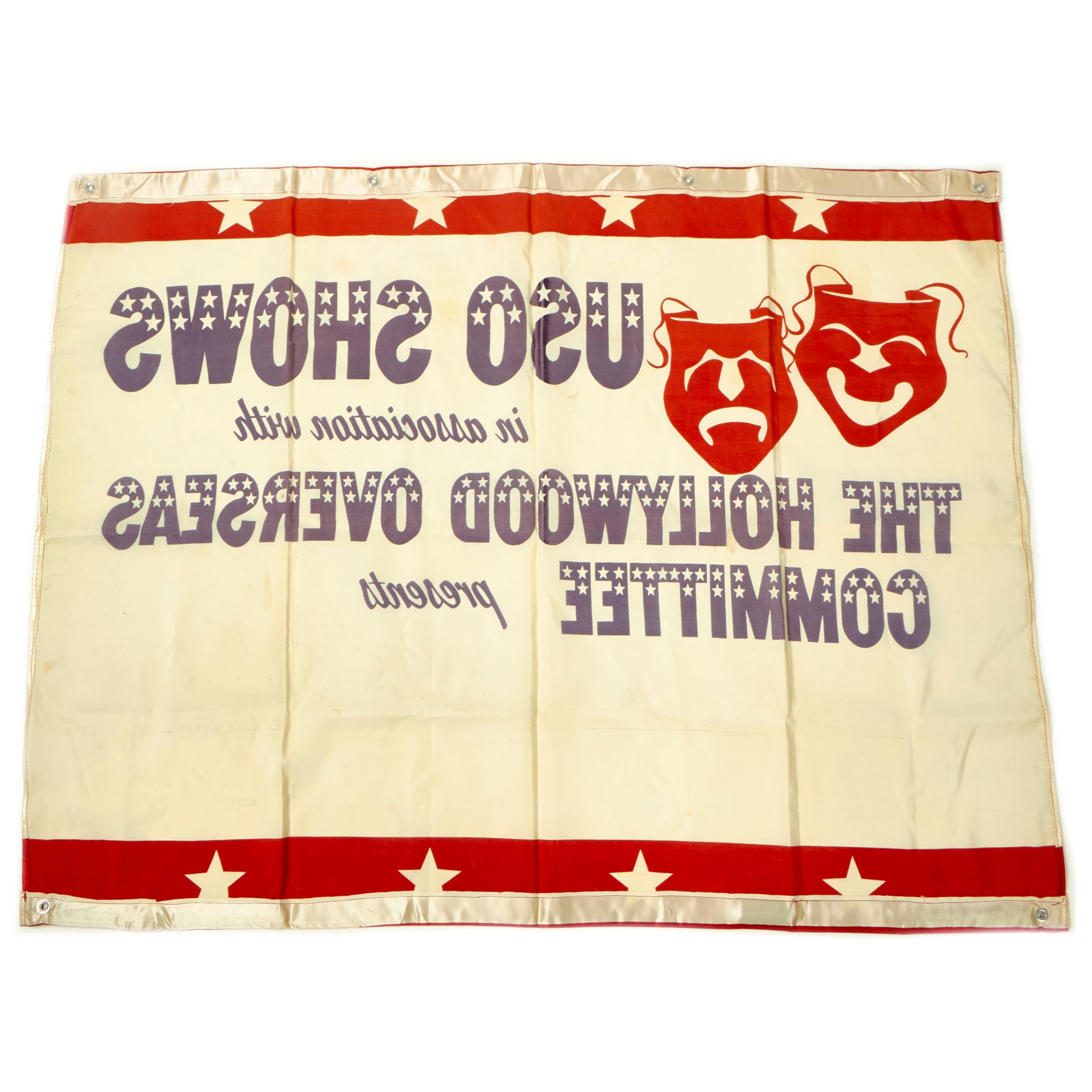 Original Item: Only One Available: This is an absolutely fantastic artifact that crosses over not only into the realm of Military History, but of Hollywood History as well! This is an original stage show banner used by the USO dating to the Vietnam War.
