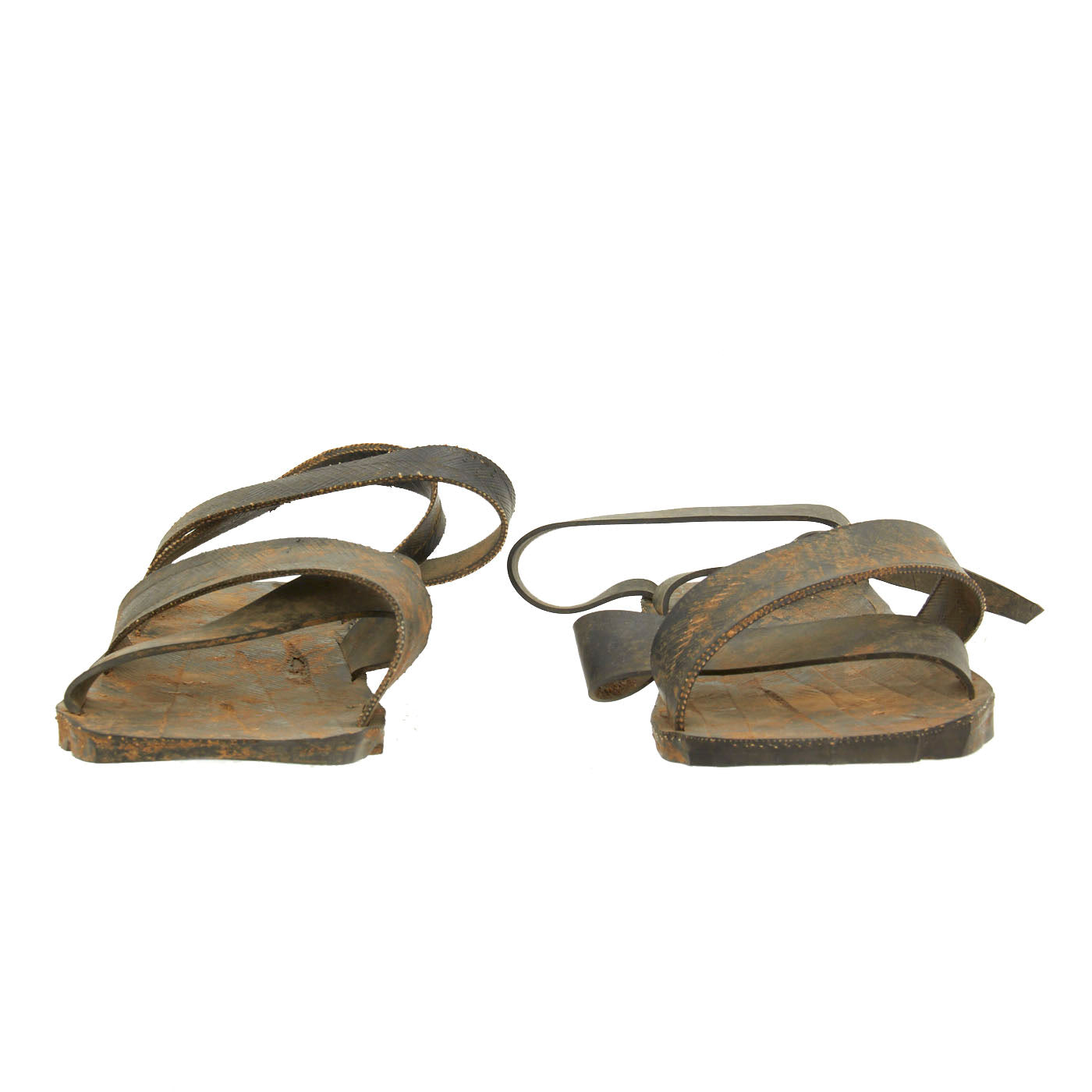 This pair of 'Ho Chi Minh' sandals is made from recycled rubber. The soles of the sandals are made from discarded car tires and the top straps are made from inner tubes and thinly cut tire rubber.