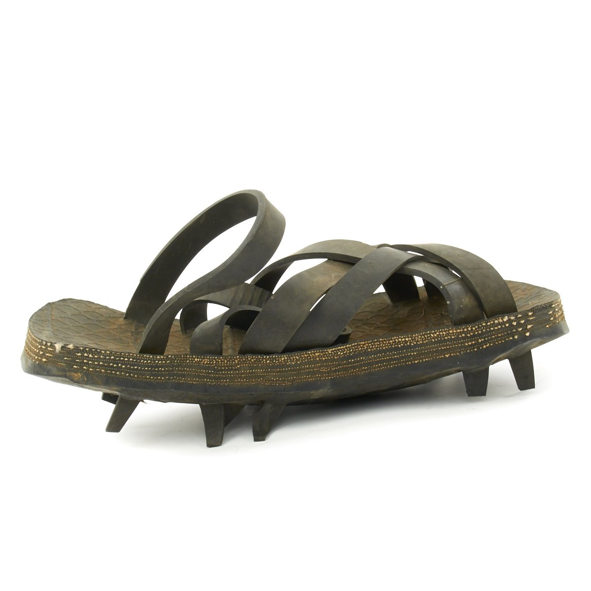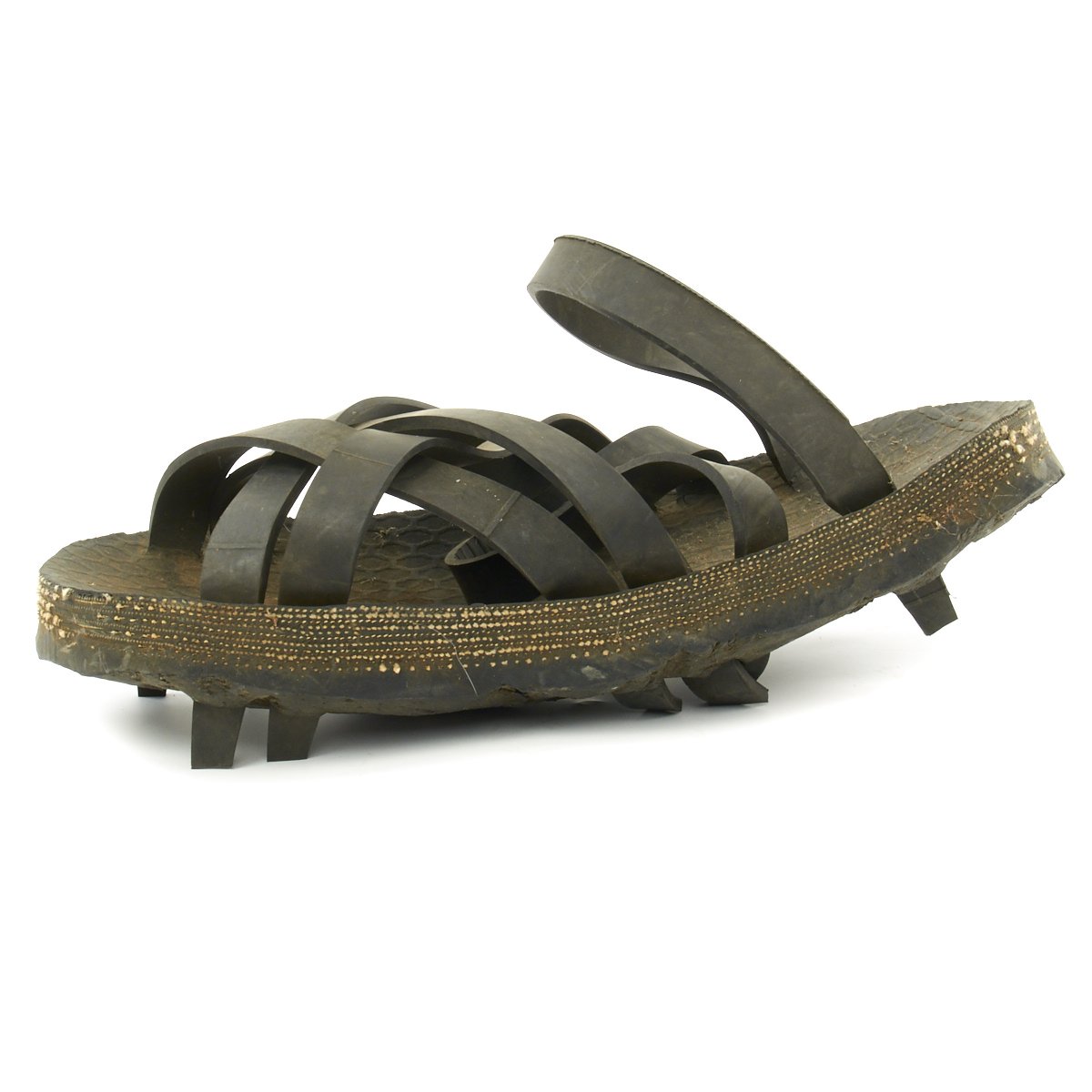 This pair of 'Ho Chi Minh' sandals is made from recycled rubber. The soles of the sandals are made from discarded car tires and the top straps are made from inner tubes.