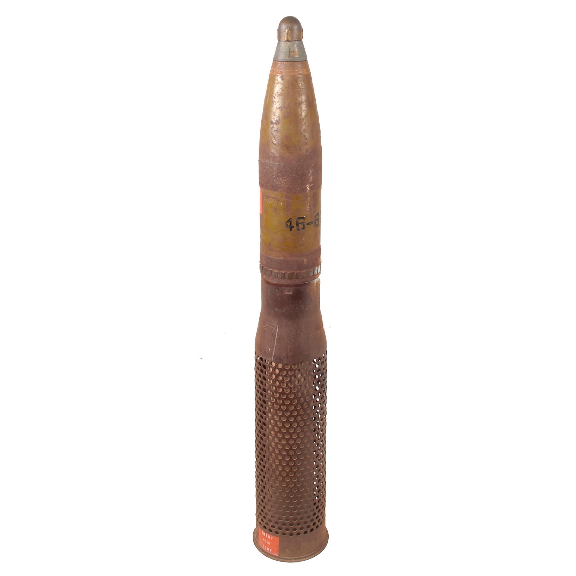 The round measures roughly 28” tall, and the projectile cannot be removed from the casing. The fuze can be removed, however, which shows that there’s an additional EOD sticker under the fuze to show that it’s inert. The fuze cover is also intact, and when removed shows the button. There are various Chinese markings across the fuze and projectile. The side of the body of the round is stamped 46-67-376, which we believe to denote a 1967 manufacture date.