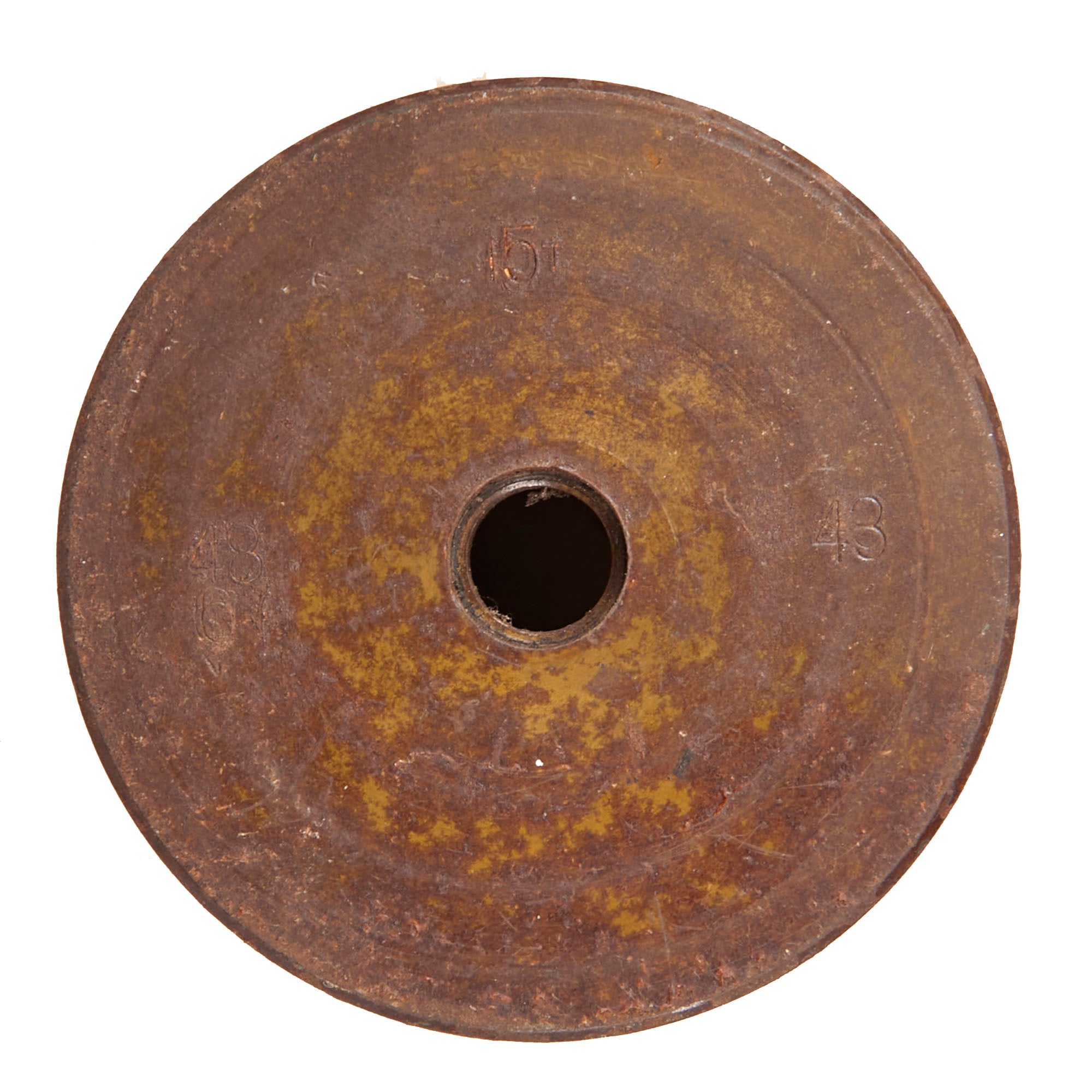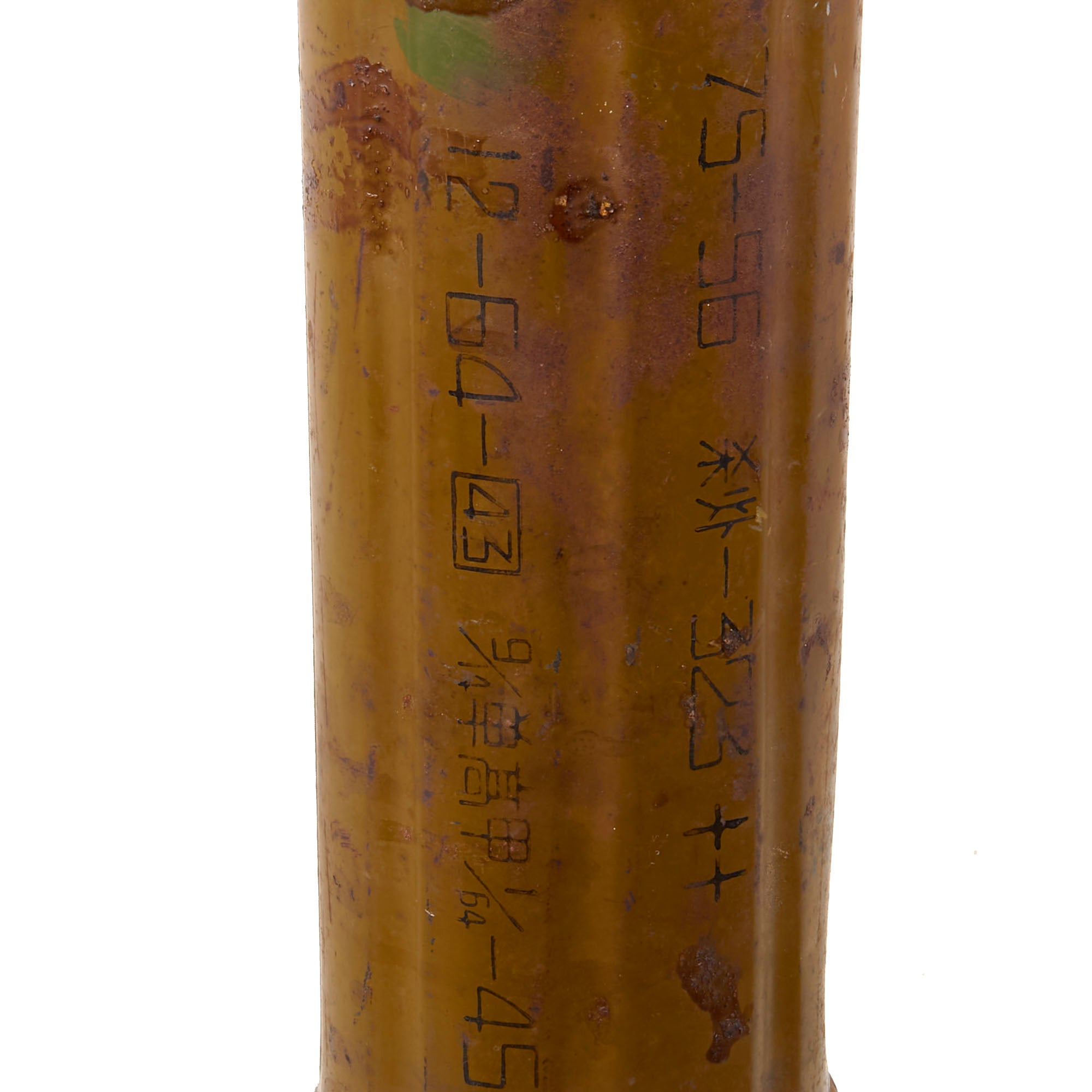 The casing is marked with several Chinese symbols and other stamps including 8-67-43, which likely also indicates a 1967 date. The casing does not retain the rod, and instead there is a strange paper roll inside which we aren’t sure about the origins of. There is some denting in the side of the casing as shown.