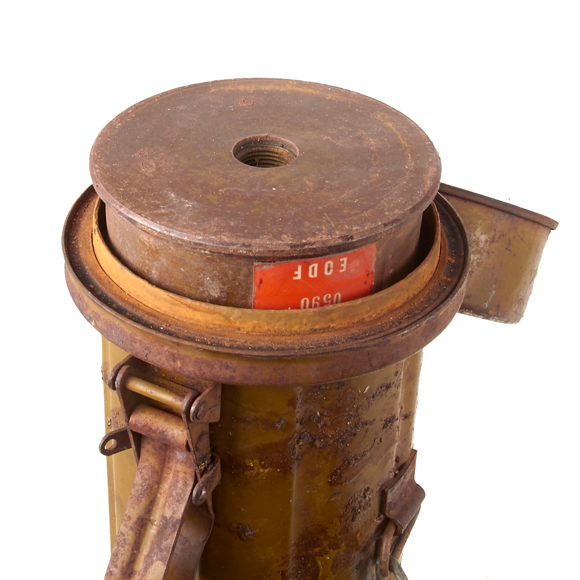 The original canister measures about 24½” long and is roughly 4” in diameter. There are various Chinese markings on the side, including 12-64-43, which likely indicates a 1964 date of manufacture. It retains the original canvas carrying strap, very rare to find on its own. The lid still latches correctly and the round fits like a glove.