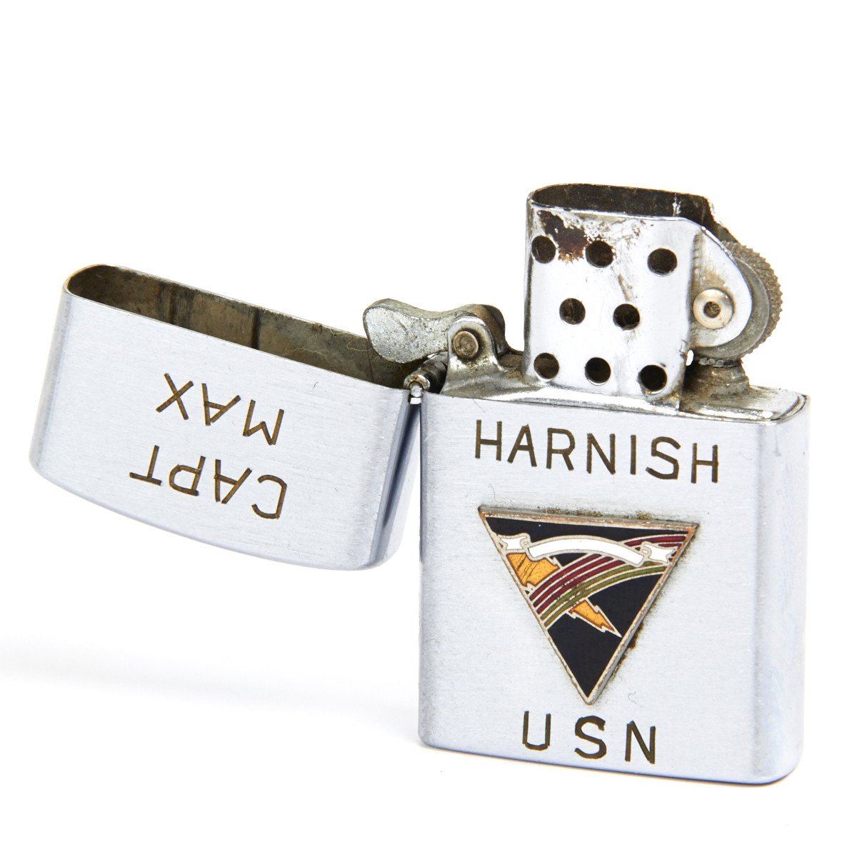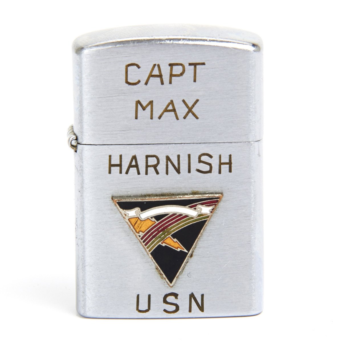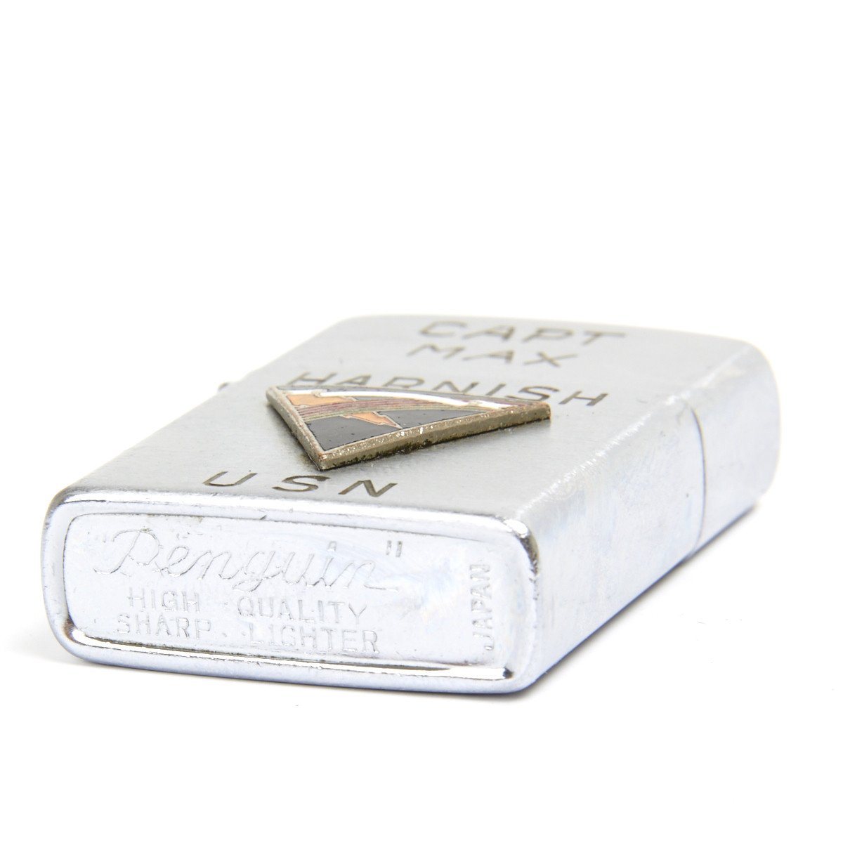 Offered in fully functional condition, this is an original vintage Zippo style windproof light made by Penguin of Japan. It was issued to a US Pilot named Captain Max Harnish during the Vietnam war that served as part of the Carrier Air Wing Fourteen (CVW-14), was a United States Navy aircraft carrier air wing based at Naval Air Station Lemoore, California.