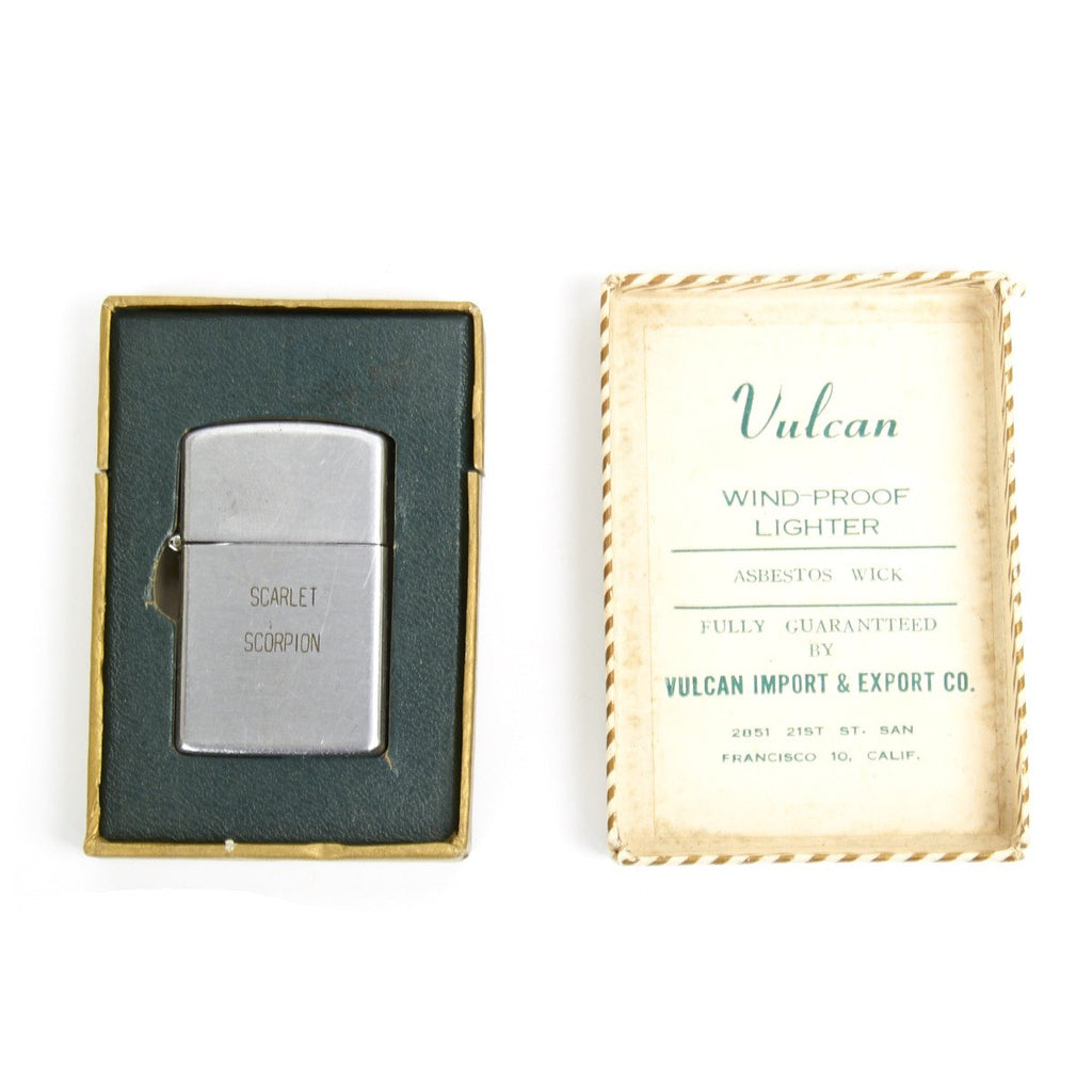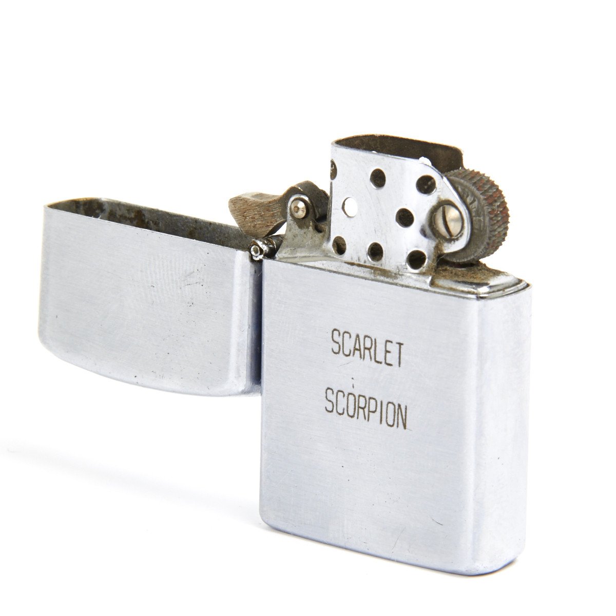 Excellent vintage ZIPPO style windproof lighter circa 1968. Nicely engraved "Scarlet Scorpion" and "NCO Club" (Non-commissioned officers) "Y.T.S" which we believe are the soldiers initials. Offered with original box and in excellent fully functional condition.