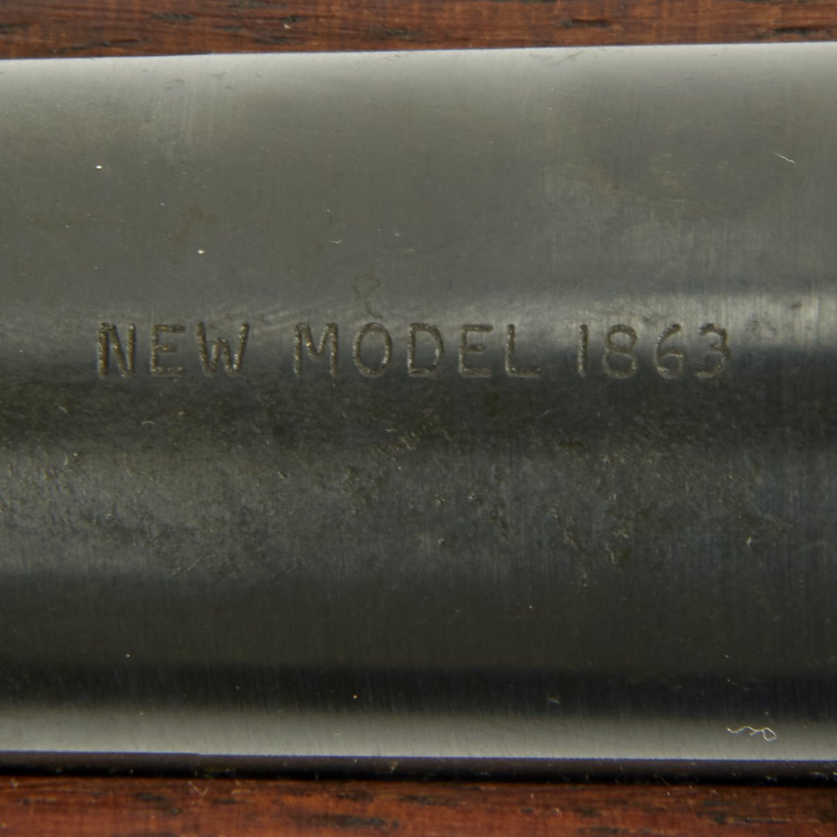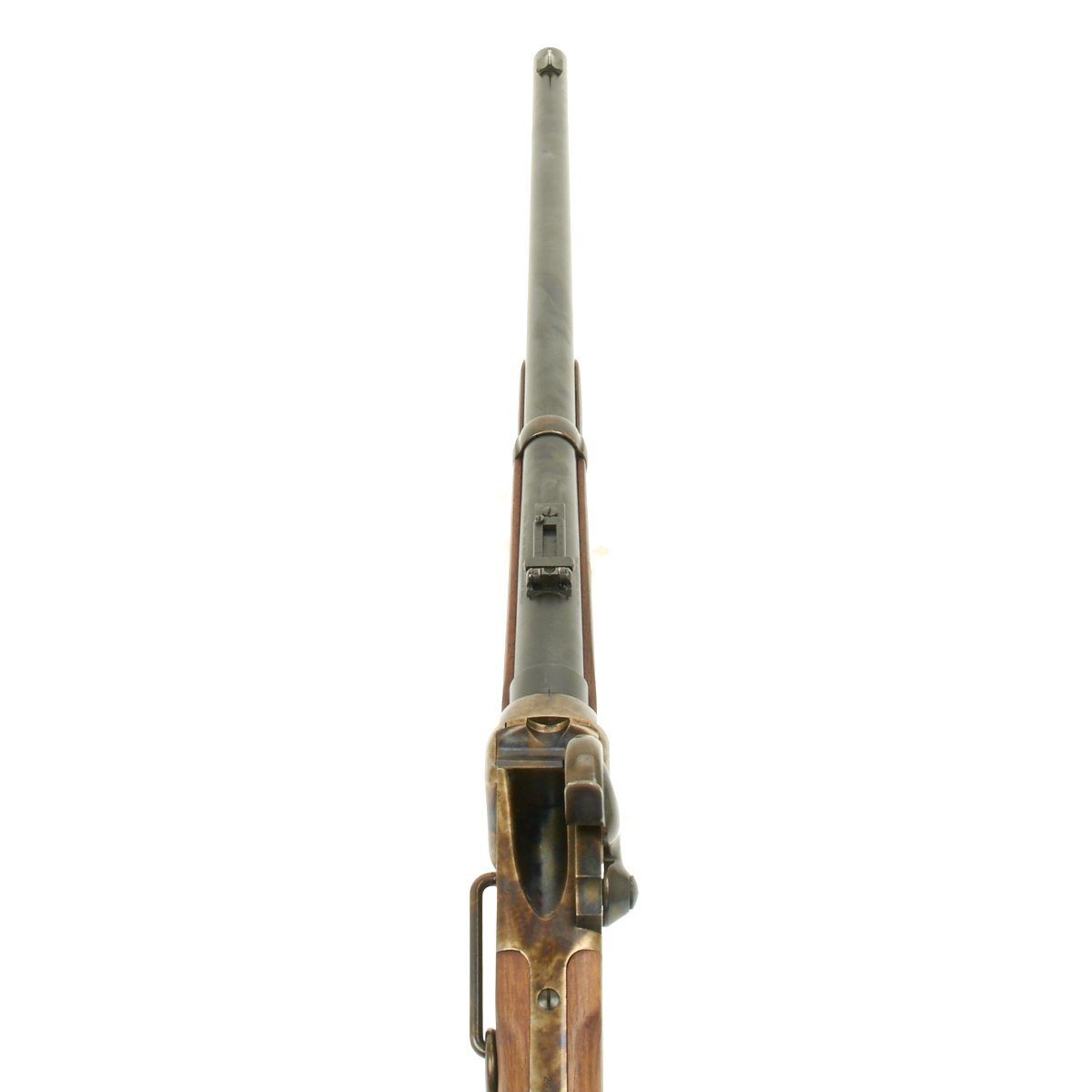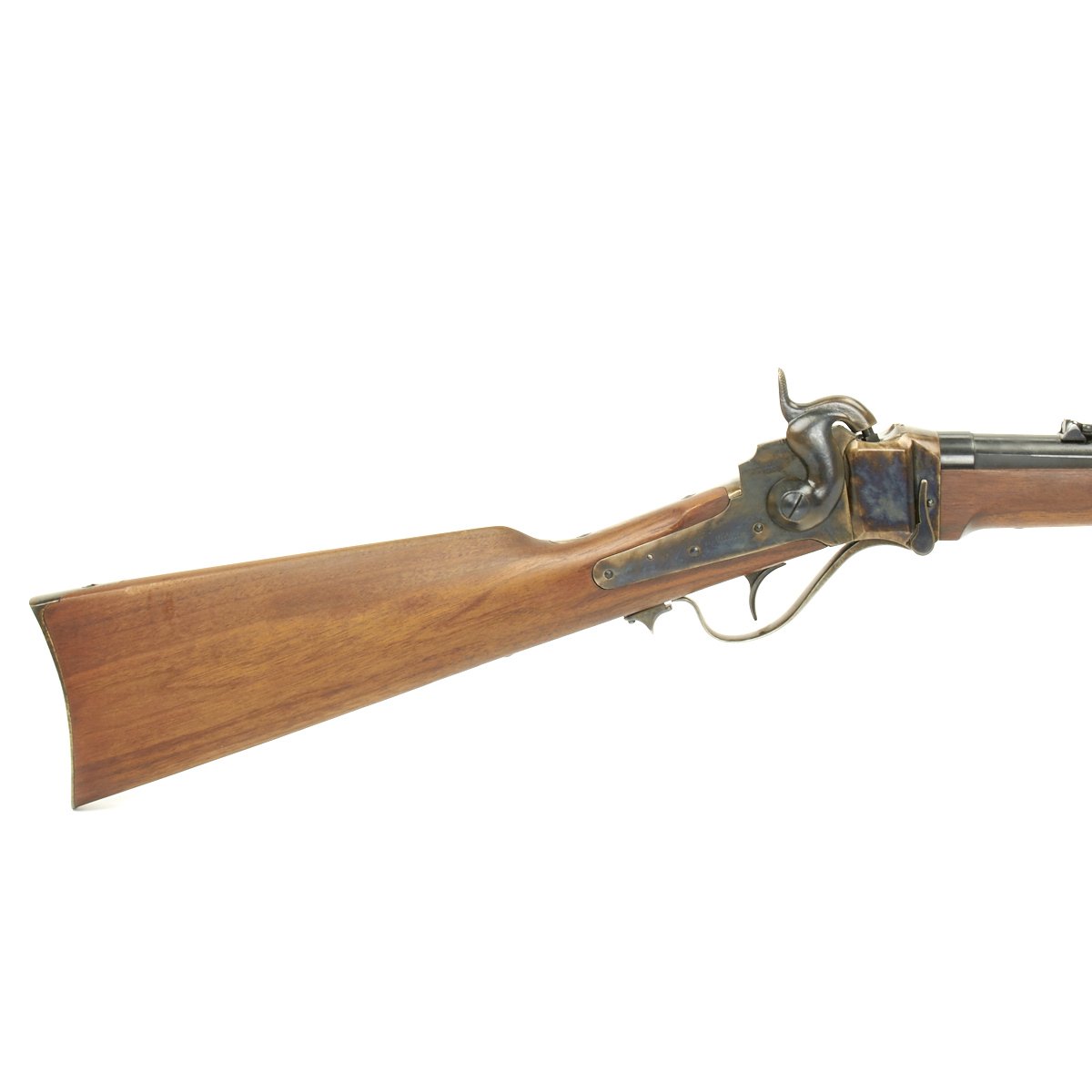The New Model 1863's were made without patch boxes, a wartime procedure to do away with extras. It has a 21 1/2-inch barrel, measures 37 1/2 inches overall, and has a two- piece walnut stock. The barrel and, on some, the buttplate were blued. The frame, lock, and barrel band were casehardened in mottled colors. The fact that the Confederates manufactured copies of the Sharps carbine in Richmond, Virginia, in quantity testifies to its general popularity. This carbine was based on Christian Sharps' patents of 1848 and 1852 and on Richard S. Lawrence's patents of 1859.