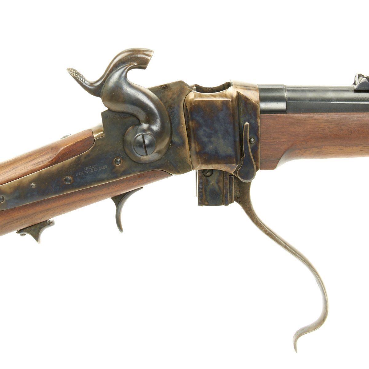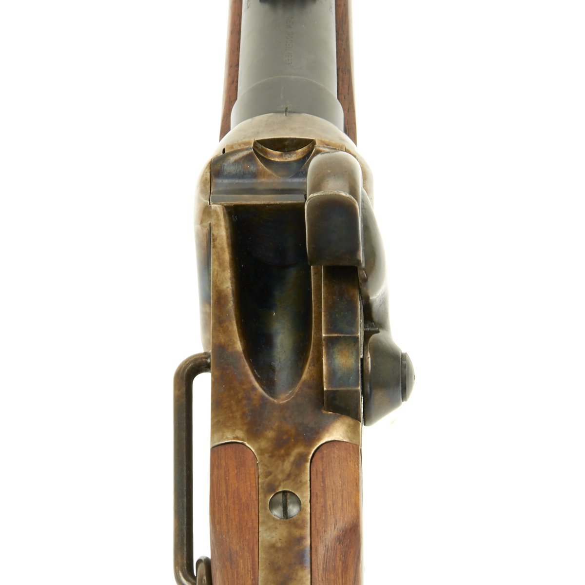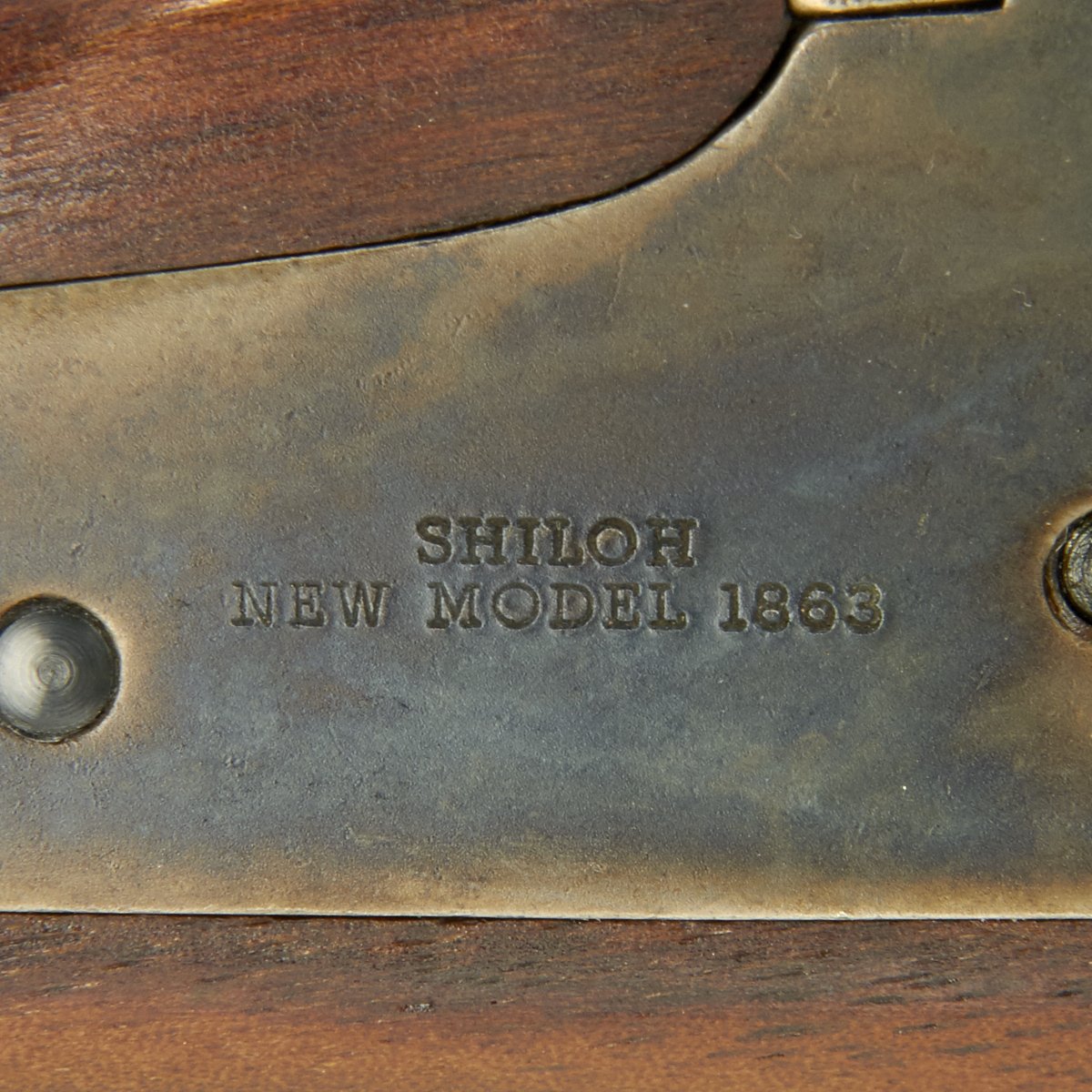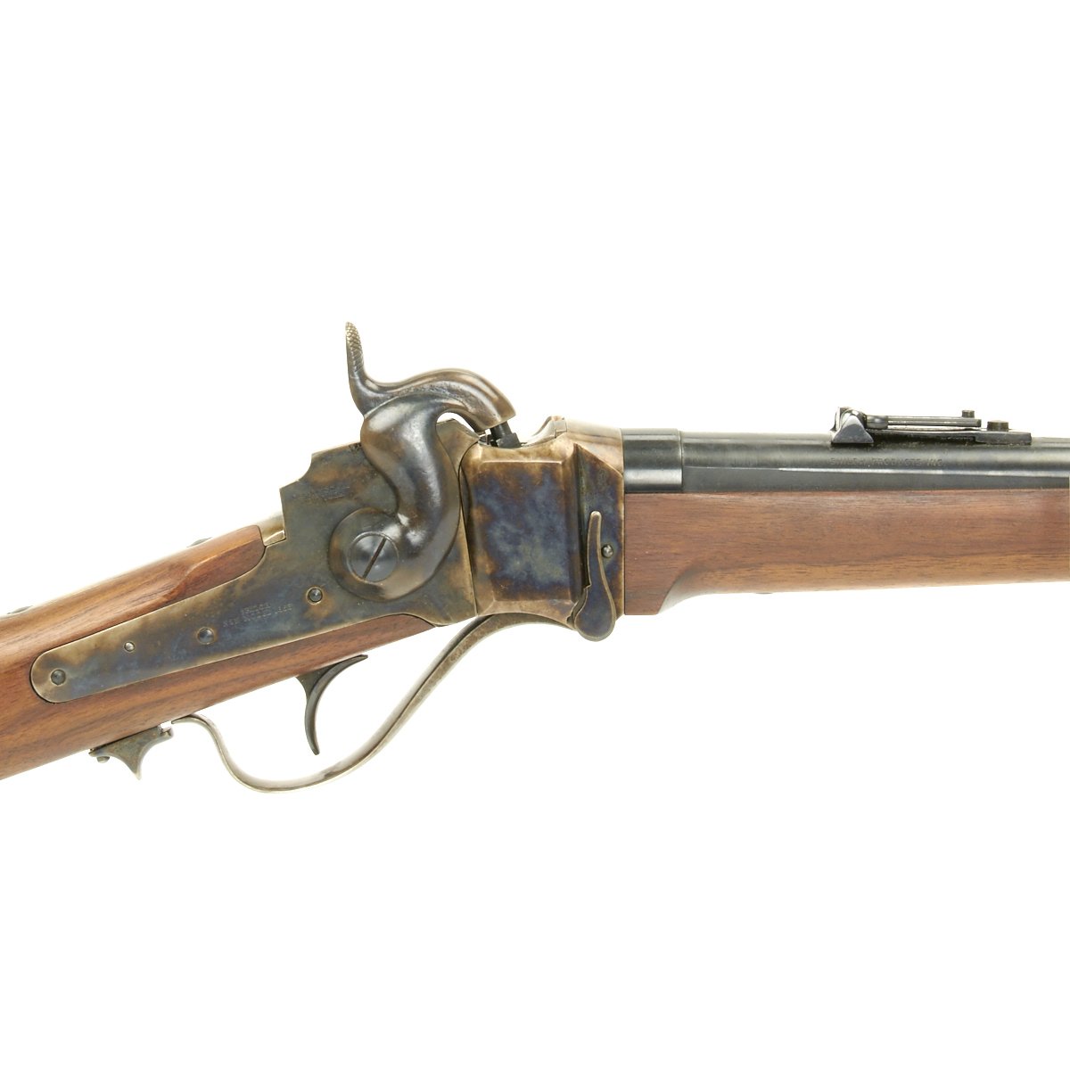 1980's Shiloh Replica: One Only.This is, in our opinion, the nicest of all the twentieth century clone Civil War Carbines and best of all it was made in the United States. It is based on the legendary SHARPS MODEL 1863 .54 caliber Percussion saddle ring carbine and made in Farmingdale, New York. Retaining virtually 100% of it's original blue and case hardening finish I suspect this Carbine may never have been fired in it's over 30 years of history. Ideal for Civil War re-enactments or just for Civil War Display. Federally treated as an "ANTIQUE" but check local regulations.