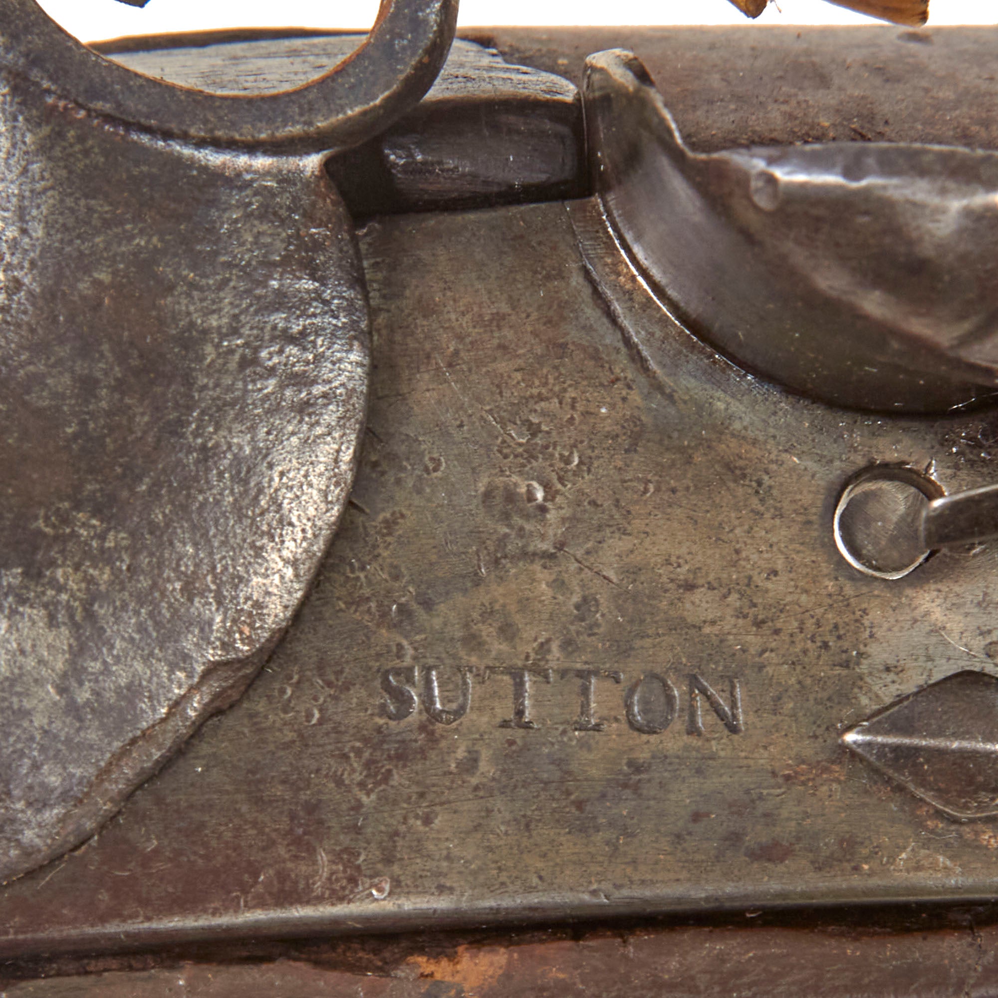 We can see traces of what might have been an Eagle above this, however it may have been made without one. There is a VERY similar musket, albeit in better condition, on display at the NRA Museum website: U.S. Waters and Whitmore Model 1808 Musket. The "SUTTON" marking is correct for Elijah & Asa Waters and Nathaniel Whitmore of Sutton, Massachusetts, who were contracted to build 5,000 Model 1808 muskets, of which 4,270 are believed to have been delivered. There is some mention of the locks are some shipments being unsatisfactory, and markings definitely varied quite a bit.