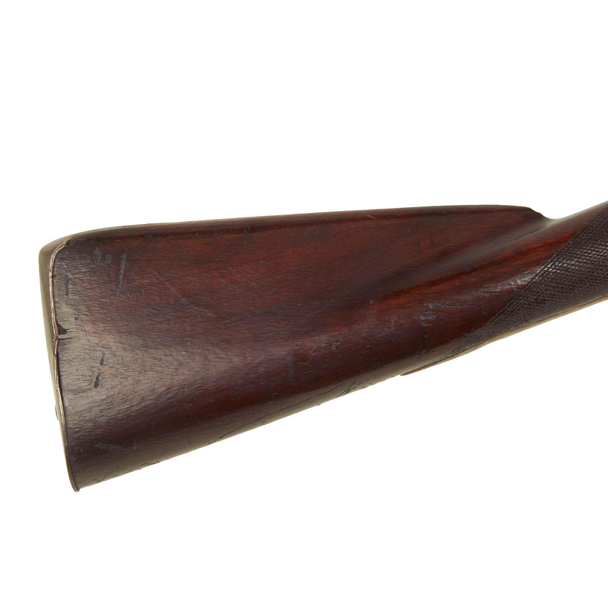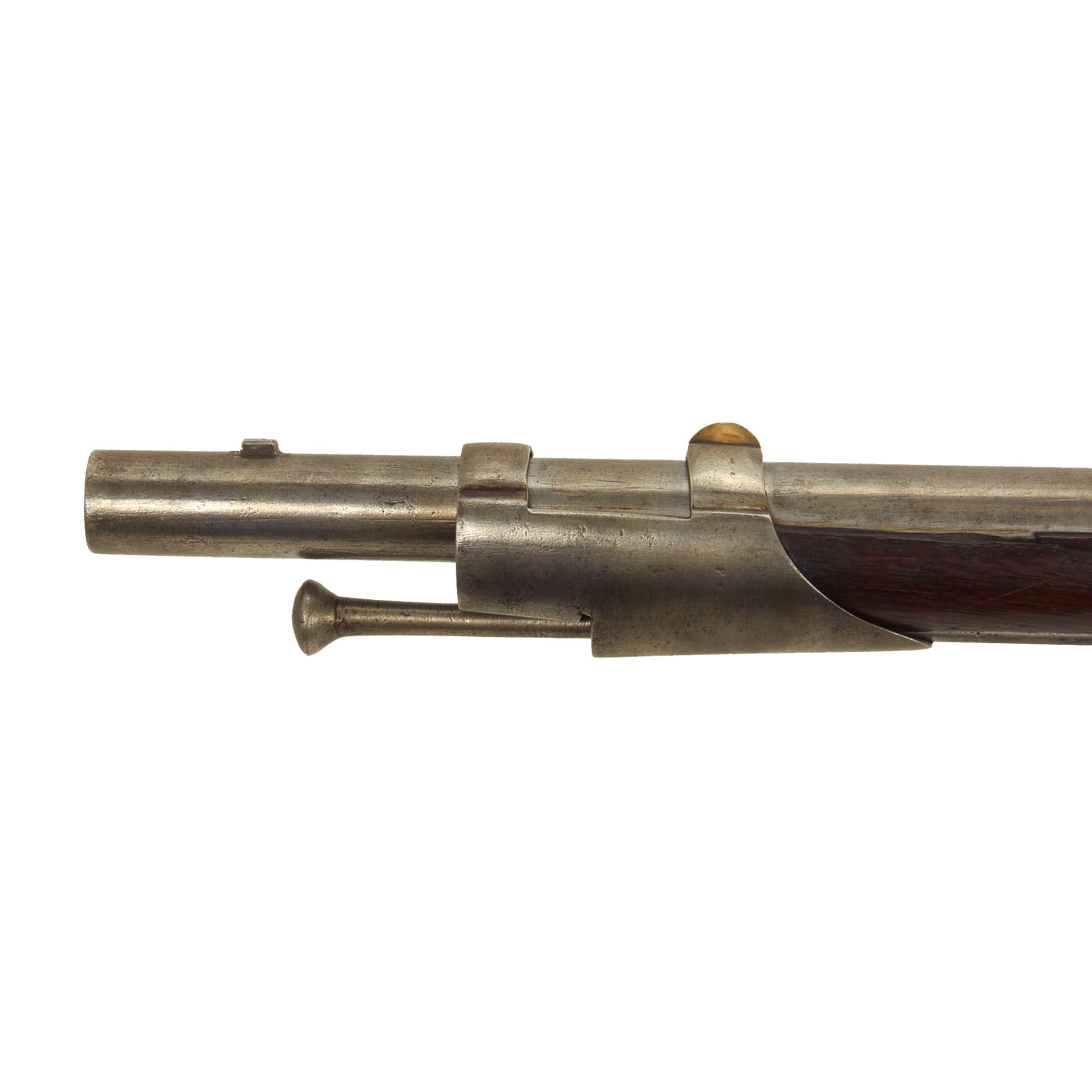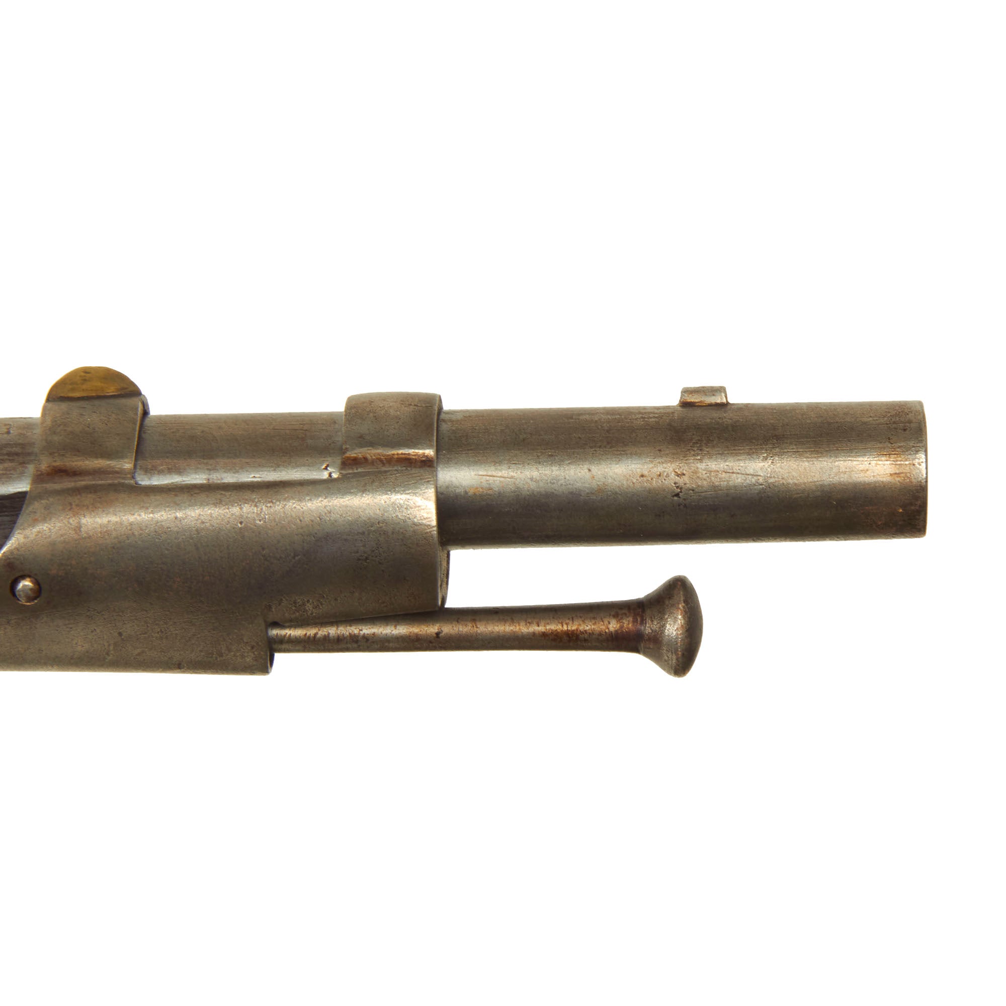 The stock is in lovely condition, looking to have been oiled and varnished over the many years this musket has been cared for. There is actually some age checking visible in areas where it has started to degrade. As with many we see, there is some cracking around the rear of the lock plate, as the firing action of the lock can put stress on the lock inlet. It looks like a chunk broke off and two iron pins / nails were used a very long time ago to secure it. There is also a stress crack running forward from the front of the lock plate. There are no proof markings on the stock, but we can see what looks to be WESTPHAL stamped into the left side of the stock over the trigger guard, which may be for Carl Westphal.