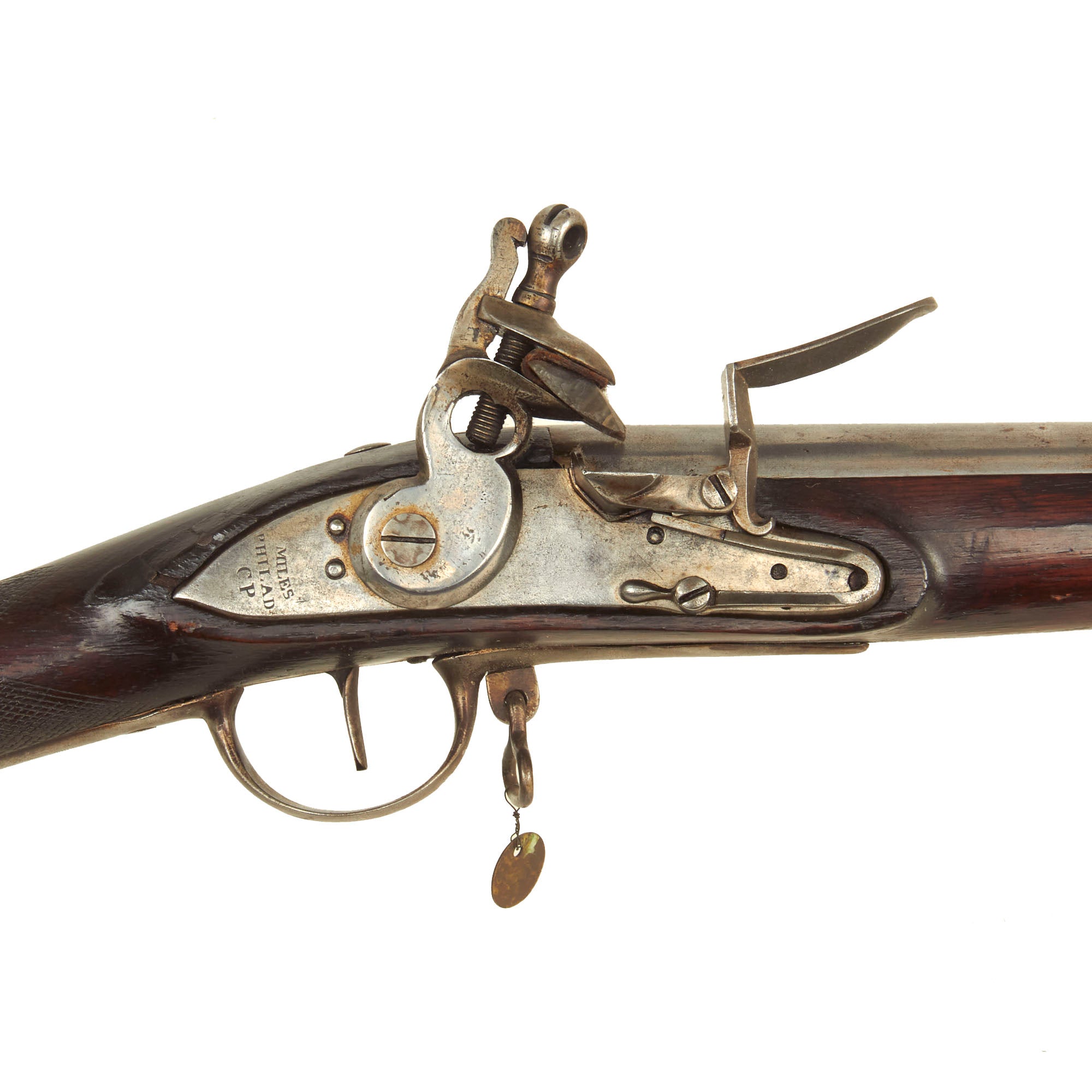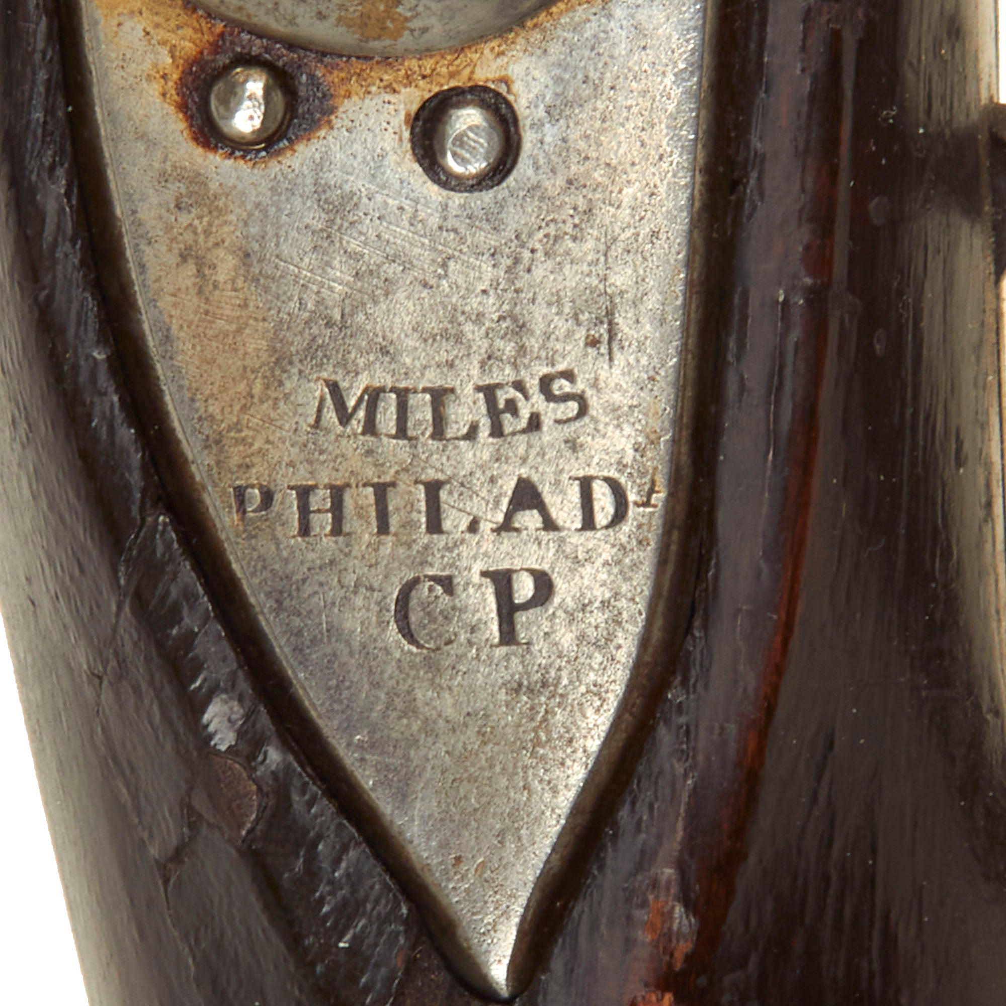 This is a very nice example of a musket from Mile's second contract, correctly marked MILES / PHIL'ADA over CP, for the Commonwealth of Pennsylvania. The musket is in very good condition, especially considering the age, and has a great look, having been carefully cleaned and polished over many years. There is a P in an oval proof on the breech end of the barrel, correct for this time period, as the "Liberty Cap" had been deprecated in 1799 in favor of other markings.
