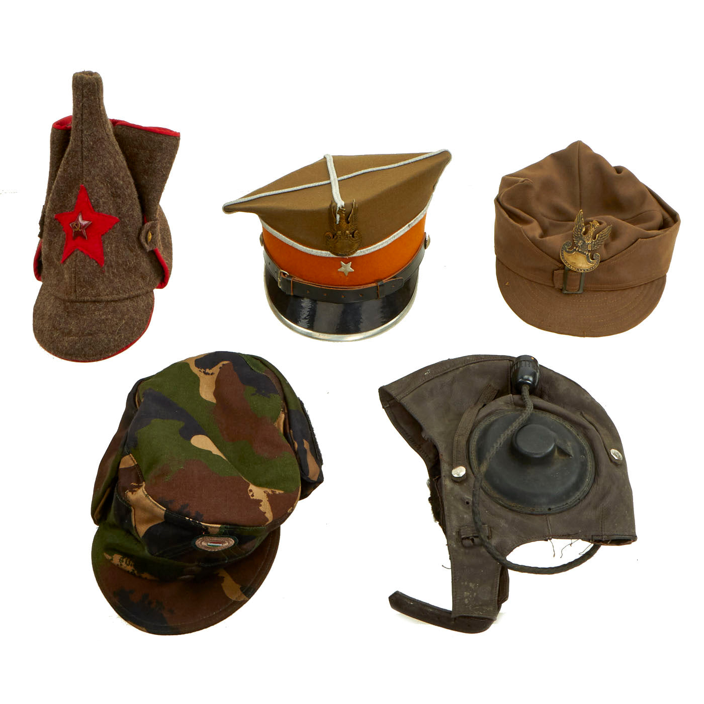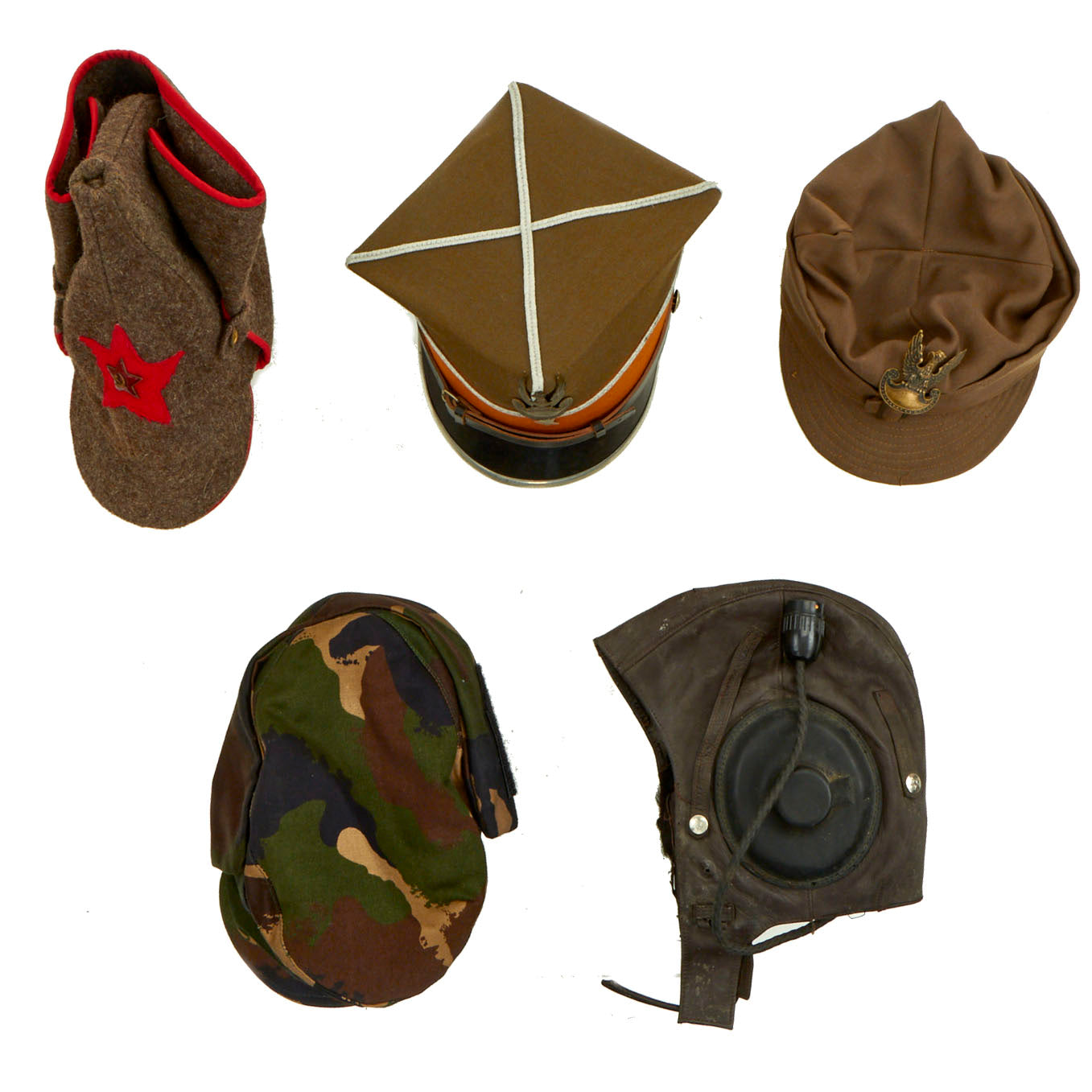 - Soviet Union Budenovka: This appears to be a new made item. A budenovka is a distinctive type of hat, an archetypal part of the Communist military uniforms of the Russian Civil War following the Russian revolution (1917–1922) and later conflicts. Its official name was the "broadcloth helmet" (шлем суконный). Named after Red Army cavalry commander Semyon Budyonny, it was also known as the "frunzenka" after the Commissar Mikhail Frunze. It is a soft, woolen hat that covers the ears and neck. The cap features a peak and folded earflaps that can be buttoned under the chin.