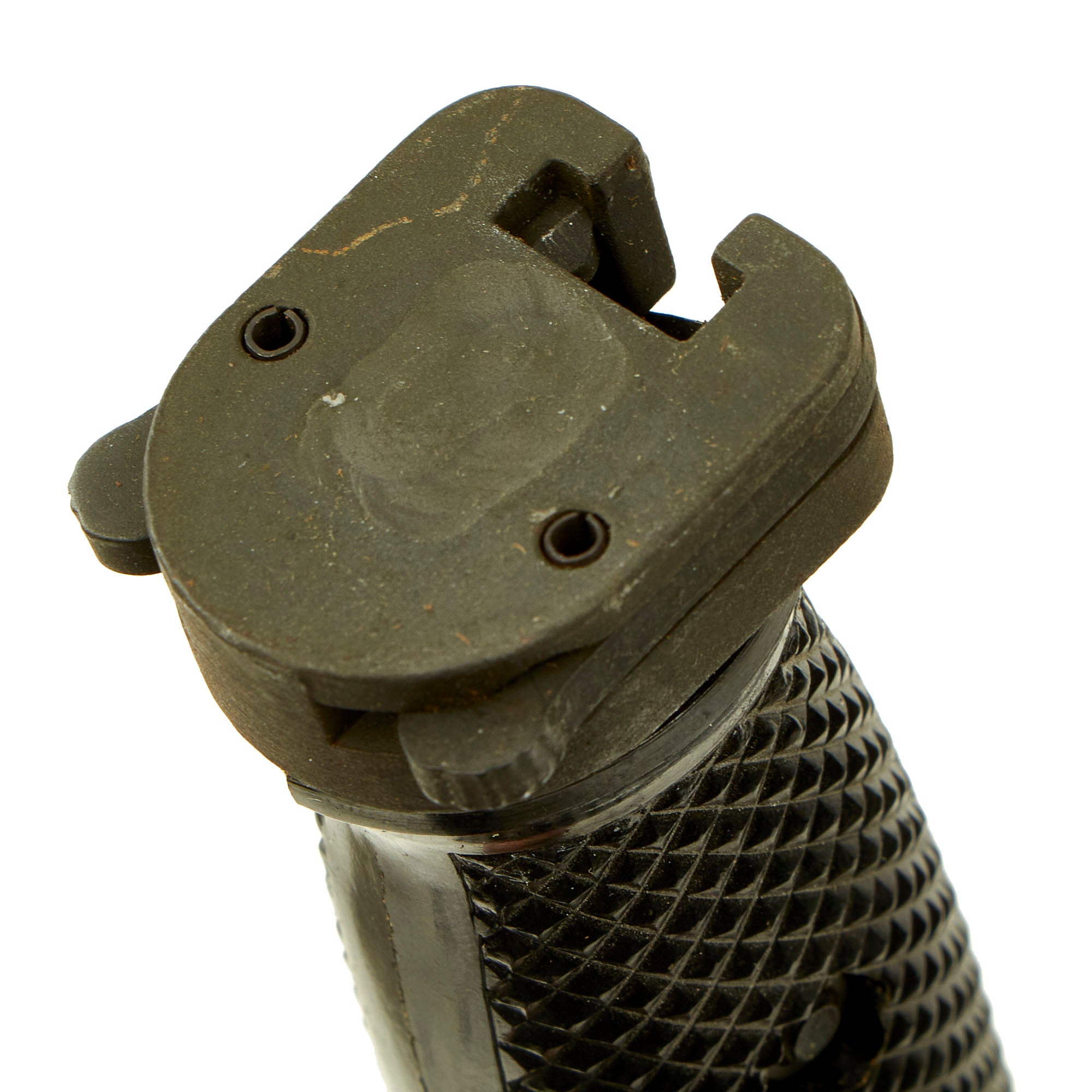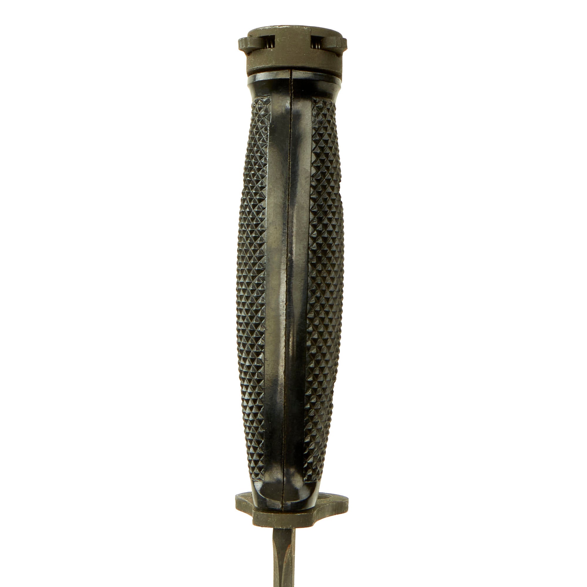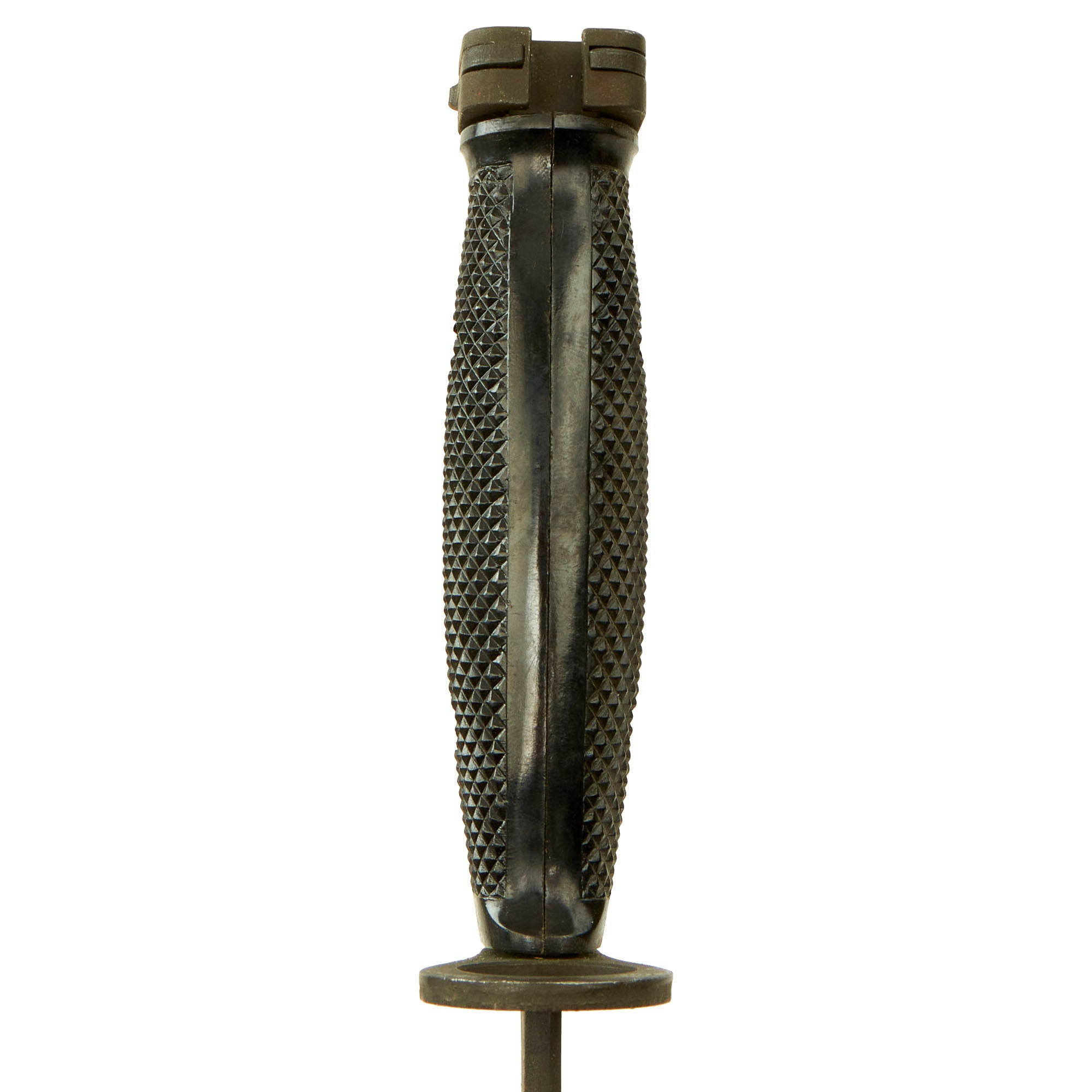 The blade is in very good condition with almost no wear, and is still relatively sharp. It still has the original phosphate finish fully intact, and the only wear is from the runners, and also some of the plastic from the scabbard has rubbed onto the finish. Grips are the standard hard black checkered phenolic type, and they are in excellent condition, with no cracks or chips, pretty much unissued save for a bit of oxidation.