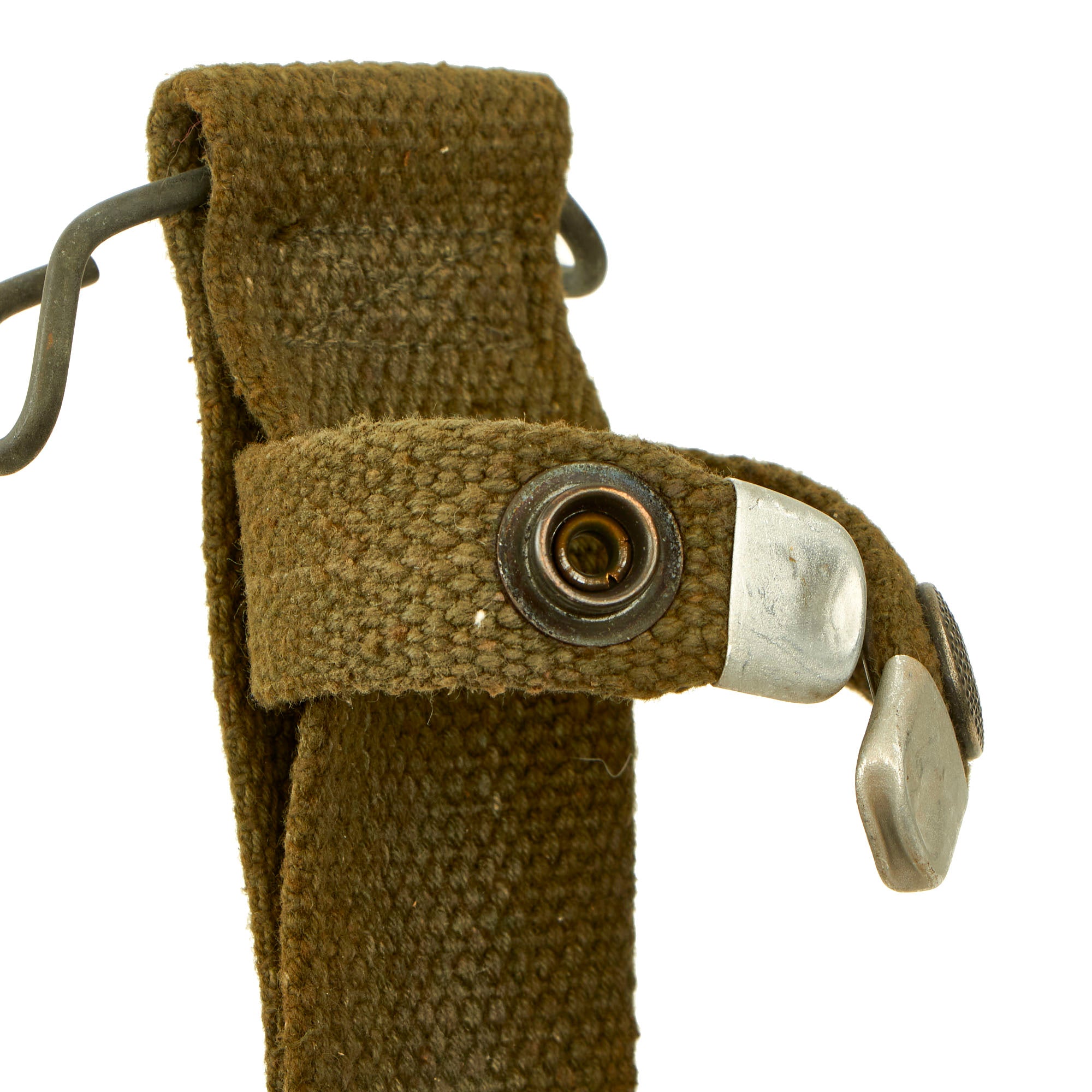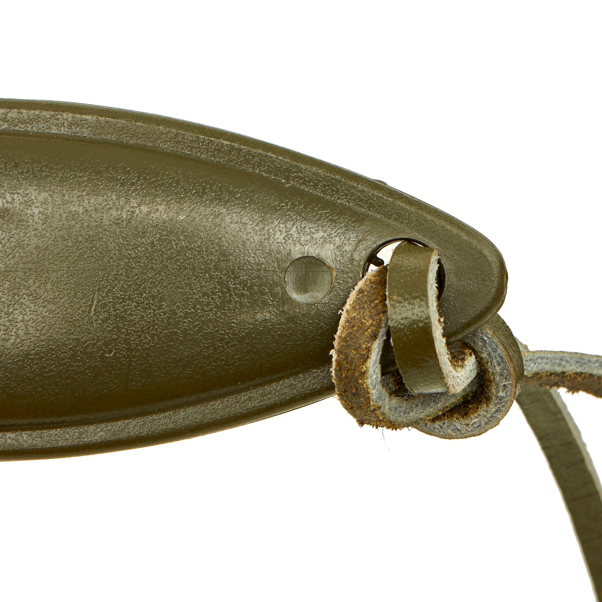 condition. This design features a hard plastic body, metal throat, and canvas frog and securing strap with a steel pistol belt hook. This was manufactured in Germany and even has lovely German pebbled buttons on the securing strap. The condition is pretty much unissued, with just light storage wear.