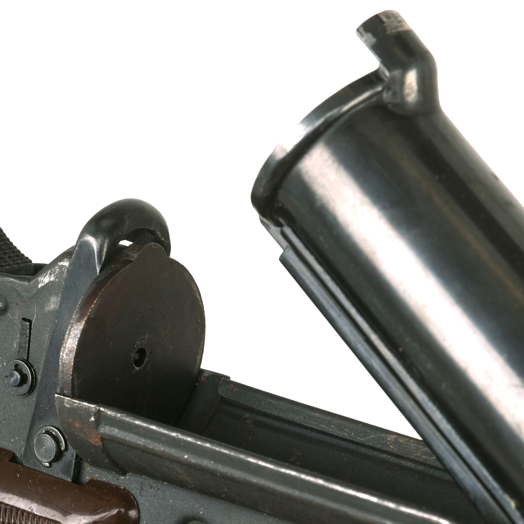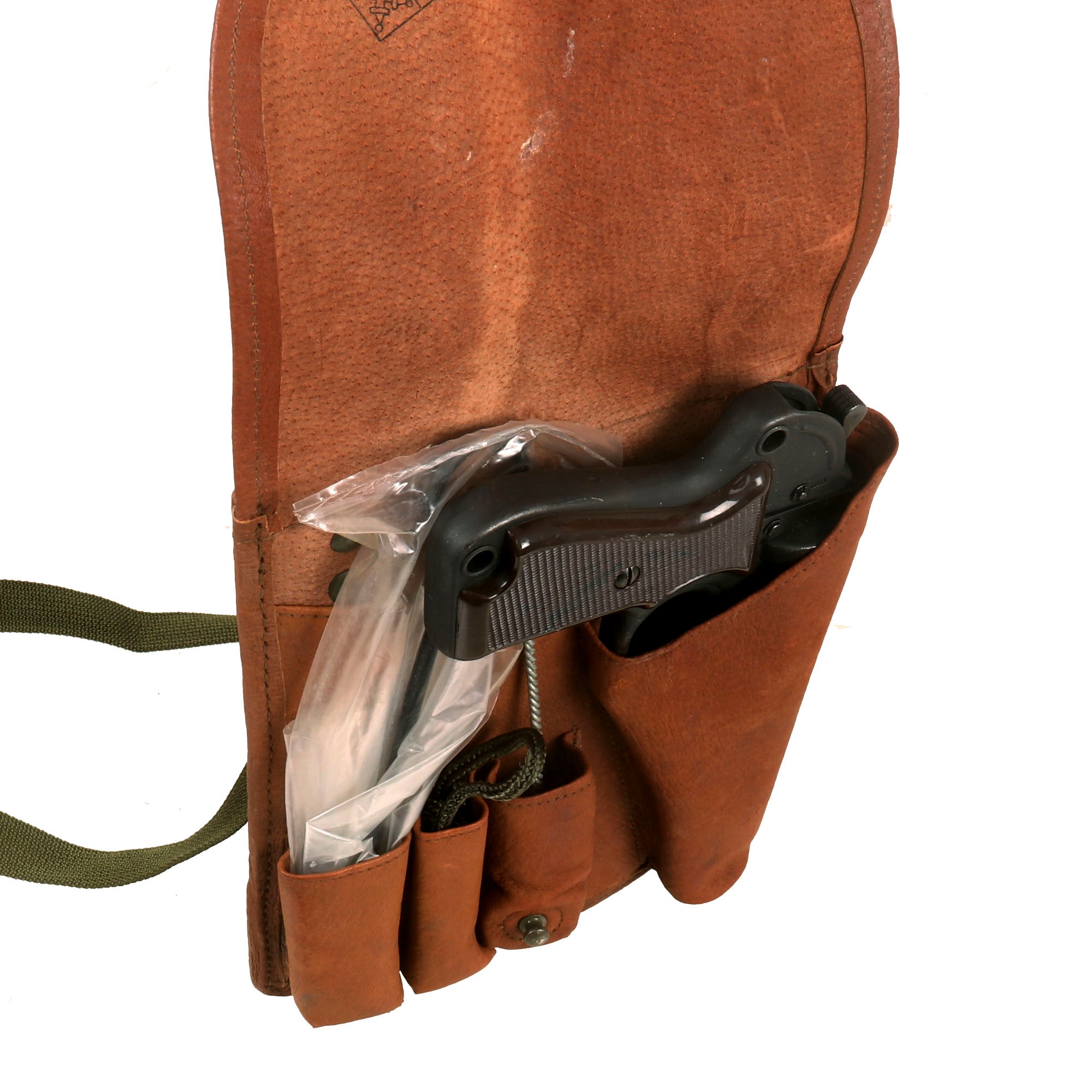 This example comes with its original carrying case/holster which still retains its cleaning rod and tools. The carrying strap is also intact. The pouch has a stamp with crossed swords and is dated 1982.