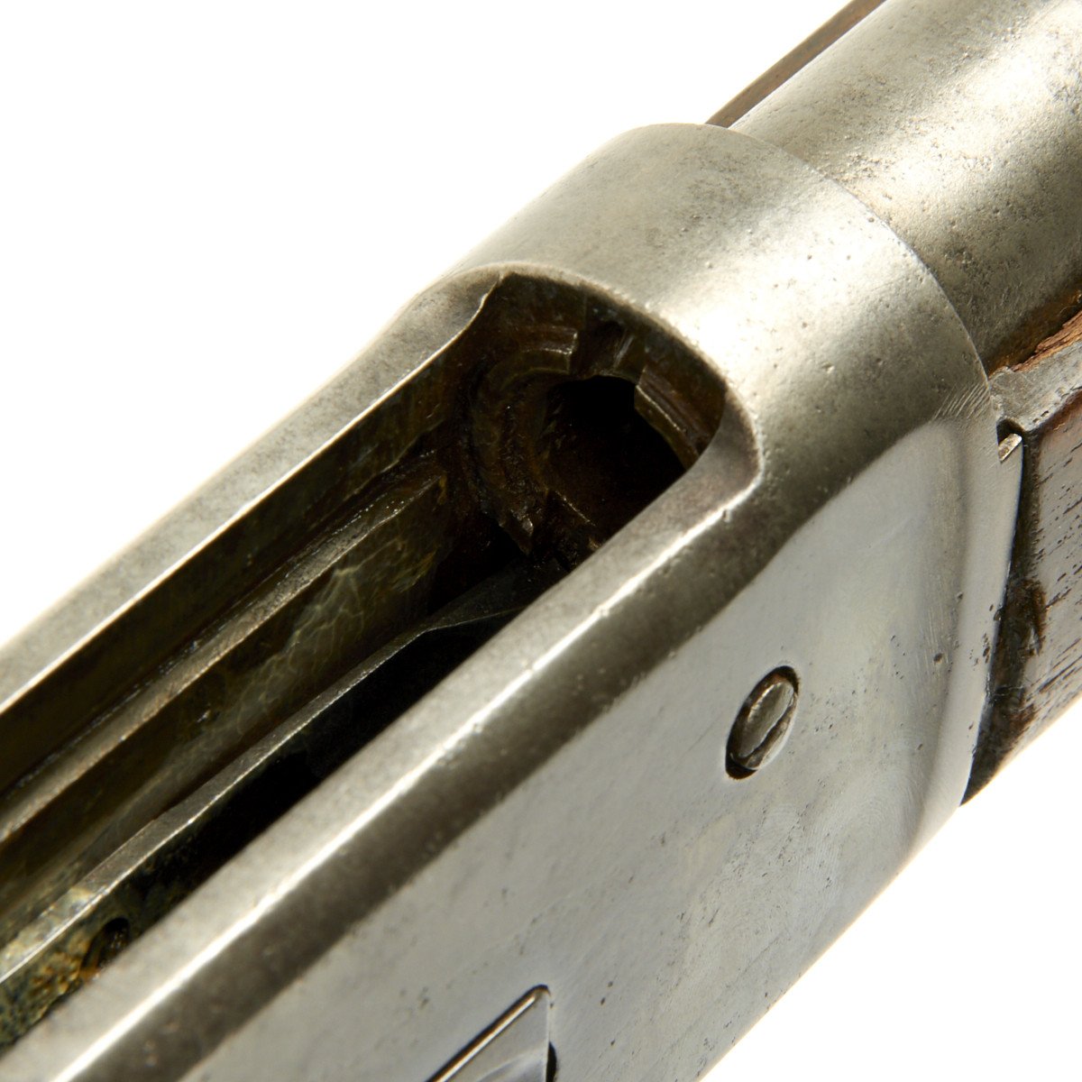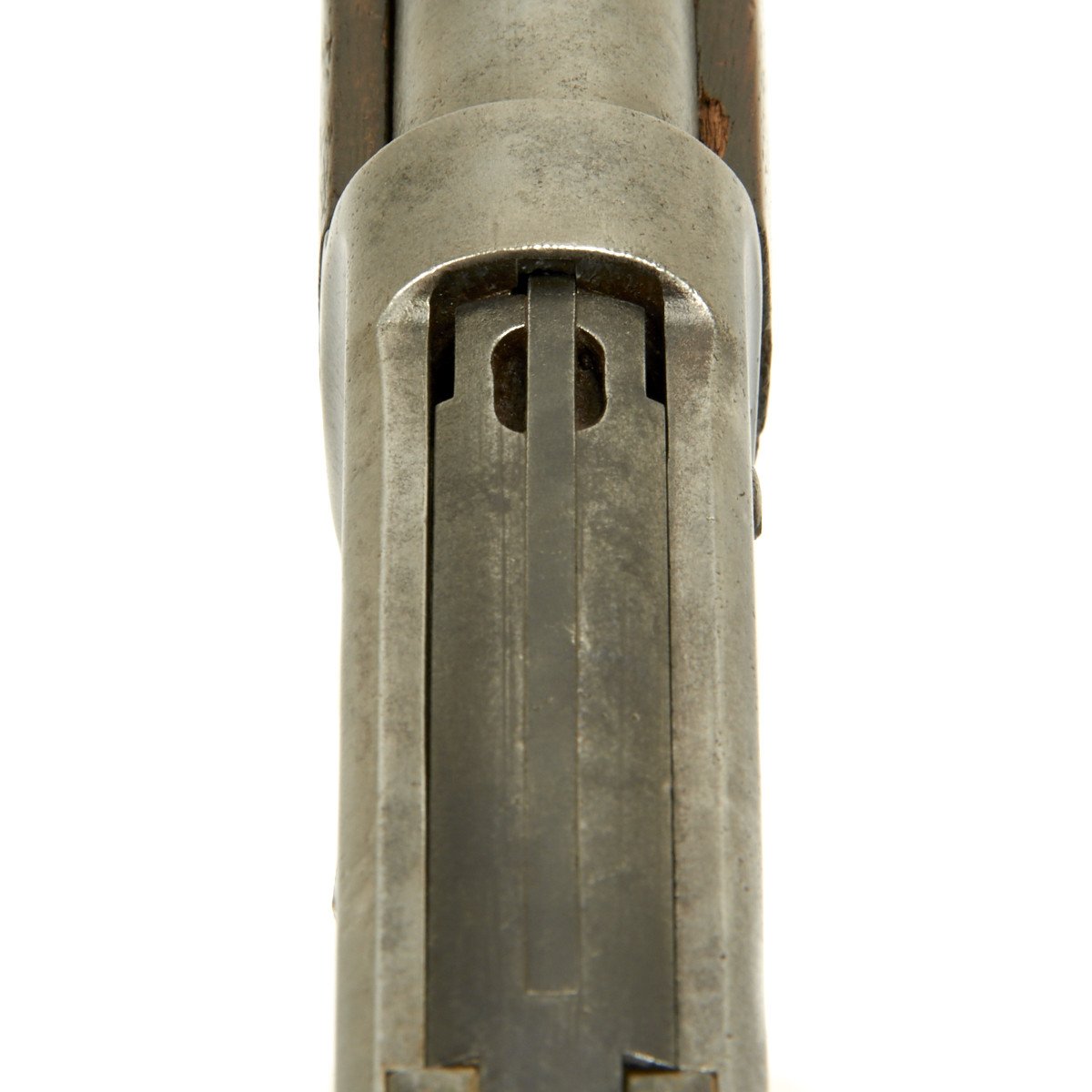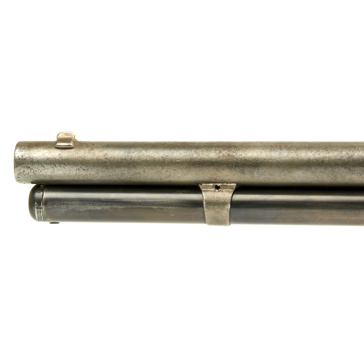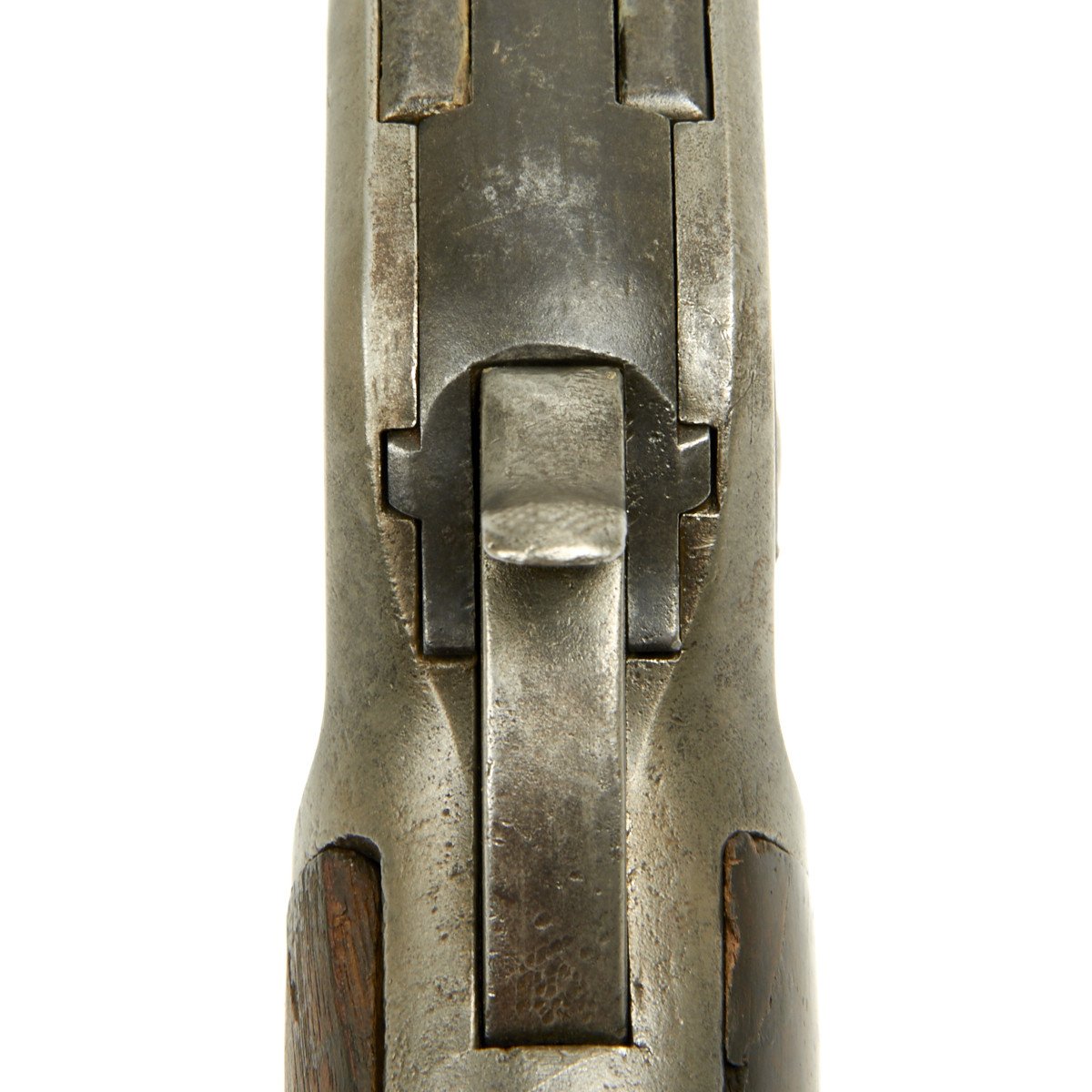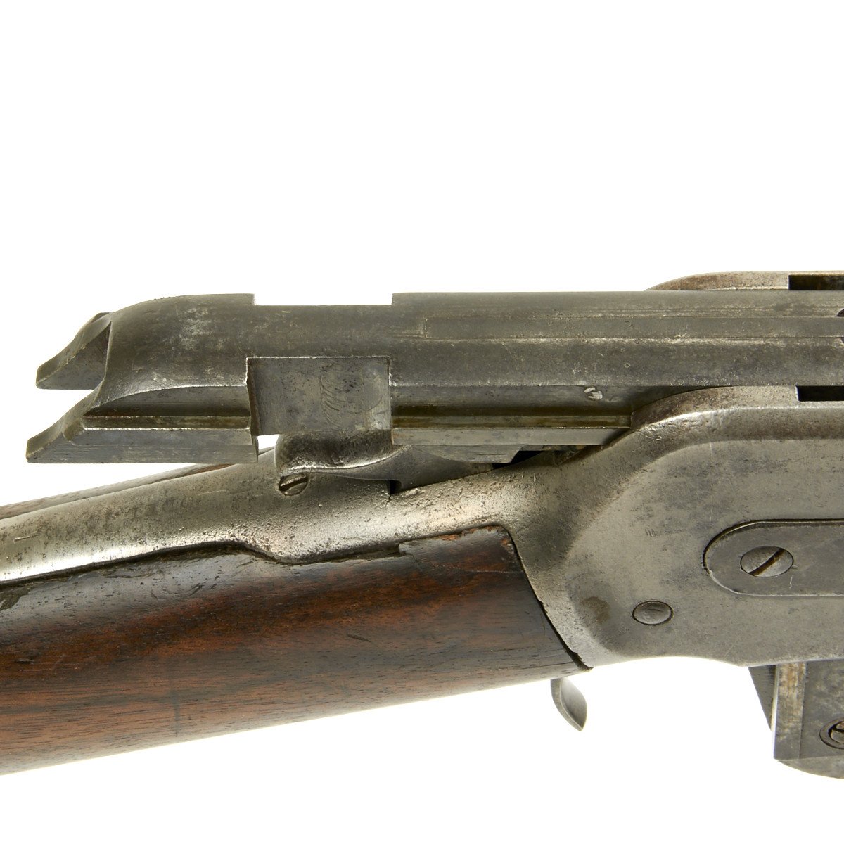 The original sights on the 50 Express are unique to this caliber. The rear sight is what's known as the two-leaf Express sight. This sight would later be used on the smokeless .30 caliber Winchester 1894 rifle and carbine. However, the sight on this example was replaced with a traditional buckhorn style. The front sight is also a special design called the Winchester Express Front Sight.