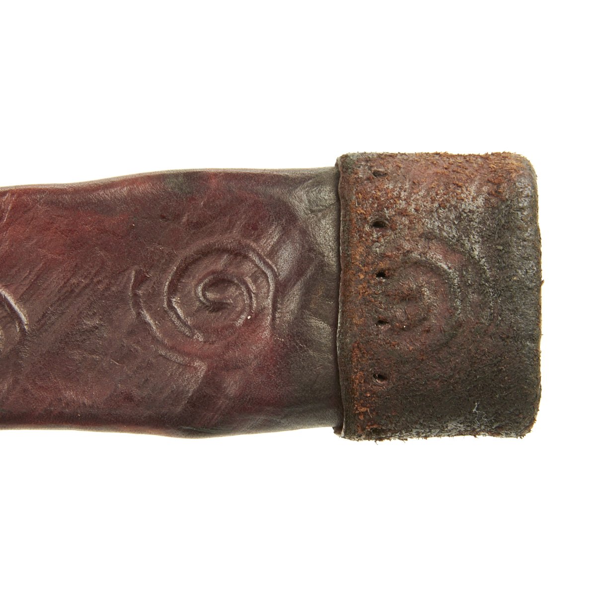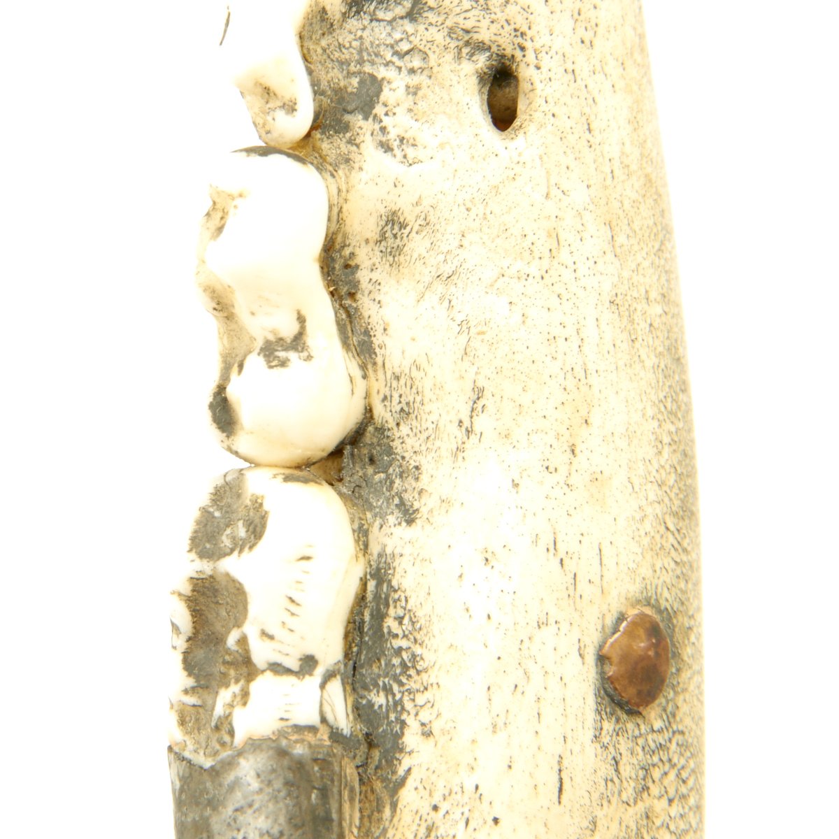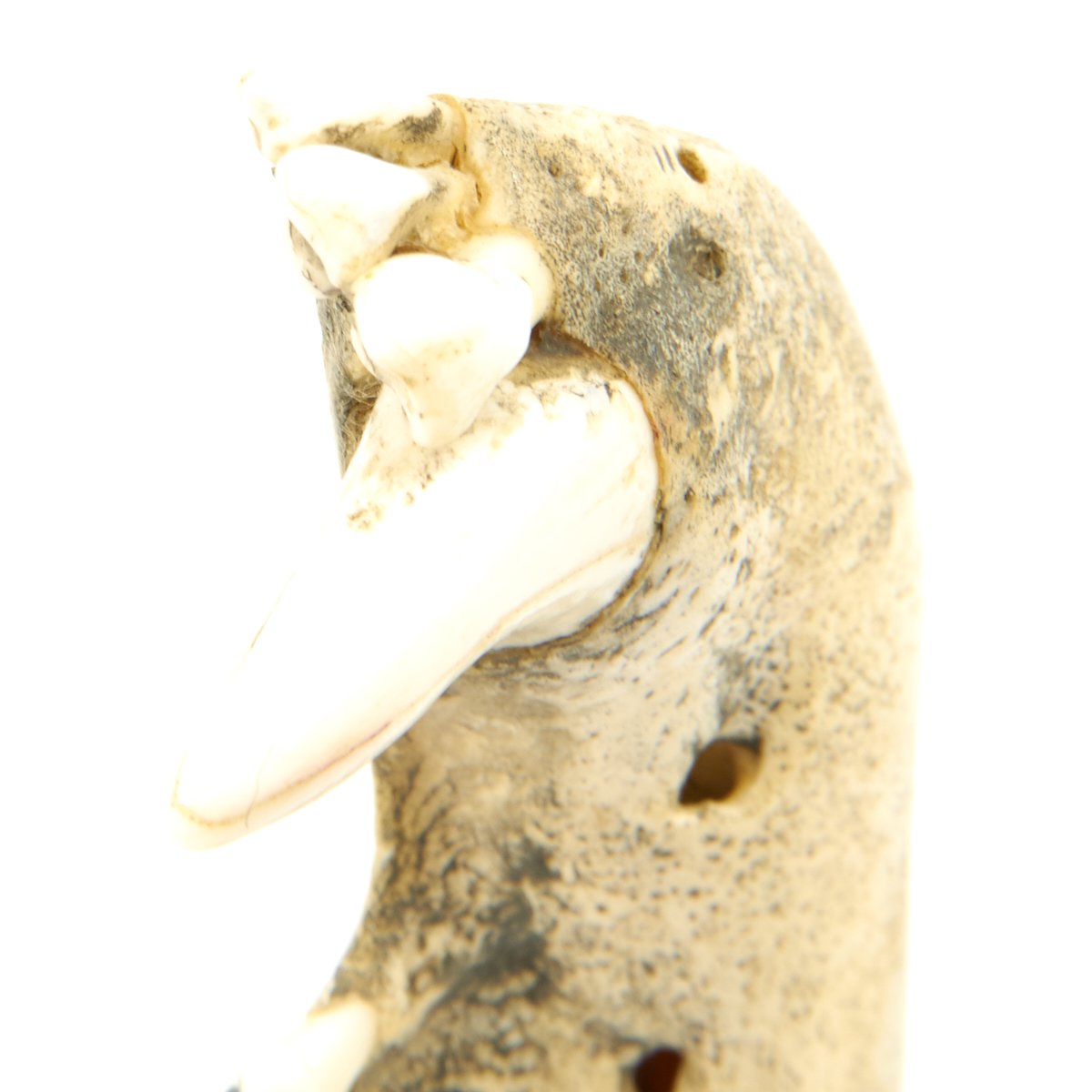 Original Item: One only. This is a very interesting item which appears very old. Constructed from the right hand jawbone of a Wolf, mounted to a 7 1/2" plain blade that is in very good condition, and is still quite sharp. It is contained very nicely in its original tooled leather scabbard, which is embossed with spiral motifs, as well as a snake.