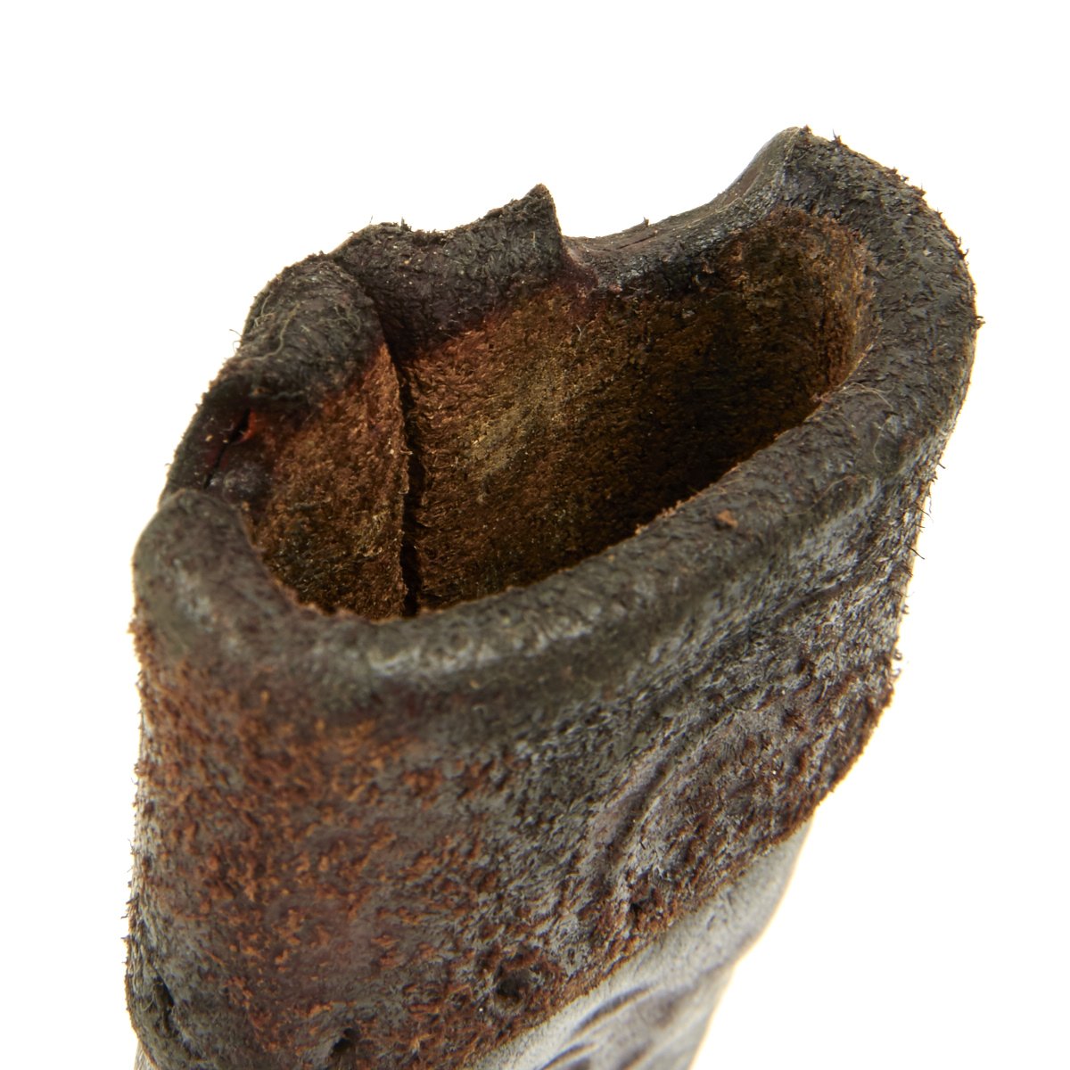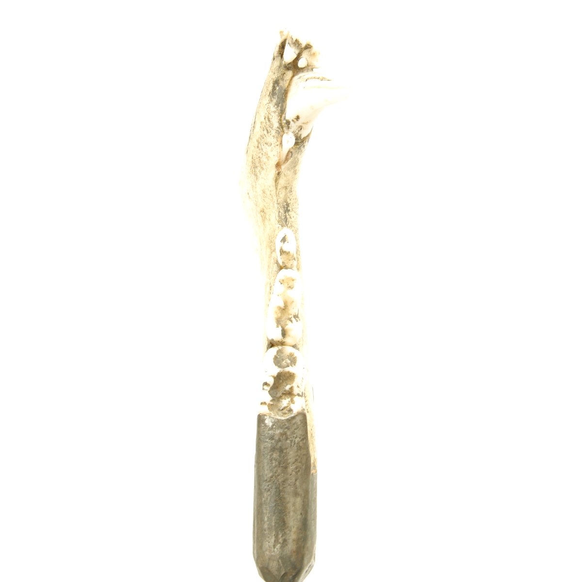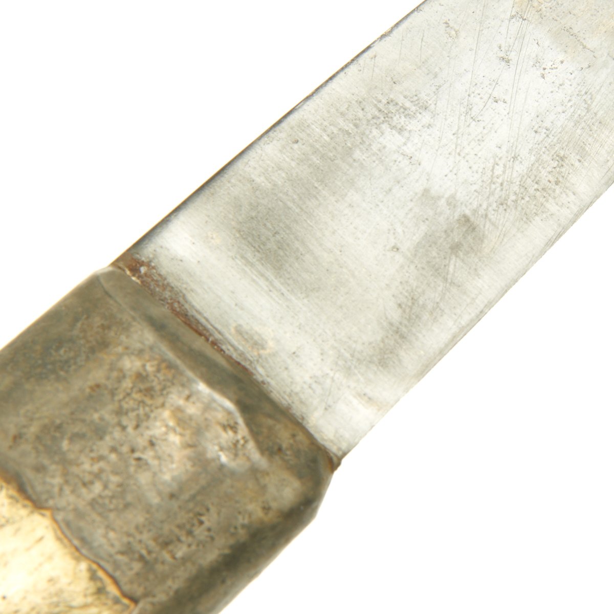Original Item: One only. This is a very interesting item which appears very old. Constructed from the right hand jawbone of a Wolf, mounted to a 7 1/2" plain blade that is in very good condition, and is still quite sharp. It is contained very nicely in its original tooled leather scabbard, which is embossed with spiral motifs, as well as a snake.