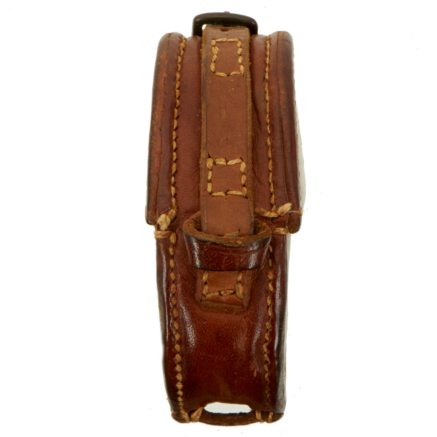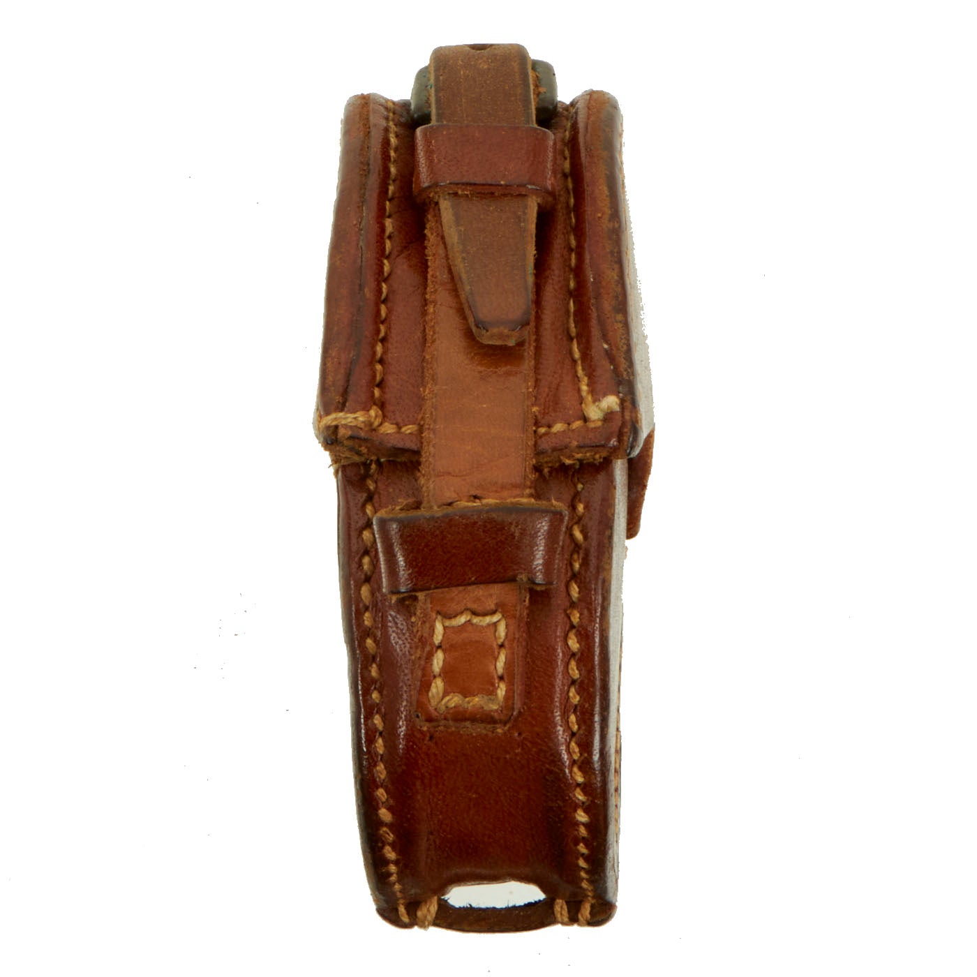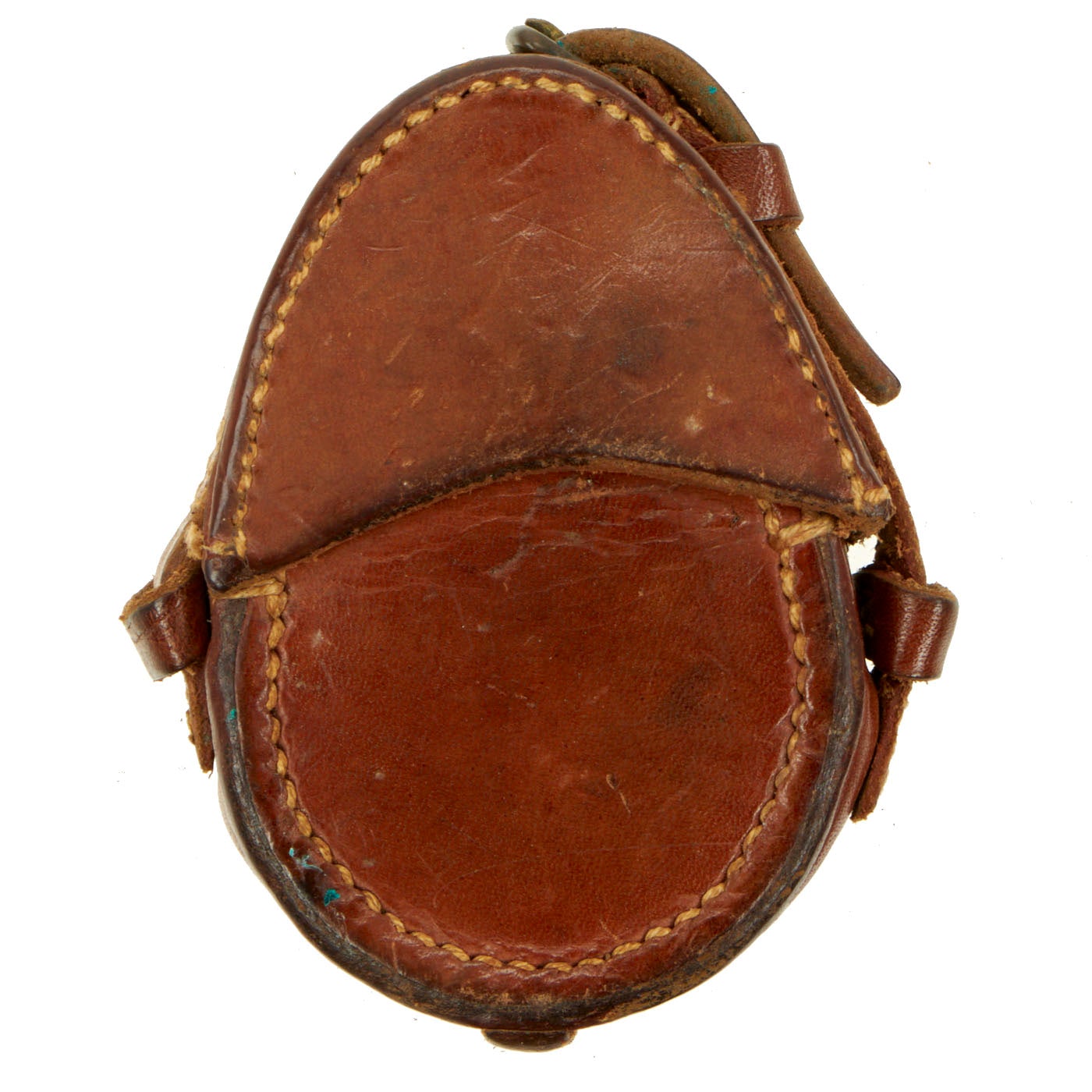 Has the traditional white dial for low light reading with the orange direction arrow intact. The brass lid has a strong hinge and a brass knob on the side for transit locking of the dial. The compass also has a magnifying lens for precise angle calculation (for target engagement). The compass and leather case are in excellent condition.