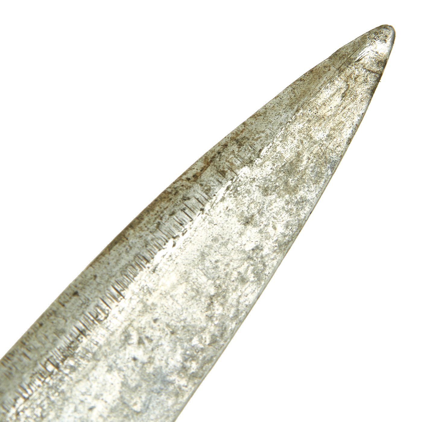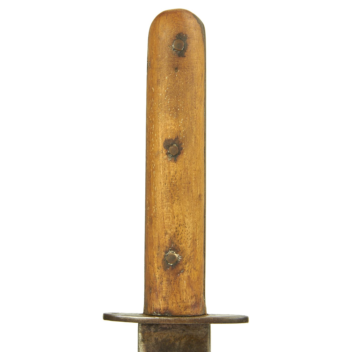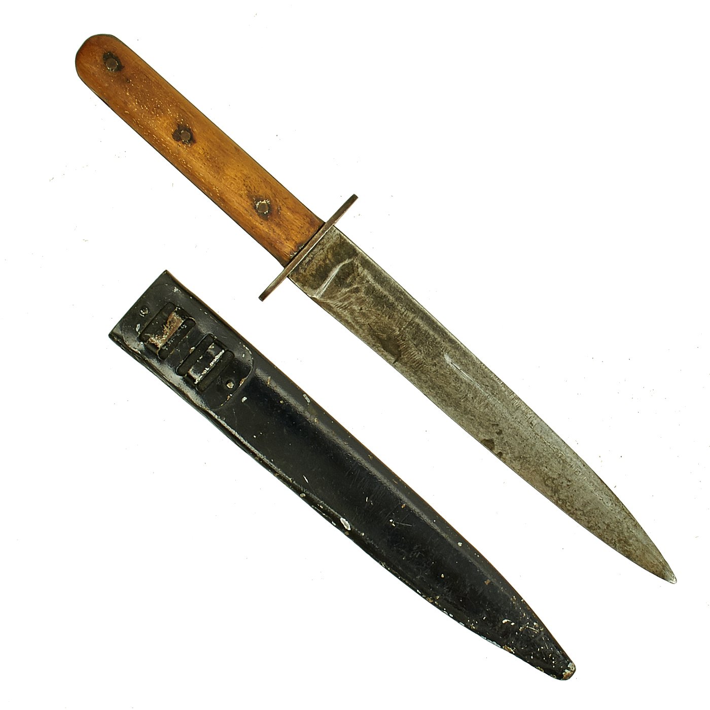 Original Item: One Only. This is an very nice example of the rare World War One Austrian Hungarian Empire fighting knife. This example has a 8 inch steel blade blade with wood grip and steel cross guard, and comes complete with correct steel scabbard and belt clip. The knife is 12 3/4 inches in overall length.