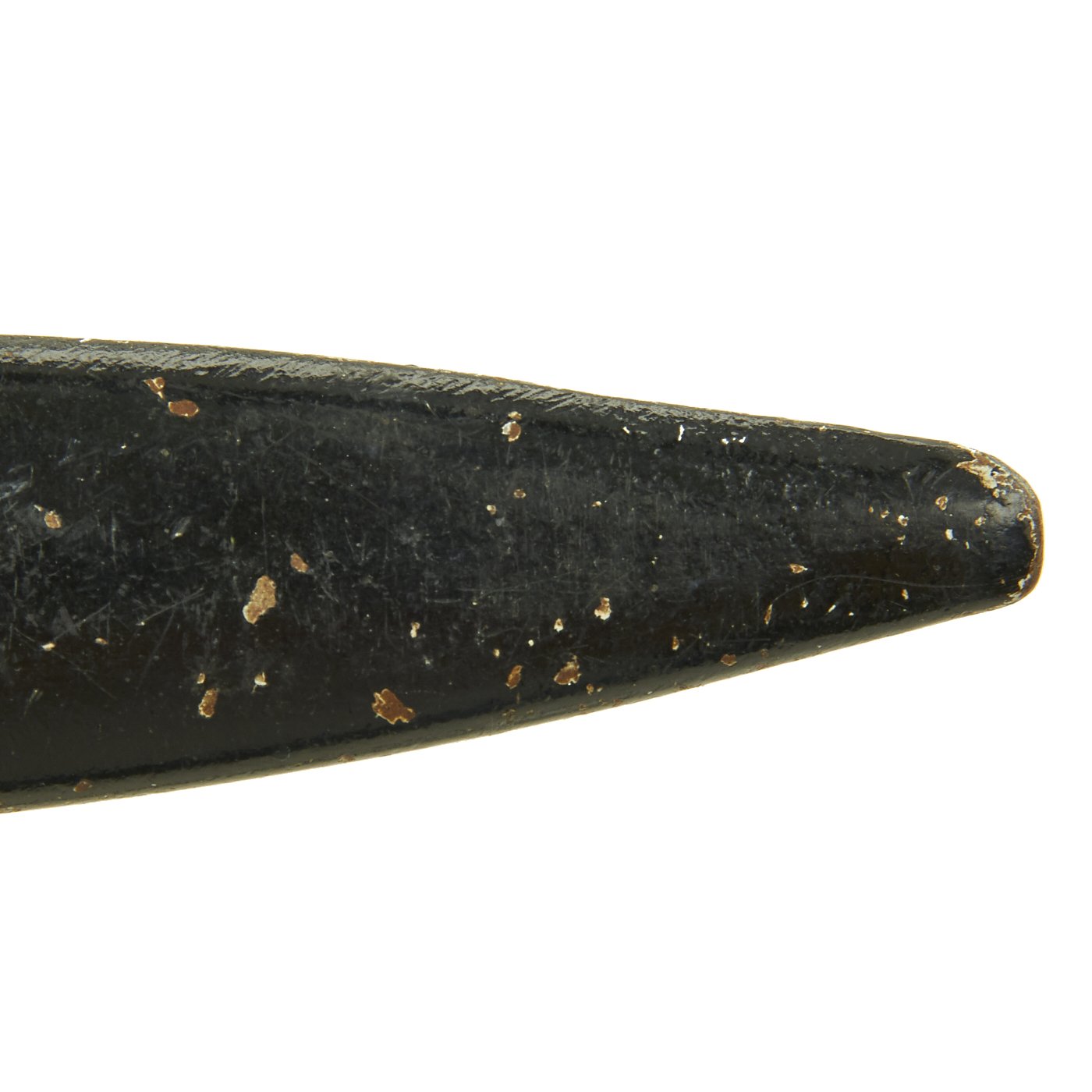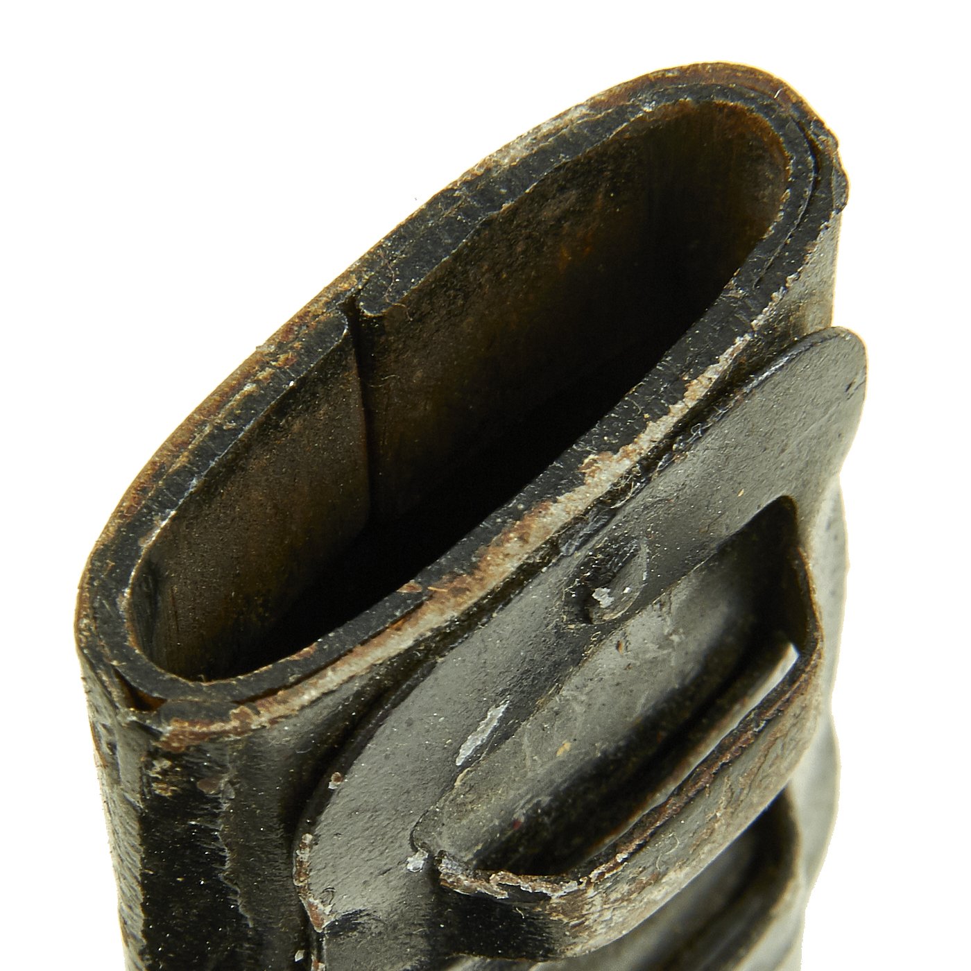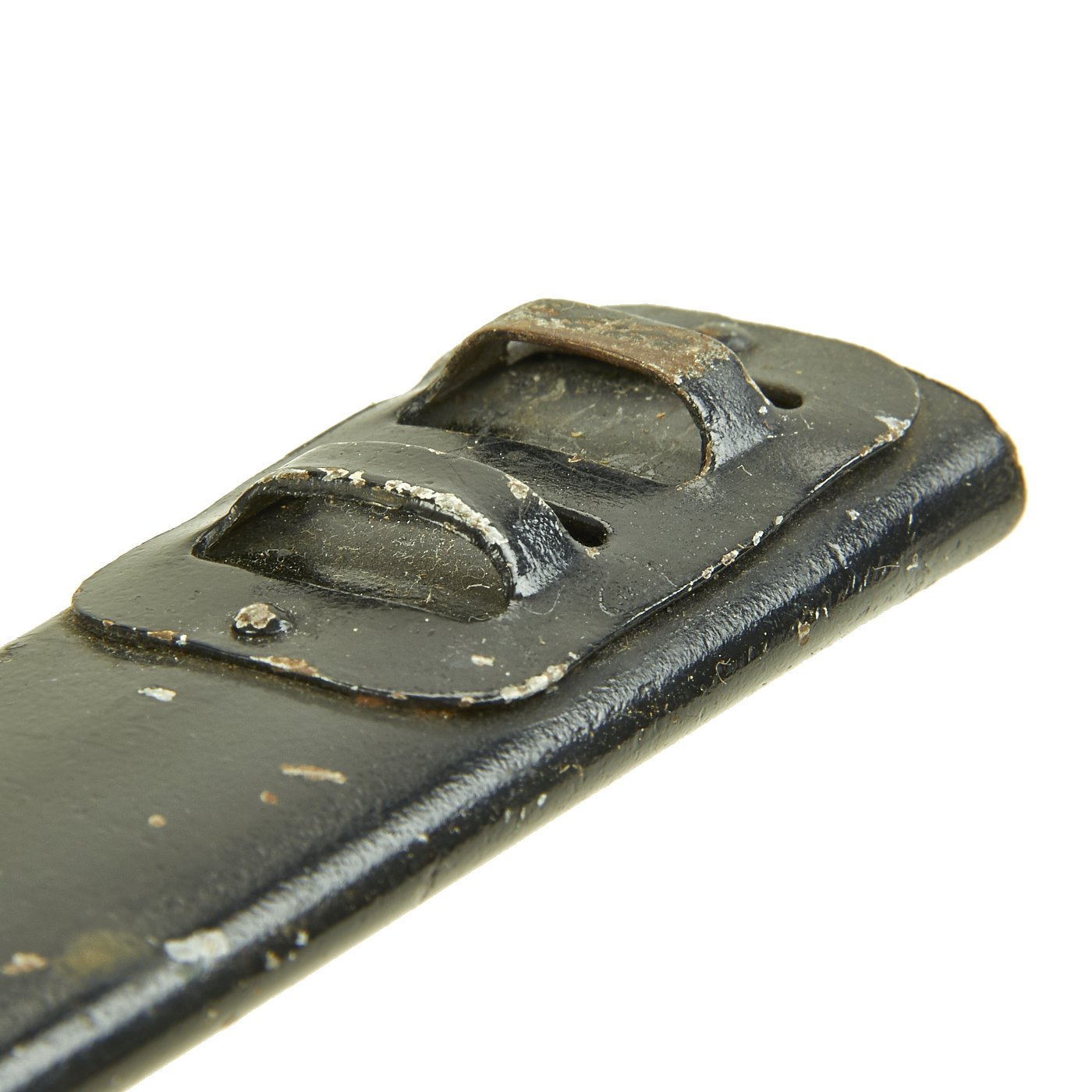 Steel painted scabbard is in good condition, with wear and some small dents. It does not appear to have been repainted, and has more than 95% of the original finish. The original belt clip with securing sleeve is still intact works well, something not often seen. Knife fits well in the scabbard.