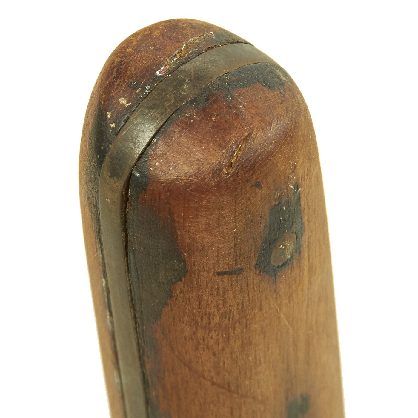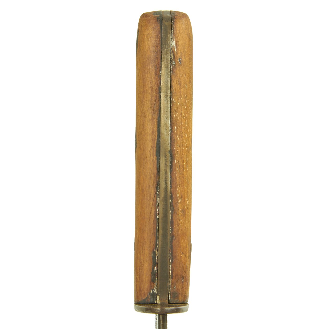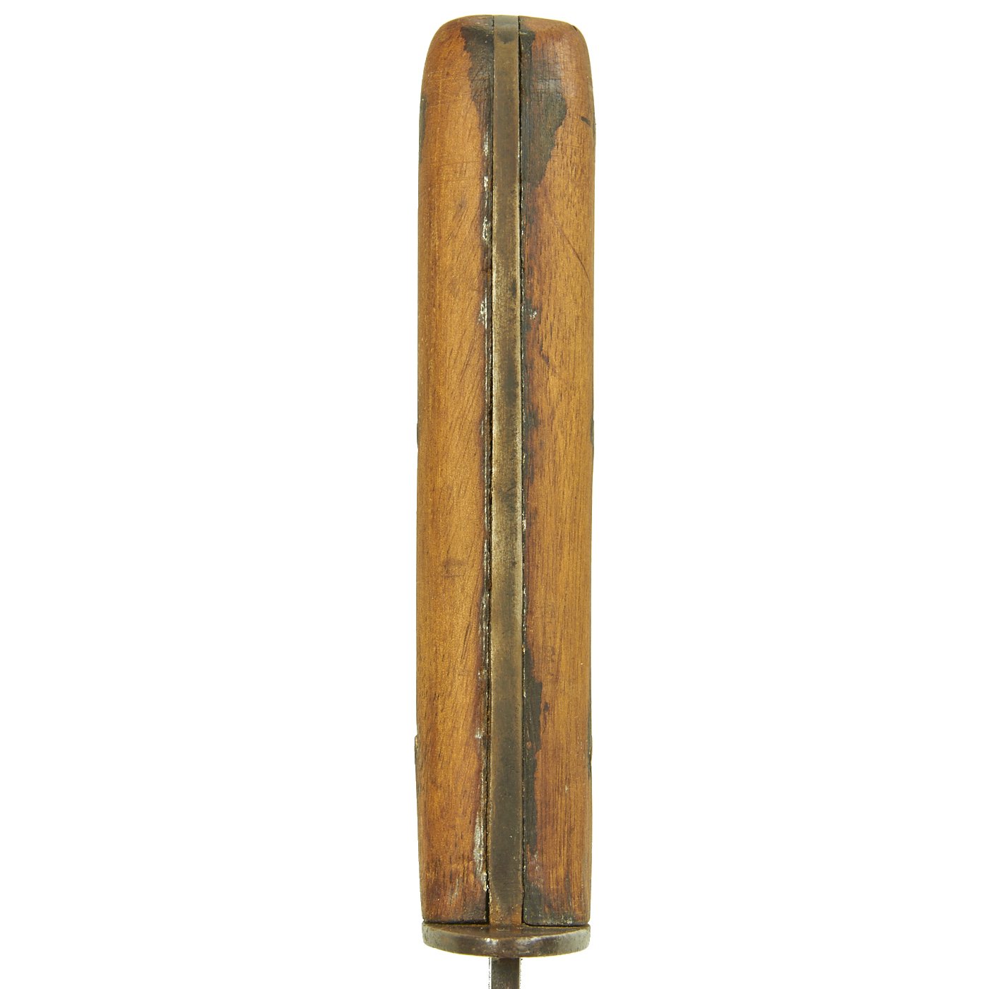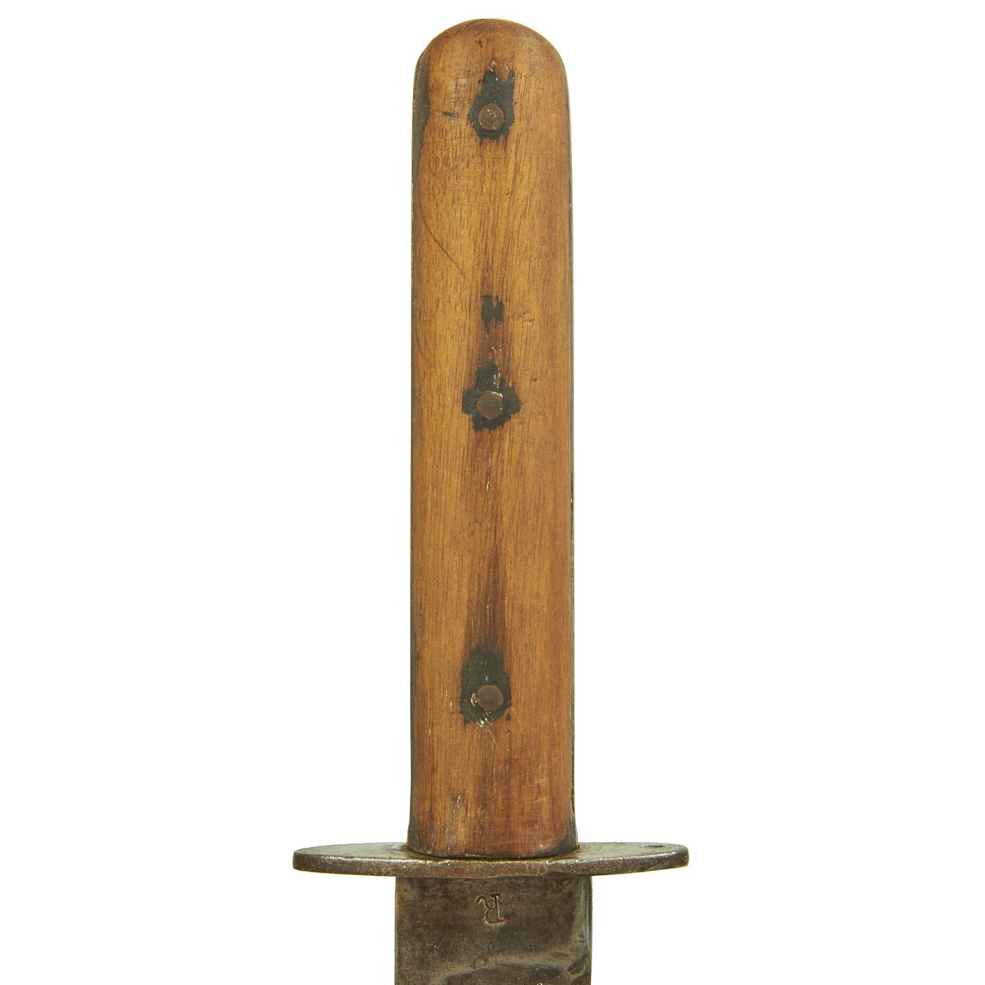 The condition of the knife is very good, with the expected wear from service and sharpening. There is some light oxidation on the ricasso ( which is stamped R ) and cross guard, as well as a bit on the blade, but nothing major. There are some slight crossgrain scratches on the blade as well. The wooden grip is in excellent condition, with only some small dents and no cracks, splits, or chunks missing.