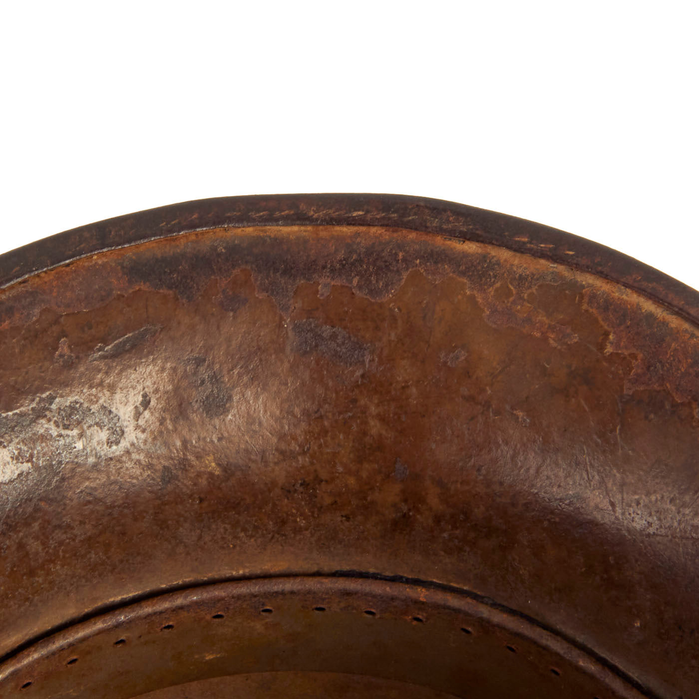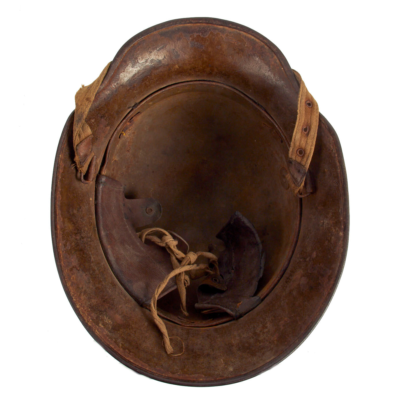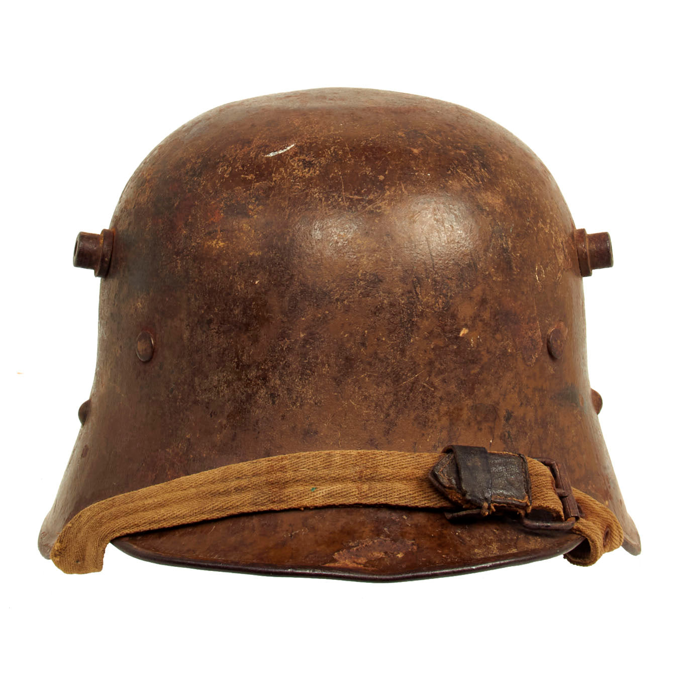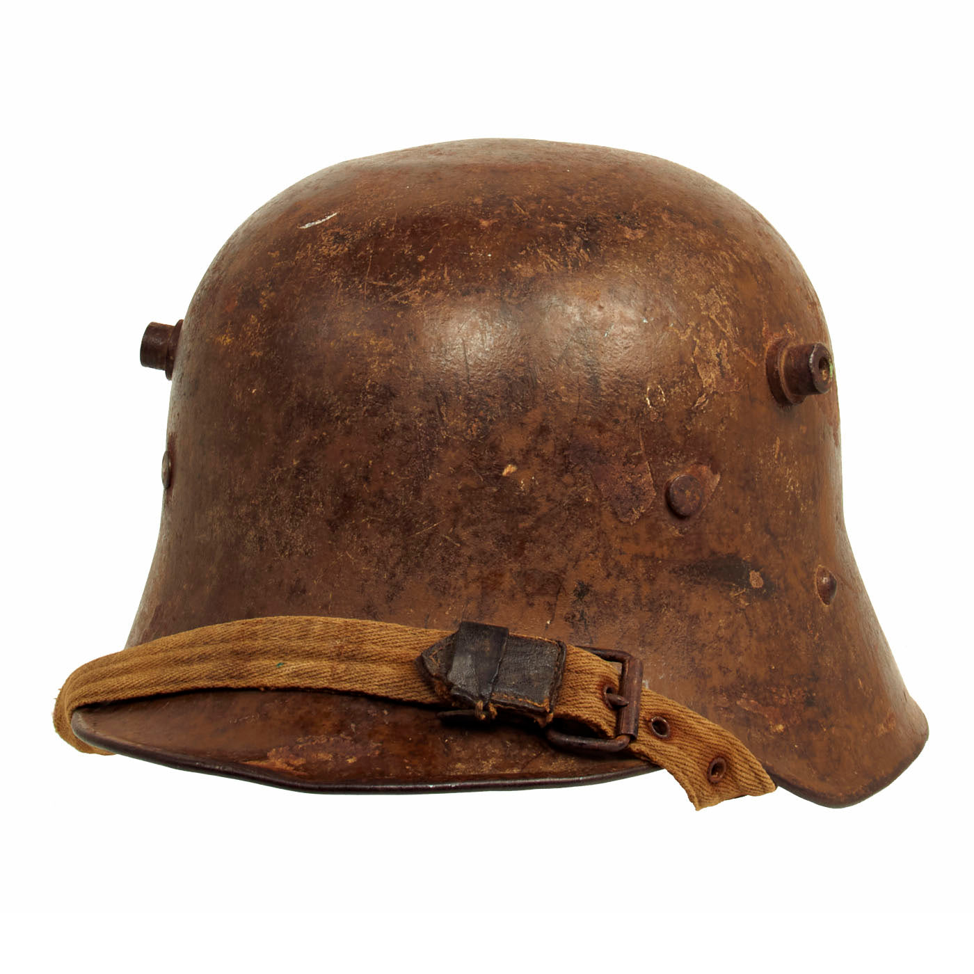 Original Item: Only One Available. This is a very good condition Genuine WWI Austro-Hungarian Model 1917 helmet with an original standard Olive Green / Brown "Isonzo braun" paint. The paint is well retained, something we do not often see, as many of these helmets were repainted during the war or after. The helmet is missing some of the liner as shown, which has deteriorated as well. It also has a complete canvas chin strap, which has slightly deteriorated. All three liner split pins are intact, with the correct thicker pin in the rear.