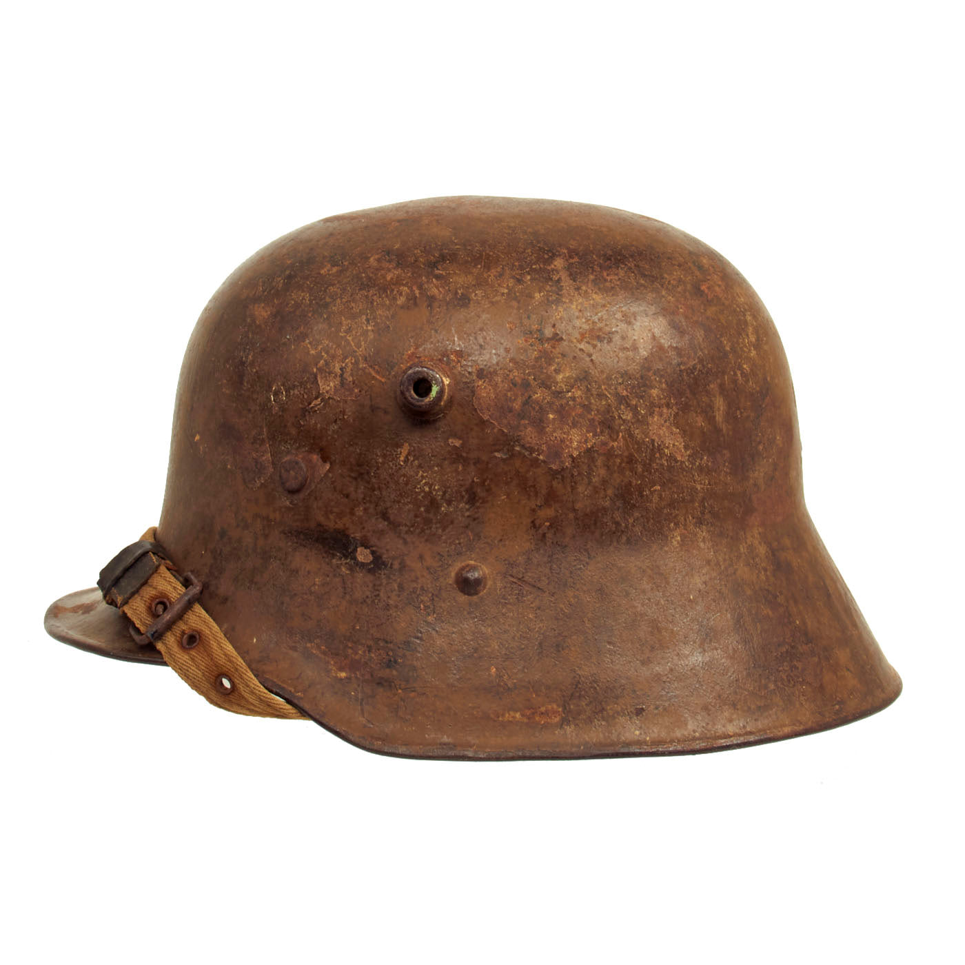 Early Austrian helmets were supplied by Germany, the first shells supplied as the chinstrap rivets were mounted in a lower position. The Austrians fitted their own chinstrap bales, chinstraps and liner and painted them in Austrian Isonzo braun. These modifications were carried out with German machinery at the"Adolf Westen di Cilli factory, which is now Celije, in Slovenia.