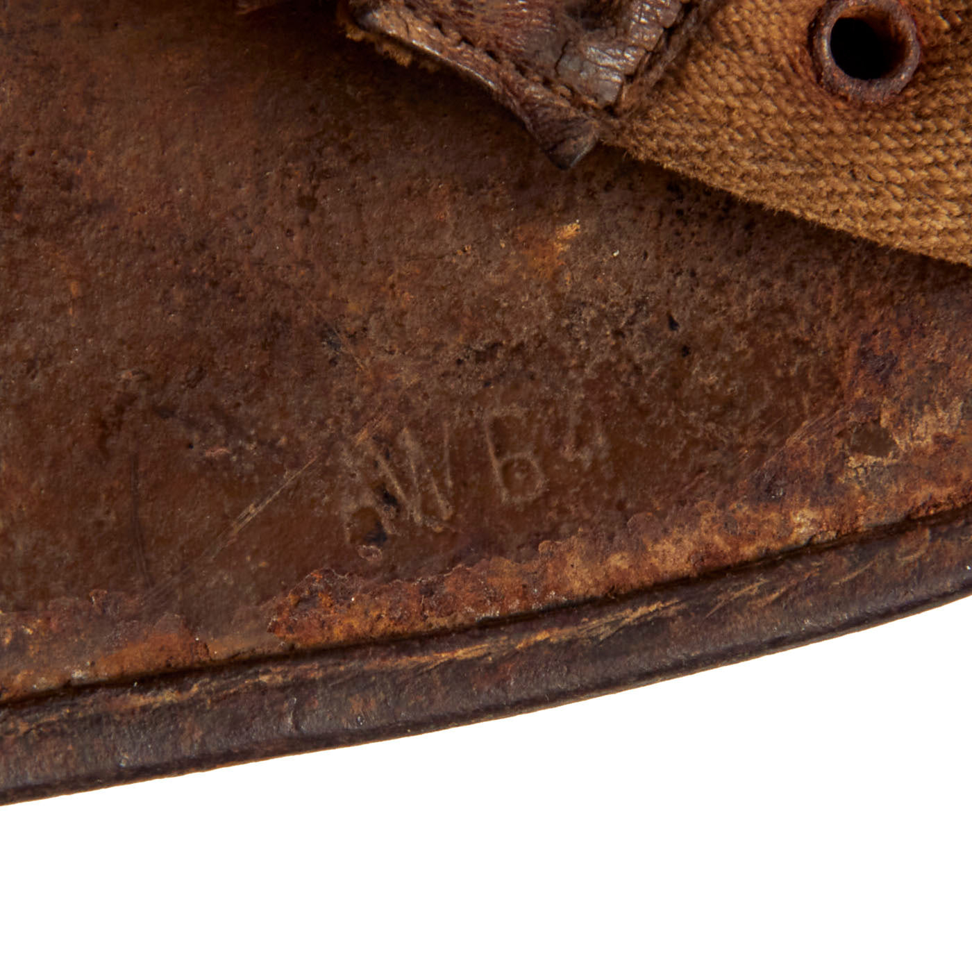 Above the left ear interior of the apron of the shell has a stamped manufacturer's code and size AW 64, which indicates manufacture by A. Westen Cilli, located in Celie, Slovenia. This company produced shells in size 64 only during WWI. Size 64 is a medium size shell, which can accommodate size 56-58 liners. This size is somewhat harder to find, and more desirable to collectors.