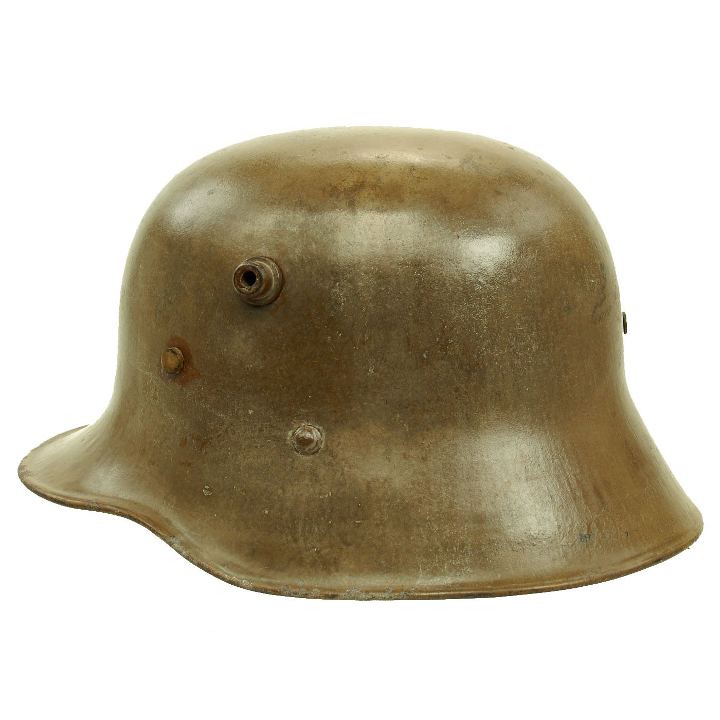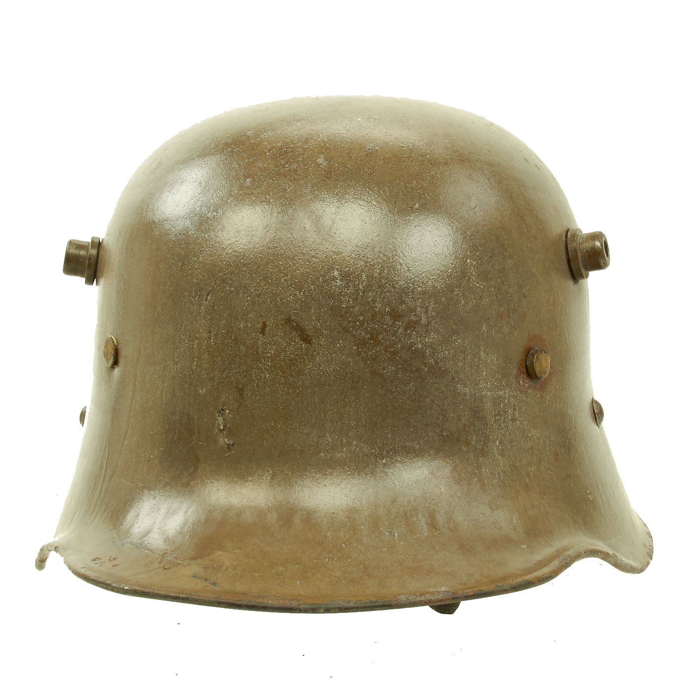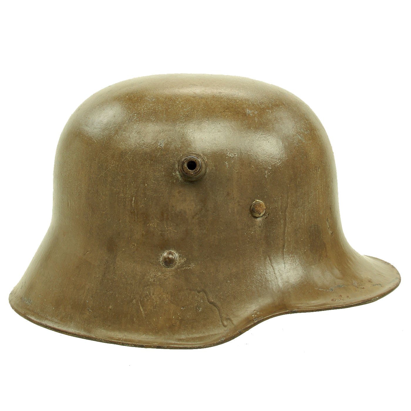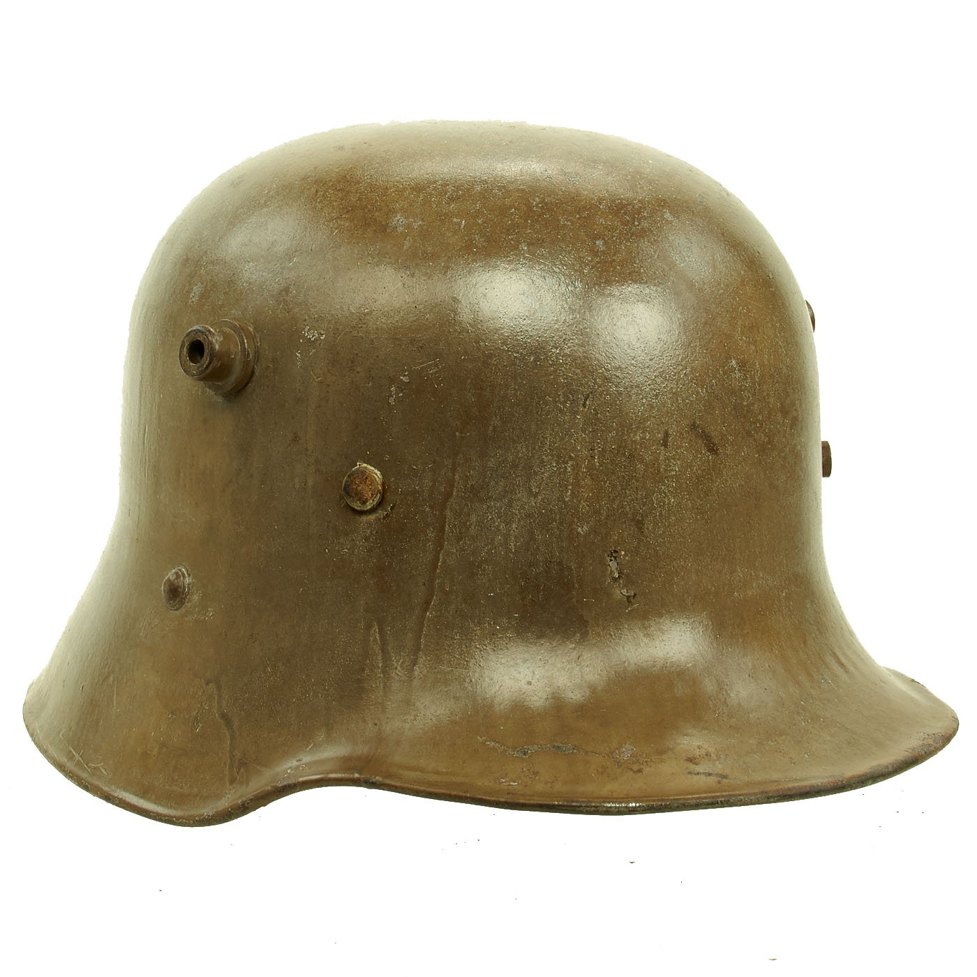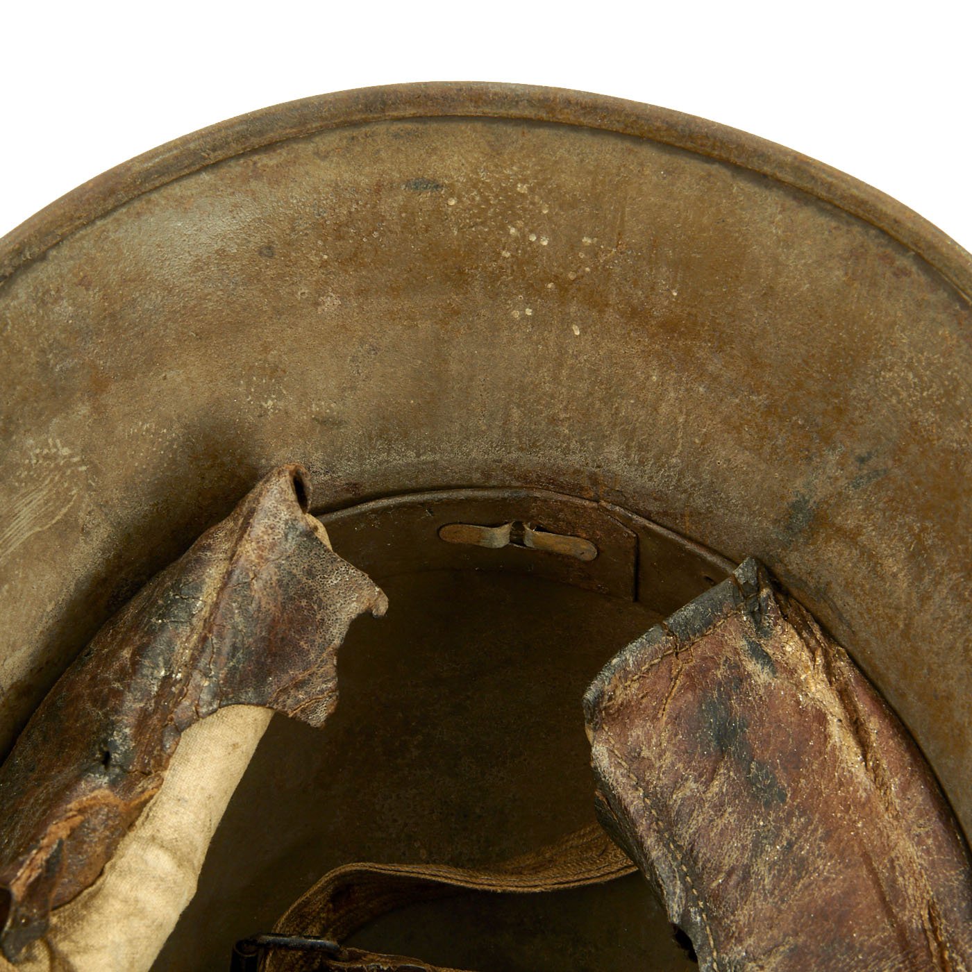 Original Item: Only One Available. This is a very good condition Genuine WWI Austro-Hungarian Model 1917 helmet with an original standard Olive Green / Brown "Isonzo braun" paint. The paint is well retained, something we do not often see, as many of these helmets were repainted during the war or after. The helmet is missing some of the liner as shown, which is deteriorated as well, however there is for some reason an extra horse-hair pad included. It also has a complete canvas chin strap with a working buckle, which just has a few small tears. All three liner split pins are intact, though for some reason the thicker rear split pin has been moved to the front left.