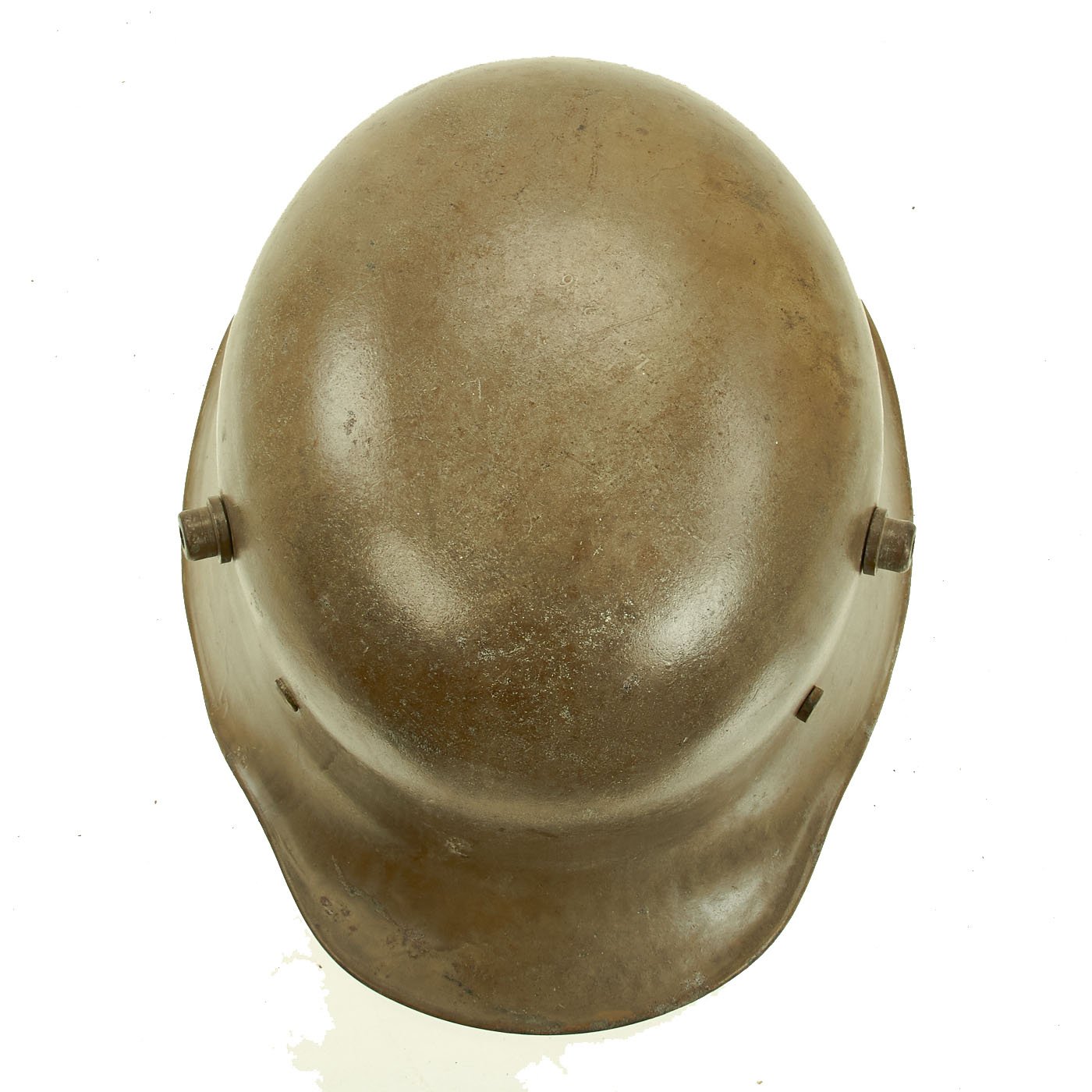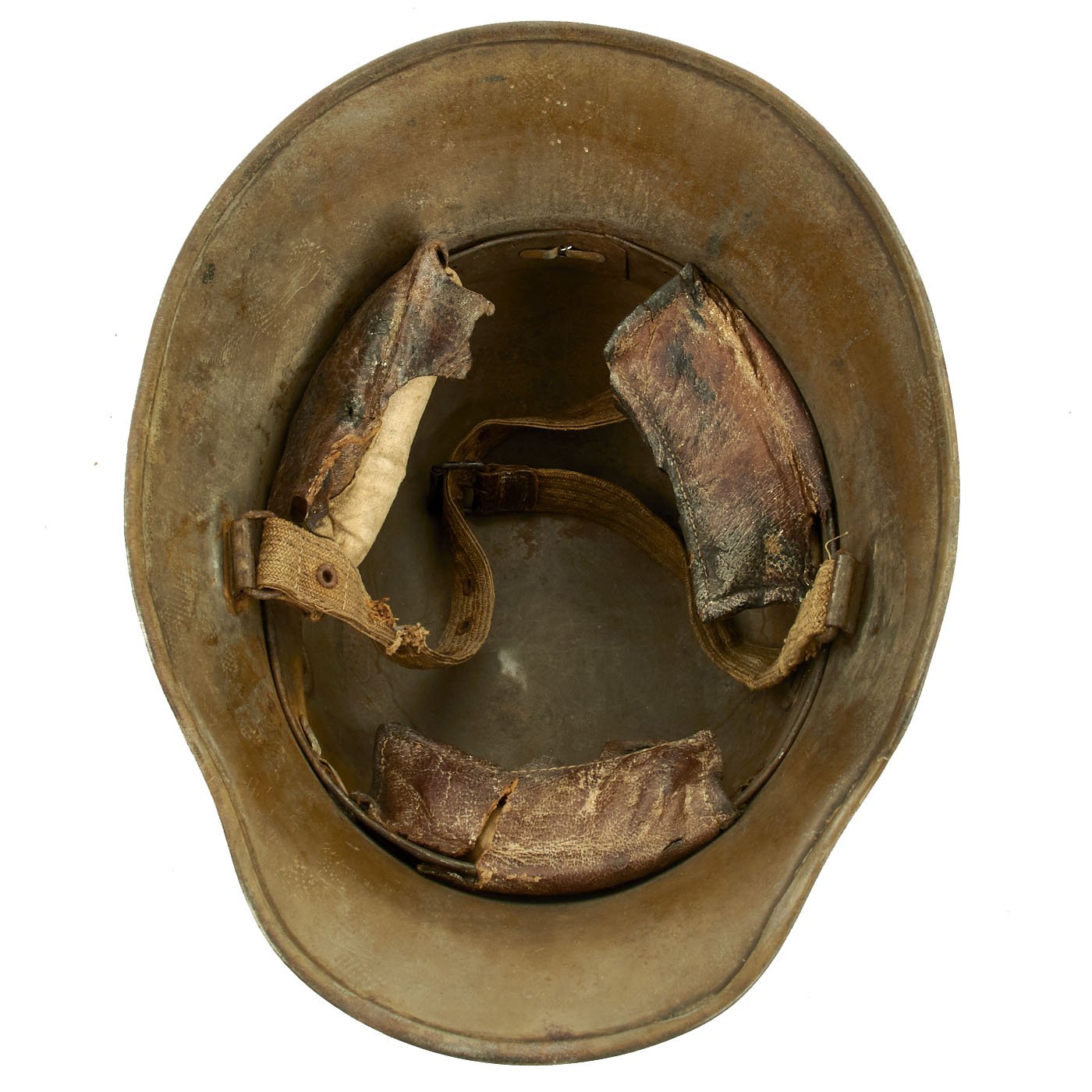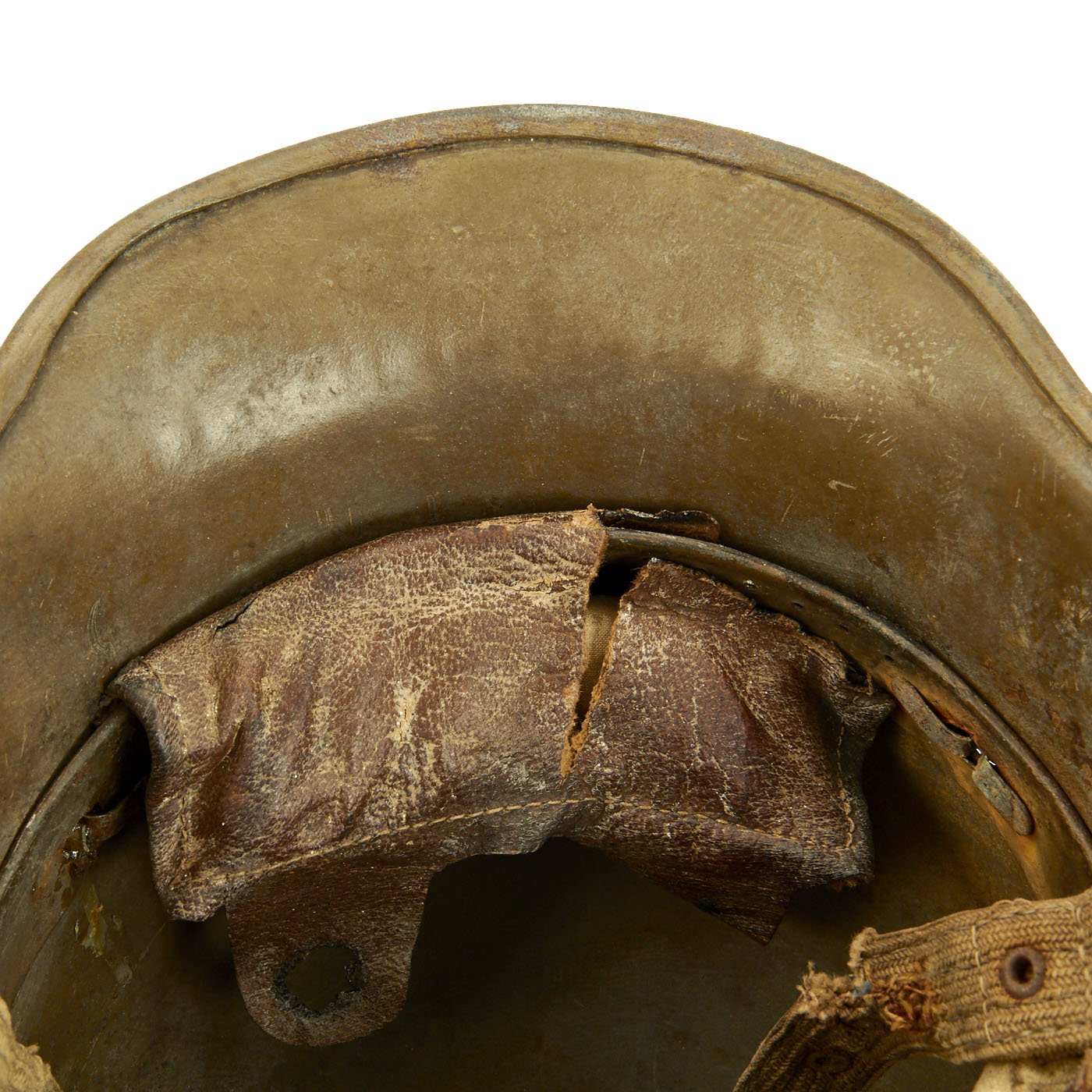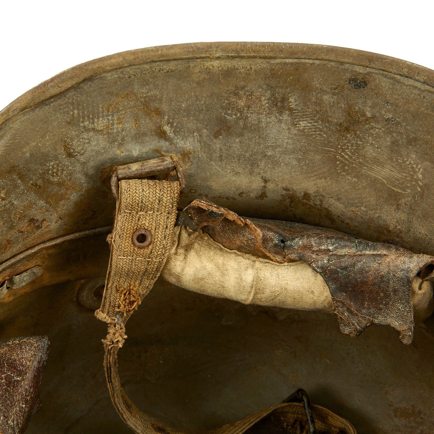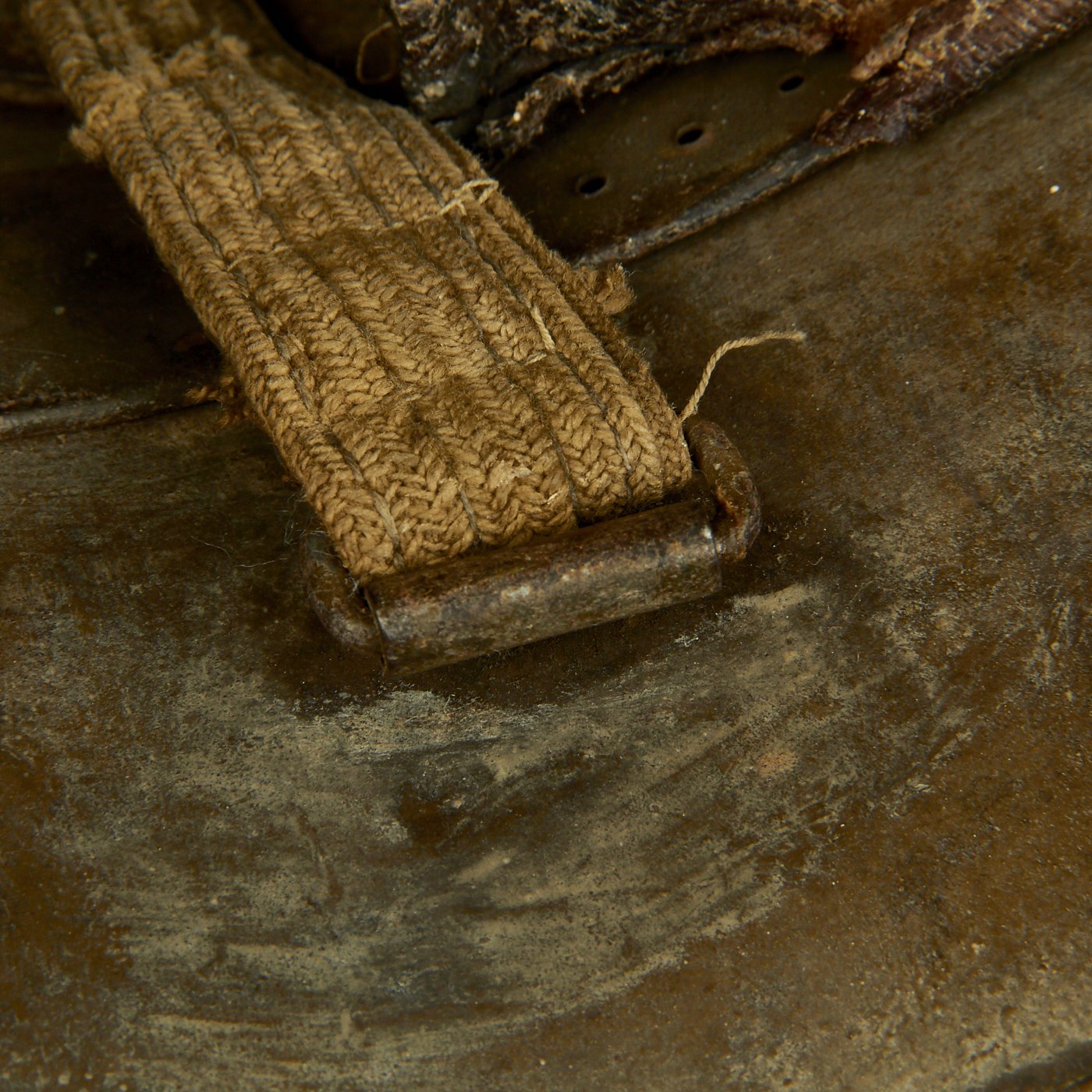Original Item: Only One Available. This is a very good condition Genuine WWI Austro-Hungarian Model 1917 helmet with an original standard Olive Green / Brown "Isonzo braun" paint. The paint is well retained, something we do not often see, as many of these helmets were repainted during the war or after. The helmet is missing some of the liner as shown, which is deteriorated as well, however there is for some reason an extra horse-hair pad included. It also has a complete canvas chin strap with a working buckle, which just has a few small tears. All three liner split pins are intact, though for some reason the thicker rear split pin has been moved to the front left.