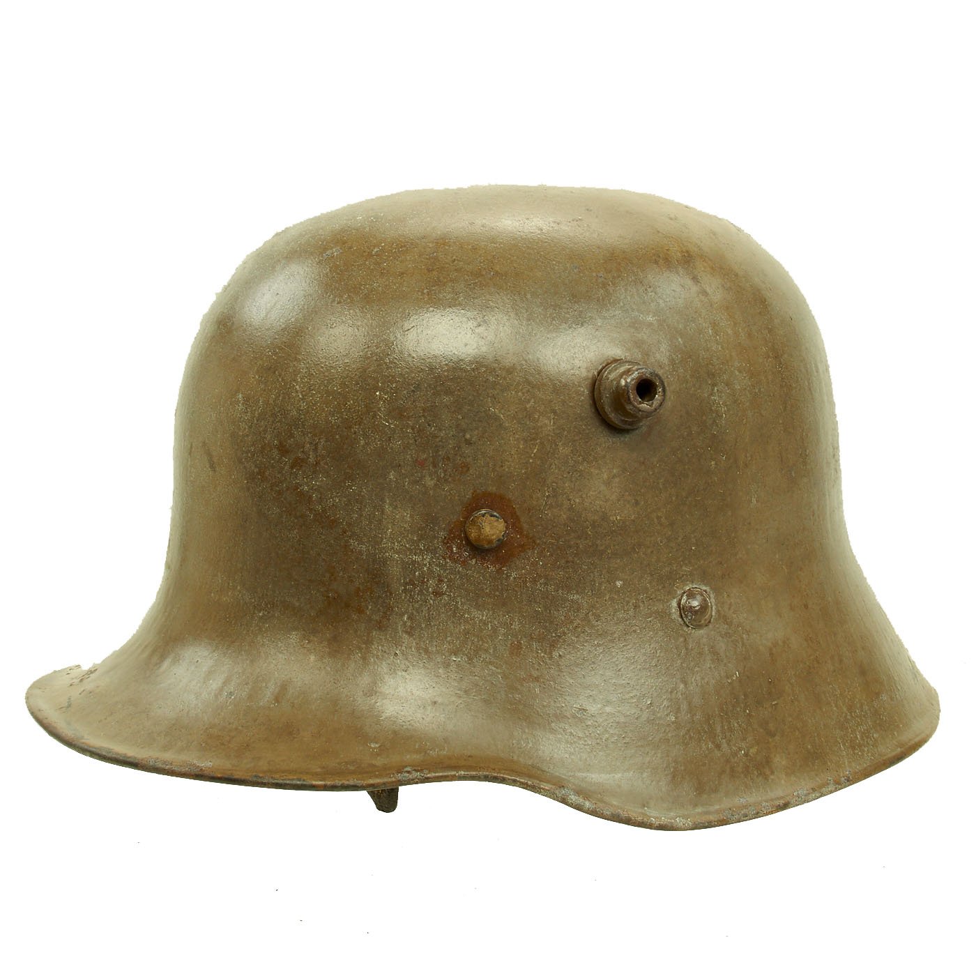 Early Austrian helmets were supplied by Germany, the first shells supplied as the chinstrap rivets were mounted in a lower position. The Austrians fitted their own chinstrap bales, chinstraps and liner and painted them in Austrian Isonzo braun. These modifications were carried out with German machinery at the"Adolf Westen di Cilli factory, which is now Celije, in Slovenia.