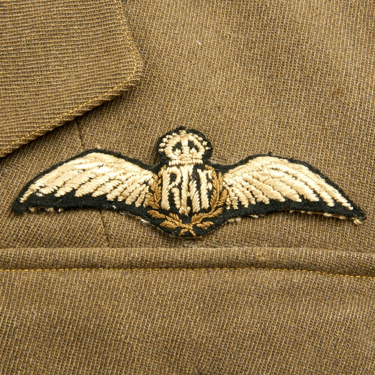 This example offered in truly exceptional condition features first generation RAF brass buttons, leather sleeve cuffs, lace sleeve rank of Lieutenant, with brass eagle and crown and wonderful embroidered RAF wings stitched to the left breast. The maker label in the tunic reads:
